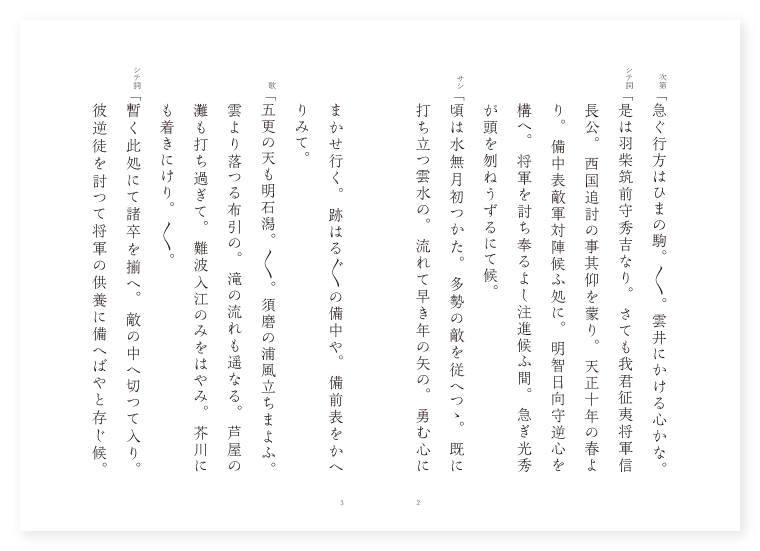 シテ 羽柴秀吉 トモ 従者 ワキ 明智光秀 所 京 時 六月 次第「急ぐ行方はひまの駒。〳〵。雲井にかける心かな。 シテ詞「是は羽柴筑前守秀吉なり。さても我君征夷将軍信長公。西国追討の事其仰を蒙り。天正十年の春より。備中表敵軍対陣候ふ処に。明智日向守逆心を構へ。将軍を討ち奉るよし注進候ふ間。急ぎ光秀が頭を刎ねうずるにて候。 サシ「頃は水無月初つかた。多勢の敵を従へつゝ。既に打ち立つ雲水の。流れて早き年の矢の。勇む心にまかせ行く。跡はる〴〵の備中や。備前表をかへりみて。 歌「五更の天も明石潟。〳〵。須磨の浦風立ちまよふ。雲より落つる布引の。滝の流れも遥なる。芦屋の灘も打ち過ぎて。難波入江のみをはやみ。芥川にも着きにけり。〳〵。 シテ詞「暫く此処にて諸卒を揃へ。敵の中へ切つて入り。彼逆徒を討つて将軍の供養に備へばやと存じ候。如何に誰かある。 トモ「御前に候。 シテ「皆々近う寄つて物語を聞き候へ。 クリ地「抑人間界と申すは。佳月光りを顕はせば。狂雲之を妬み。王者明かならんとすれば。又讒臣之を掩ふとかや。 シテサシ「さて光秀が行跡といつぱ。外には柔和忍辱の姿。 地「内には逆心無道の。心の奥は白真弓。 シテ「もとより君の身を任せ。 地「やみ〳〵と討たれ給ふ。御運の程こそ悲しけれ。 クセ「されば秀吉は。名におふ城の高松に。水せきかけて攻めて寄る。波にしづめてうたかたの。あはれを掛けて後詰の。其猛勢に取り向ひ。攻伐既に半ばなるに。将軍討たれ給ふぞと。注進ひそかにありしより。肝たましひも消え返り。涙に咽ぶばかりなり。心弱くて叶はじと。いよ〳〵陣を取り寄せ。味方の胸を静めんと。一首の歌にかくばかり。 シテ「両川の。一つになりて落ち行けば。 地「もり高松も藻屑なりけりと。よむ言の葉に違はず。城主腹を切りぬれば。其援兵も退けて。文武の道を兼ね備へ。涙の屯を引き払ひ。夜を日についで登りつゝ。敵を討たん心ざし。感ぜぬ人はよもあらじ。 シテ「然るに楚国の懐王の。項羽に討たれ給ふ時。 地「漢の高祖は之を聞き。烏江の流れ打ち渡り。主君の敵を討ち給ひ。四海を静め給ふ事。是天命にあらずや。それは七十余度の戦。今は一戦にて本懐を。達すべきとのものゝふの。やたけ心ぞ恐ろしき。 シテ「時刻移して叶ふまじ。日影を見れば斜なる。雲の旗手の天つ空。水なき月の水無瀬川。山もとつたひ山崎の。宿の東に打ち出だし。敵陣近く寄せてゆく。 ワキ「抑是は。明智日向守光秀とは我事なり。 詞「某一たび天下に心を掛け。名を後代に留めんがため。将軍を討ち奉つて候。然る処に羽柴筑前守馳せ向ひ候ふ間。 カヽル「一戦に及び勝負を決すべしと。 地「言ひもあへぬに寄手より。〳〵。声々鬨を作りかけ。刃を揃へてかゝりけり。 ワキ「其時光秀は。〳〵。先勢早く崩るれば。叶ふまじとや思ひけん。先づ勝龍寺に逃げ籠り。日も呉竹の夜に入りて。物あひ見えずなり果てゝ。敵の人数に打ちまぎれ。淀鳥羽さして落ち行くを。秀吉追ひ掛け給ひつゝ。何くまでかは遁すべきと。甲の真向打ち割り給へば。足弱車の廻る因果は。是なりけりと。思ふ敵に白波の。寄りては討ち返りては討ち。たゝみ重ねて百たび千たび打つ太刀に。今ぞ恨も晴れてゆく。天下に名をも賜る身の。忠勤こゝに顕はるゝ。威光の程こそゆゝしけれ。 底本:国立国会図書館デジタルコレクション『古今謡曲解題』丸岡桂 著、『謡曲評釈 第九輯』大和田建樹 著
