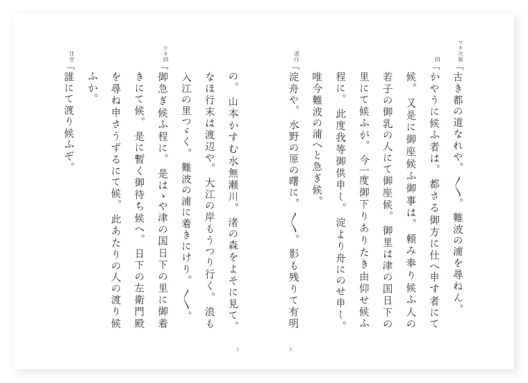 禅竹作 ワキ 妻の従者 狂言 里人 ツレ 左衛門の妻 シテ 日下左衛門 地は 摂津 季は 春 ワキ次第「古き都の道なれや。〳〵。難波の浦を尋ねん。 詞「かやうに候ふ者は。都さる御方に仕へ申す者にて候。又是に御座候ふ御事は。頼み奉り候ふ人の若子の御乳の人にて御座候。御里は津の国日下の里にて候ふが。今一度御下りありたき由仰せ候ふ程に。此度我等御供申し。淀より舟にのせ申し。唯今難波の浦へと急ぎ候。 道行「淀舟や。水野の原の曙に。〳〵。影も残りて有明の。山本かすむ水無瀬川。渚の森をよそに見て。なほ行末は渡辺や。大江の岸もうつり行く。浪も入江の里つゞく。難波の浦に着きにけり。〳〵。 ワキ詞「御急ぎ候ふ程に。是はゝや津の国日下の里に御着きにて候。是に暫く御待ち候へ。日下の左衛門殿を尋ね申さうずるにて候。此あたりの人の渡り候ふか。 狂言「誰にて渡り候ふぞ。 ワキ「此あたりに日下の左衛門殿と申す人の渡り候ふか。 狂言「もとは此所に御座候ひしが。散々御無力にて今は此所には御座なく候。 ワキ「あら何ともなや候。此由をやがて申さうずるにて候。如何に申し候。左衛門殿を尋ね申して候へば。今は此所には御座なき由申し候。 ツレ女サシ「げにや家貧にしては親知すくなく。賤しき身には故人うとしとかや申すなれば。身には限らぬ習ひなれども。余りにあさましき有様かな。去りながら様々ちぎり置きし事有り。此所に暫く逗留し。彼人の行方を尋ねばやと思ひ候。 ワキ「げに〳〵仰せ尤にて候。此所に暫く御逗留候へ。猶々御行方を委しく尋ね申さうずるにて候。いかに以前の人の渡り候ふか。此浦に如何なる面白き事は候はぬか。都の人に見せ申したく候ふよ。 狂言「さん候この浦に浜市の候。色々の物を売り買ひ候ふ中に。若き男の此難波の蘆を刈りて売り候ふが。色々に戯れごとを申して面白き者にて候ふ間。名草の事にて候ふ程に皆々買ひ取り候。暫く御待ち候ひて彼者を御覧候へ。 ワキ「あらうれしや候。さらば彼者を待つて見うずるにて候。 シテサシ「足引の山こそ霞め難波江に。向ふは波の淡路潟。げにや所から異浦々の気色までも。ながめにつゞく難波舟の。出で浮びたる朝ぼらけ。心も澄める面白さよ。 一声「難波なる。見つとはいはじかゝる身に。 地「我だに知らぬ面わすれ。 シテ「立ち舞ふ市の中々に。 地「隠れどころはある物を。 シテサシ「げに受けがたき人界を。たま〳〵受くる身なりせば。栄花の家には住みもせで。かゝる貧家に生るゝ事。前の世の戒行こそ拙けれ。今とても為す業もなき身の行方。昨日と過ぎ今日と暮れ。明日又かくこそ荒磯海の。浜の真砂の数ならぬ。此身命をつがんとて。あだなる露の草の葉に。蘆刈人と為りたるなり。 下歌「何とかならん難波江の。浦に出で里に雪の。寒き日をも厭はず。 上歌「しほたるゝ。我身のかたはつれなくて。〳〵。異浦見れば夕煙。うらめしや終に身を。立てかねてこそ賤しけれ。蘆田鶴の。雲井のよそに詠めこし。月の下蘆刈り持ちて。露をも運ぶ袖の上。猶ありがほの心かな。〳〵。 ワキ詞「いかに是なる人に申すべき事の候。 シテ詞「此方の事にて候ふか何事にて候ふぞ。 ワキ「見申せば色々の物を売り候ふ中に。難波の蘆を御売り候ふ事やさしうこそ候へ。 シテ「さん候此あたりにては売る者も買ふ人も。唯何となくあつかふ所に。都の人とて難波の蘆を御賞翫こそ。返す〴〵もやさしけれ。我も昔は難波津の。名におふ古き都人の。縁の露のおちぶれたる。身は枯蘆の色なくとも。よしとて召され候へ。 ワキ「あら面白や候。さてよしと蘆とは同じ草にて候ふか。 シテ「さん候譬へば薄ともいひ。穂に出でぬれば尾花ともいへるが如し。 ワキ「さては物の名も所によりて変はるよなふ。 シテ詞「中々の事此蘆を。伊勢人は浜荻といひ。 ワキ「難波人は。 シテ「蘆と云ふ。 詞「むつかしや。難波の浦のよしあしも。〳〵。賤しき海士はえぞ知らぬ。唯世をわたる為めなれば。仮の命つがんとて。蘆を取り運びて。此市にいづる蘆数に。おあし添へて召されよや。おあし添へて召されよ。露ながら。難波の蘆を刈り持ちて。よるは月をも運ぶなりや。暇をし夕汐の。昼の内に召されよや。昼の内に召されよ。 ワキ詞「如何に申し候。さて御津の浜とは何くにて候ふぞ。 シテ「忝くも御津の浜の御在所はあれにて候。 ワキ「不思議やな何とて忝きなどゝは仰せ候ふぞ。 シテ「あら何ともなや。さらば何とて御津の浜とは御尋ね候ふぞ。忝くも仁徳天皇。此難波の浦に大宮づくりし給ふ。御津と書いて御津の浜とは申すなり。 ワキ「げに面白き謂かな。皇居なりつる浦なれば。御津の浜とは理なり。 シテ「波濤海辺の大宮なれば。漁村に灯す篝火までも。禁裏雲井の御火かと見えて。上雲上の月卿より。下万民の民間までも。有難かりし恵ぞかし。や。あれ御覧ぜよ御津の浜に。網子とゝのふる網船の。えいや〳〵と寄せ来るぞや。 地「名にし負ふ難波津の。〳〵。