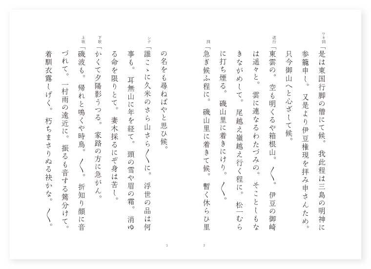 沢庵和尚作 前 ワキ 旅僧 シテ 樵の翁 後 ワキ 前に同じ シテ 医王善逝 地は 伊豆 季は 夏 ワキ詞「是は東国行脚の僧にて候。我此程は三島の明神に参籠申し。又是より伊豆権現を拝み申さんため。只今御山へと心ざして候。 道行「東雲の。空も明くるや箱根山。〳〵。伊豆の御崎は遥々と。雲に連なるわたづみの。そことしもなきながめして。尾越え嶺越え行く程に。松一むらに打ち煙る。磯山里に着きにけり。〳〵。 詞「急ぎ候ふ程に。磯山里に着きて候。暫く休らひ里の名をも尋ねばやと思ひ候。 シテ「誰こゝに久米のさら山さら〳〵に。浮世の品は何事も。耳無山に年を経て。頭の雪や眉の霜。消ゆる命を限りとて。妻木採るにぞ身は苦し。 下歌「かくて夕陽影うつる。家路の方に急がん。 上歌「磯波も。帰れと鳴くや時鳥。〳〵。折知り顔に音づれて。一村雨の遠近に。振るも音する篶分けて。着馴衣露しげく。朽ちまさりぬる袂かな。〳〵。 ワキ「如何に是なる老人に尋ね申すべき事の候。 シテ「こなたの事にて候ふか何事にて候ふぞ。 ワキ「是は東国行脚の僧にて候ふが。伊豆権現へ参詣申さんために。是まで参りて候。さてこゝをば何くと申し候ふぞ。 シテ「是は当国熱海と申す処なり。此里に昔より奇特の御座候。凡そ出湯の名所数々なれども。此里には□□□の天地の呼吸に応じ夜昼四度の満干には。塩の出湯の涌く事熱鉄をわかす鑪鞴の音。又波濤の岸を崩すにひとし。此湯を汲みて家々に。朝夕浴める諸人は。病ふは消えて霜露の如し。 カヽル「げにや温泉の流るゝ処冬の草青しと。ましてや今は深緑。草木が上にも此里に。心を添へて見給へとよ。 ワキ「さて〳〵聞けば不思議やな。その唐帝の古へ。驪山宮の古事を。 シテ「思へば遠き人の国。 ワキ「我国々の名所や。猪名野を分けて有馬山。 シテ「それは津の国。是は又。 ワキ「難波ならねど蘆刈の湯。 シテ「吠え出づる物か犬飼の御湯。 ワキ「入ればしるしを陸奥や。名取の御湯と聞くは如何に。 シテ「汲むとも尽きじ七久里の湯。 ワキ「猶もあるらん又いづこ。 シテ「但馬の出湯浴むとて。 ワキ「二見の浦を通りしも。 シテ「明けてはくやし水の江の。 ワキ「翁さびしき。 シテ「里なれど。 地「処は伊豆の国。病ふの熱海たのもしや。衆病悉除と説き給ふ。仏の国も遠からず。こゝぞさながら東方の。瑠璃の世界もよそならず。天も影移る。誓ひの海の底ふかき。潤は尽きじ見給へや。月も嶺にさし昇る。はや夕汐の出湯かな。〳〵。 ロンギ地「さて面白の浦々や。是に見えたる島山は。如何なる処なるらん。 シテ「見給へ是ぞ世々の人。ながめは経れど見るたびに。珍しければいつまでも。名は新島と申すなり。 地「遥かのよそにほの〴〵と。流れて遠き島あり。 シテ「あれこそ箱根路を。我越えくれば伊豆の海。沖の小島とながめしを。処の者は引きかへて。大島と申し候ふよ。 地「思ひ合はする島々は。神代の昔神たちの。生み始め給ふ淡路島。 シテ「八島の外も数そひて。おのころ島や百島。 地「千島にあたら花や散る。 シテ「蝦夷には見せじ秋の月。 地「猶もあたりの浦山。委しく教へ給へや。 シテ「武士の。八十宇治川にあらねども。篝はそれか氷魚寄する。網代の港あれぞとよ。 地「猶入海の奥ゆかし。小舟さし入る苫屋形。 シテ「身を仇波と打ち捨てゝ。世を伊東が館とはあれなり。 地「青みて遠き山つゞき。 シテ「河津俣野が其むかし。 地「相撲の勝負争ひて。紅葉を顔に散らしゝ。赤沢山の夕づく日。忘れたり方々。御山へ急がせ給ふらん。語ると尽きじ此尉が。繰言もよしなしと。もと来し道に行くと見えて。後影も失せにけりや。うしろかげも失せにけり。(中入) 地「実に信あれば徳ありと。〳〵。疑ふべきや疑はじ。暫くこゝに祈誓して。神の奇特を待ちて見ん。〳〵。 後ジテ「我此名号一経其耳。衆病悉除身心安楽。神といひ仏といひ。只これ水波の隔てぞかし。 詞「我此里に跡を垂れて。所を守り民を撫づる。 カヽル「もとより東方浄瑠璃世界の主。医王善逝我なり。我此名号を一度耳にふれん者は。当代無病の人となり。身心ともに安楽ならしめんとなり。たゞ頼め。(舞) 地「只たのめ。〳〵。しめぢが原のさしも草。 シテ「くゆるは者か。衆生の苦患に変はる身の。 地「胸の猛火に。夜昼四度の塩の出湯。 シテ「万の悩みに注ぎそゝげば。 地「病即消滅不老不死。業障も尽き忽ちに。衆罪も消えて煩悩の雲晴れ。真如の月も。心の空に曇りなく。夜昼分かぬ光を放ち。夜昼分かぬ光を放つ。恵日の影ぞ有難き。 底本:国立国会図書館デジタルコレクション『謡曲評釈 第六輯』大和田建樹 著