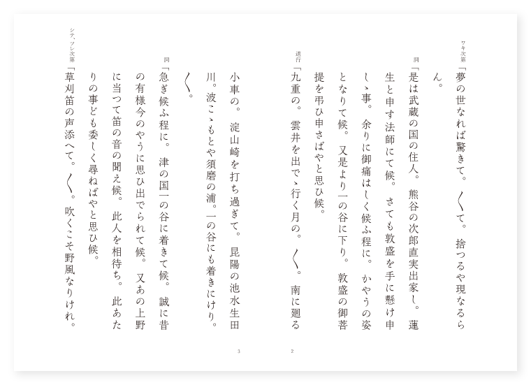 世阿弥作 前 ワキ 蓮生法師 シテ 草刈童 ツレ 草刈男 後 ワキ 前に同じ シテ 平敦盛 地は 摂津 季は 雑 ワキ次第「夢の世なれば驚きて。〳〵て。捨つるや現なるらん。 詞「是は武蔵の国の住人。熊谷の次郎直実出家し。蓮生と申す法師にて候。さても敦盛を手に懸け申しゝ事。余りに御痛はしく候ふ程に。かやうの姿となりて候。又是より一の谷に下り。敦盛の御菩提を弔ひ申さばやと思ひ候。 道行「九重の。雲井を出でゝ行く月の。〳〵。南に廻る小車の。淀山崎を打ち過ぎて。昆陽の池水生田川。波こゝもとや須磨の浦。一の谷にも着きにけり。〳〵。 詞「急ぎ候ふ程に。津の国一の谷に着きて候。誠に昔の有様今のやうに思ひ出でられて候。又あの上野に当つて笛の音の聞え候。此人を相待ち。此あたりの事ども委しく尋ねばやと思ひ候。 シテ、ツレ次第「草刈笛の声添へて。〳〵。吹くこそ野風なりけれ。 シテサシ「かの岡に草刈る男野を分けて。帰るさになる夕ま暮。 二人「家路もさぞな須磨の海。すこしが程の通路に。山に入り浦に出づる。憂き身の業こそ物うけれ。 下歌「問はゞこそ。ひとりわぶとも答へまし。 上歌「須磨の浦。もしほ誰とも知られなば。〳〵。我にも友のあるべきに。余りになればわび人の。親しきだにも疎くして。住めばとばかり思ふにぞ。憂きにまかせて過ごすなり。〳〵。 ワキ詞「如何に是なる草刈達に尋ね申すべき事の候。 シテ詞「此方の事にて候ふか何事にて候ふぞ。 ワキ「唯今の笛はかた〴〵の中に吹き給ひて候ふか。 シテ「さん候我等が中に吹きて候。 ワキ「あらやさしや其身にも応ぜぬわざ。返す〴〵もやさしうこそ候へ。 シテ「其身にも応ぜぬ業と承れども。夫れ優るをも羨まざれ。劣るをも賤しむなとこそ見えて候へ。其上樵歌牧笛とて。 二人「草刈の笛樵の歌は。歌人の詠にも作りおかれて。世に聞えたる笛竹の。不審な為させ給ひそとよ。 ワキ「実に〳〵是は理なり。さて〳〵樵歌牧笛とは。 シテ「草刈の笛。 ワキ「樵の歌の。 シテ「憂き世を渡る一節を。 ワキ「歌ふも。 シテ「舞ふも。 ワキ「吹くも。 シテ「遊ぶも。 地「身の業の。好ける心に寄竹の。〳〵。小枝蟬折さま〴〵に。笛の名は多けれども。草刈の。吹く笛ならば是も名は。青葉の笛と思し召せ。住吉の汀ならば。高麗笛にやあるべき。是は須磨の塩木の。海士の焼きさしと思しめせ。〳〵。 ワキ詞「ふしぎやな余の草刈達は皆々帰り給ふに。御身一人とゞまり給ふ事。何の故にて有るやらん。 シテ詞「何の故とか夕波の。声を力に来りたり。十念授けおはしませ。 ワキ「やすき事十念をば授け申すべし。それに付けても御事は誰そ。 シテ「誠は我は敦盛の。ゆかりの者にて候ふなり。 ワキ「ゆかりと聞けばなつかしやと。掌を合はせて南無阿弥陀仏。 二人「若我成仏十方世界。念仏衆生摂取不捨。 地「捨てさせ給ふなよ。一声だにも足りぬべきに。毎日毎夜の御弔ひ。あら有難や我名をば。申さずとても明暮に。向ひて回向し給へる。其名は我と言ひ捨てゝ。姿も見えず失せにけり。〳〵。(中入) ワキ歌「是に付けても弔ひの。〳〵。法事をなして夜もすがら。念仏申し敦盛の。菩提を猶も弔はん。〳〵。 後ジテ「淡路潟。かよふ千鳥の声きけば。寐覚も須磨の関守は誰そ。如何に蓮生。敦盛こそ参りて候へ。 ワキ「不思議やな鳧鐘を鳴らし法事をなして。まどろむ隙もなき所に。敦盛の来り給ふぞや。さては夢にて有るやらん。 シテ詞「何しに夢にて有るべきぞ。現の因果を晴らさん為めに。是まであらはれ来りたり。 ワキ「うたてやな一念弥陀仏即滅無量の。罪障を晴らさん称名の。法事を絶えせず弔ふ功力に。何の因果は荒磯海の。 シテ「深き罪をも訪ひ浮べ。 ワキ「身は成仏の得脱の縁。 シテ「是れ又他生の功力なれば。 ワキ「日頃は敵。 シテ「今は又。 ワキ「誠に法の。 シテ「友なりけり。 地「是かや悪人の友を振り捨てゝ。善人の敵を招けとは。御身の事か有難や。有難し〳〵。とても懺悔の物語。夜すがらいざや申さん。〳〵。 地クリ「夫れ春の花の樹頭に上るは。上求菩提の機をすゝめ。秋の月の水底に沈むは。下化衆生の形を見す。 シテサシ「然るに一門門を並べ。累葉枝を連ねし粧ひ。 地「誠に槿花一日の栄に同じ。善を勧むる教へには。逢ふ事かたき石の火の。光りの間ぞと思はざりし。身の習はしこそはかなけれ。 シテ「上に在つては下を悩まし。 地「富んでは驕りを知らざるなり。 クセ「然るに平家。世を取つて二十余年。誠に一昔の。過ぐるは夢の内なれや。寿永の秋の葉の。四方の嵐に誘はれ。散々になる一葉の。舟に浮き波に伏して。夢にだにも帰らず。籠鳥の雲を恋ひ。帰雁列を乱るなる。空定めなき旅衣。日も重なりて年月の。立ち帰る春の頃。此一の谷に籠て。しばしはこゝに須磨の浦。 シテ「うしろの山風吹き落ちて。 地「野もさえ帰る海ぎはに。舟の夜となく昼となき。千鳥の声も我袖も。波にしをるゝ磯枕。海士の苫屋に共寐して