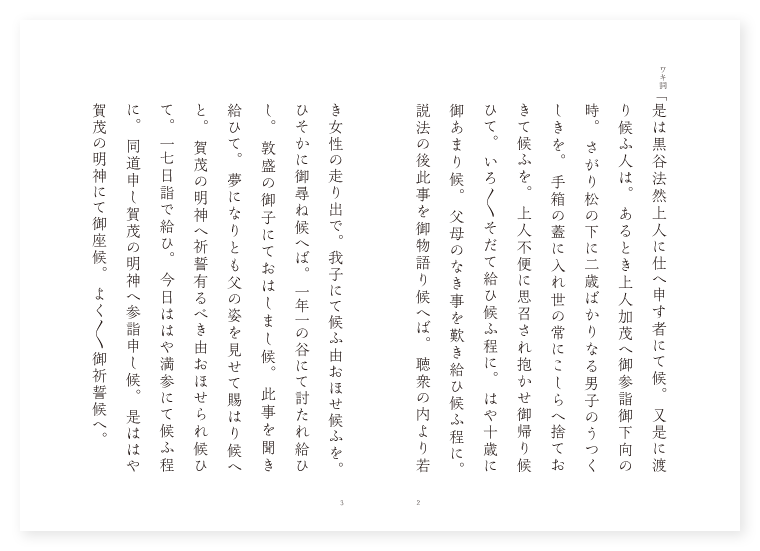 禅鳳作 ワキ 法然上人の従者 子方 敦盛の子 シテ 平敦盛 地は 前は京都賀茂の社 後は摂津生田の森 季は 秋七月 ワキ詞「是は黒谷法然上人に仕へ申す者にて候。又是に渡り候ふ人は。あるとき上人加茂へ御参詣御下向の時。さがり松の下に二歳ばかりなる男子のうつくしきを。手箱の蓋に入れ世の常にこしらへ捨ておきて候ふを。上人不便に思召され抱かせ御帰り候ひて。いろ〳〵そだて給ひ候ふ程に。はや十歳に御あまり候。父母のなき事を歎き給ひ候ふ程に。説法の後此事を御物語り候へば。聴衆の内より若き女性の走り出で。我子にて候ふ由おほせ候ふを。ひそかに御尋ね候へば。一年一の谷にて討たれ給ひし。敦盛の御子にておはしまし候。此事を聞き給ひて。夢になりとも父の姿を見せて賜はり候へと。賀茂の明神へ祈誓有るべき由おほせられ候ひて。一七日詣で給ひ。今日ははや満参にて候ふ程に。同道申し賀茂の明神へ参詣申し候。是ははや賀茂の明神にて御座候。よく〳〵御祈誓候へ。 子方サシ「有難や所からなる御社の。朱の玉垣神さびて。心も澄める御手洗の。ふかき恵みを頼むなり。 下歌「夢になりともたらちねの。其面影を見せ給へ。 上歌「かくばかり。祈る心の末とげば。〳〵。恵みになどか洩るべきと。誓ひ糺の神ともに。願ひを叶へおはしませ。〳〵。 子詞「あら不思議や少し睡眠の内に。あらたに御霊夢を蒙りて候。 ワキ詞「あらめでたやな。御霊夢のやうを御物語り候へ。 子「あの御宝殿の内よりも。あらたなる御声にて。汝夢になりとも父を見んと思はゞ。是より津の国生田の森へ下れと。あらたに霊夢を蒙りて候。 ワキ「是は不思議なる事にて候ふ物かな。黒谷へ御帰りあるまでもなく候。是より生田の森へ御供申し候ふべし。やがて思召し立ち候へ。 道行「山陰の。加茂の宮居を立ちいでゝ。〳〵。急ぐ行くへは山崎や。霧立ち渡る水無瀬川。風も身にしむ旅衣。秋は来にけり昨日だに。訪はんと思ひし津の国の。生田の森に着きにけり。〳〵。 ワキ詞「御急ぎ候ふ程に。是ははや津の国生田の森にて候。森のけしき川の流れ。都にて承り及びたるにもいやまさりて面白き名所にて候。あれに見えたる野辺は生田の小野にてもや候ふらん。立ち寄り詠めばやと思ひ候。こゝかしこを詠め候ふ程に。はや日の暮れて候ふは如何に。あれに灯の影の見えて候ふは人家にて有りげに候。立ち寄り宿を借らばやと思ひ候。 シテサシ「五薀もとより是れ皆空。何によつて平生此身を愛せん。苦を守る幽魂は夜月に飛び。屍を失ふぐはくは秋風に嘯く。あら心すごの折柄やな。 ワキ「不思議やな是なる草の庵の内に。さも花やかなる若武者の。甲冑を帯し見え給ふぞや。是は如何なる事やらん。 シテ「おろかの人の心やな。面々是まで来り給ふも。我に対面の為めならずや。はづかしながら古の。敦盛が幽霊来りたり。 子「なふ敦盛とはわが父かと。身にも覚えず走りより。 地「袂にすがり絶えこがれ。〳〵。泣く音にたつる鶯 の。逢ふ事のうれしさも。うき身にあまるばかりなり。かくは思へど頼まれぬ。夢の契りを。現に返すよしもがな。 シテ「無慙やな忘れがたみの撫子の。花やかなるべき身なれども。衰へはつる墨染の。袂を見るこそあはれなれ。さても御身孝行の心深き故。加茂の明神に歩みを運び。夢になりとも我父の。姿を見せてたび給へと祈誓申す。明神あはれみおはしまし。閻王に仰せつかはさる。閻王おほせを承り。しばしの暇を賜はるなり。親子の契りも今を限りなるべし。 地「更け行く月の夜もすがら。昔をいざや語らん。 クセ「然るに平家の。栄花を極めし其始め。花鳥風月のたはむれ。詩歌管絃のさま〴〵に。春秋を送り迎へしに。如何なるをりか来りけん。木曽の桟かけてだに。思はぬ敵におとされて。主上を始め奉り。一門の人も悉く。花の都を立ち出で。西海の空に趣きぬ。習はぬ旅の道すがら。山を越え海を渡り。しばしは天ざかる。鄙の住居の身なりしに。又立ち帰る浦波の。須磨の山路や一の谷。生田の森に着きしかば。こゝは都も程近しと。一門の人々も。よろこびをなしゝ折節に。 シテ「範頼義経の其勢。 地「雲や霞の如くにて。暫く戦ふといへども。平家は運も槻弓の。やたけ心もよわ〳〵と。皆散り〴〵に為りはてゝ。あはれも深き生田川の。身を捨てし物語。かたるぞよしなかりける。 シテ「うれしやな夢の契りの仮初ながら。親子鸚鵡の袖ふれて。 地「名残つきせぬ心かな。(中の舞) シテ詞「あれに見えたるは如何なる者ぞ。何閻王よりの御使とや。片時の暇と有りつるに。今までの遅参心得ずと。閻王怒らせ給ふぞと。 地「いふかと見れば不思議やな。〳〵。黒雲俄に立ち来り。猛火を放ち剣を降らして。其数しらざる修羅の敵。天地を響かし満ち〳〵たり。 シテ「物々し明暮に。 地「なれつる修羅の敵ぞかしと。太刀真向にさしかざし。こゝやかしこに走り廻り。火花を散して戦ひしが。暫く有りて黒雲も。次第に立ち去り修羅の敵