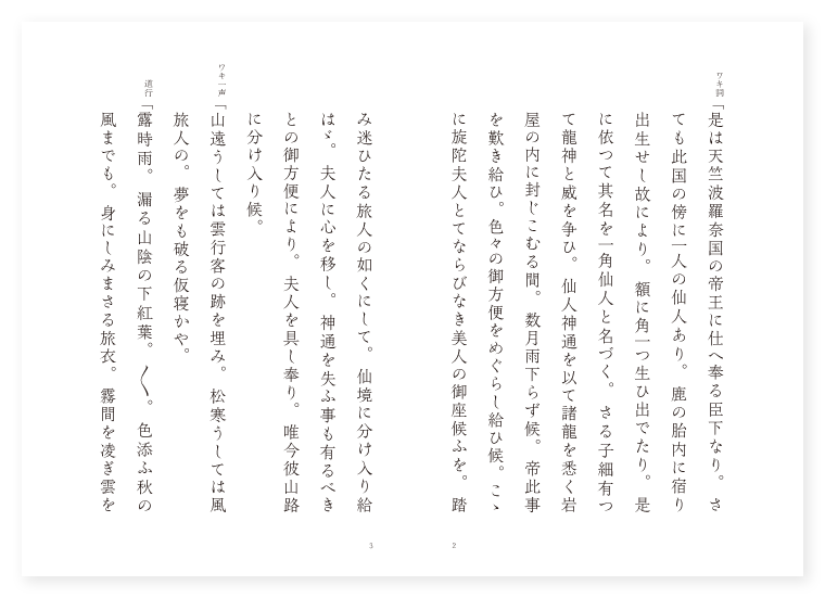 禅鳳作 ワキ 官人 シテ 一角仙人 ツレ 旋陀夫人 ツレ 龍神 地は 天竺 季は 秋九月 ワキ詞「是は天竺波羅奈国の帝王に仕へ奉る臣下なり。さても此国の傍に一人の仙人あり。鹿の胎内に宿り出生せし故により。額に角一つ生ひ出でたり。是に依つて其名を一角仙人と名づく。さる子細有つて龍神と威を争ひ。仙人神通を以て諸龍を悉く岩屋の内に封じこむる間。数月雨下らず候。帝此事を歎き給ひ。色々の御方便をめぐらし給ひ候。こゝに旋陀夫人とてならびなき美人の御座候ふを。踏み迷ひたる旅人の如くにして。仙境に分け入り給はゞ。夫人に心を移し。神通を失ふ事も有るべきとの御方便により。夫人を具し奉り。唯今彼山路に分け入り候。 ワキ一声「山遠うしては雲行客の跡を埋み。松寒うしては風旅人の。夢をも破る仮寝かや。 道行「露時雨。漏る山陰の下紅葉。〳〵。色添ふ秋の風までも。身にしみまさる旅衣。霧間を凌ぎ雲を分け。たづきも知らぬ山中に。おぼつかなくも踏み迷ふ。道の行方は如何ならん。〳〵。 ワキ詞「日を重ねて急ぎ候ふ程に。何処とも知らぬ山路に分け迷ひ候ふぞや。こゝに怪しき巌の陰より。吹き来る風のかうばしく。松桂の枝を引き結びたる菴あり。若し彼仙境にてもや候ふらん。暫く此あたりに徘徊し。事の由を窺はゞやと思ひ候。 シテサシ「瓶には谷漣一滴の水を納め。鼎には青山数片の雲を煎ず。曲終へて人見えず。江上数峰青かりし。梢も今は紅の。秋の気色は面白や。 ワキ詞「如何に此菴の内へ申すべき事の候。 シテ「不思議やこゝは高山重畳として。人倫通はぬ所なり。そも御身は如何なる者ぞ。 ワキ「是は唯山路に踏み迷ひたる旅人なるが。日もやう〳〵暮れかゝり前後を忘じて候。一夜の宿を御かし候へ。 シテ「さればこそ人間の交りあるべき所ならず。とく〳〵帰り給へとよ。 ワキ「そも人間の交りなきとは。さては天仙の住家やらん。先々姿を見せ給へ。 シテ「此上は恥かしながら我姿。旅人にまみえ申さんと。 地「柴の扉を推し開き。〳〵。立ち出づる其姿。緑の髪も生ひ上る。牡鹿の角の束の間も。仙人を。今見る事ぞ不思議なる。 ワキ詞「唯今思ひ出だして候。これは承り及びたる一角仙人にて御座候ふか。 シテ「さん候是こそ一角と申す仙人にて候。さてさてめん〳〵を見申せば。世の常の旅人に非ず。さも美しき宮女のかたち。桂の黛羅綾の衣。更に唯人とは見え給はず候。是は如何なる人にてましますぞ。 ワキ「さきに申す如く。踏み迷ひたる旅人にて候。旅の疲の慰みに。酒を持ちて候ふ一つ聞し召され候へ。 シテ「いや仙境には松の葉をすき。苔を身に着て桂の露を嘗め。年経れども不老不死の此身なり。酒を用ふる事有るまじ。 ワキ「尤仰はさる御事なれども。唯志を受け給へと。夫人は酌に立ち給ひ。仙人に酒を進むれば。 シテ「実に志を知らざらんは。鬼畜には猶劣るべしと。 地「夕べの月の盃を。〳〵。受くる其身も山人の。折る袖匂ふ菊の露。うち払ふにも千代は経ぬべき。契は今日ぞ始めなる。 夫人「面白や盃の。 地「面白や盃の。めぐる光も照り添ふや。紅葉重の袂を。共に翻しひるがへす。舞楽の曲ぞおもしろき。(楽) 地「糸竹の調べとり〴〵に。〳〵。さす盃も度々めぐれば。夫人の情に心を移し。仙人は次第に足弱車の。めぐるもたゞよふ。舞の袂を片しき臥せば。夫人は悦び官人を引き連れ。遥々なりし山路を凌ぎ。帝都に帰らせ給ひけり。 地「かゝりければ岩屋の内しきりに鳴動して。天地も響くばかりなり。 シテ「あら不思議や思はずも。人の情の盃に。酔ひ伏したりし其隙に。龍神を封じこめ置きし。岩屋の俄に鳴動するは。何の故にて有るやらん。 龍神「如何にやいかに一角仙人。人間に交り心を迷はし。無明の酒に酔ひ伏して。通力を失ふ天罰の。報いの程を思ひ知れ。 地「山風あらく吹き落ちて。〳〵。空かき曇り。岩屋も俄にゆるぐと見えしが。磐石四方に破れ砕けて。諸龍の姿は顕れたり。 シテ「其時仙人驚きさわぎ。 地「其時仙人驚きさわぎ。利剣をおつ取り立ち向へば。龍王は嗔恚の甲冑を帯し。邪見の剣の刃先を揃へ。一時が程は戦ひけるが。仙人神通の力も尽きて。次第に弱り倒れ臥せば。龍王よろこび雲を穿ち。雷鳴稲妻天地に満ちて。大雨を降らし洪水を出だして。立つ白波に飛び移り。立つ白波に飛び移つて。又龍宮にぞ帰りける。 底本:国立国会図書館デジタルコレクション『謡曲評釈 第一輯』大和田建樹 著