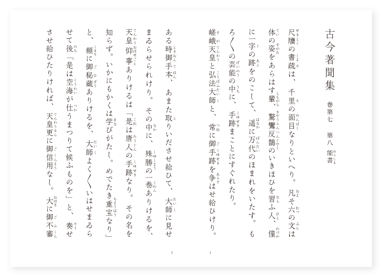 尺牘の書疏は、千里の面目なりといへり。凡そ六の文は体の姿をあらはす輩、驚鸞反鵲のいきほひを習ふ人、僅に一字の跡をのこして、遥に万代のほまれをいたす。もろ〳〵の芸能の中に、手跡まことにすぐれたり。 嵯峨天皇と弘法大師と、常に御手跡を争はせ給ひけり。ある時御手本、あまた取りいださせ給ひて、大師に見せまゐらせられけり。その中に、殊勝の一巻ありけるを、天皇仰事ありけるは「是は唐人の手跡なり。その名を知らず。いかにもかくは学びがたし。めでたき重宝なり」と、頻に御秘蔵ありけるを、大師よく〳〵いはせまゐらせて後「是は空海が仕うまつりて候ふものを」と、奏せさせ給ひたりければ、天皇更に御信用なし。大に御不審ありて「いかでかさる事あらん。当時かゝるやうに、甚だ異するなり。はしたてゝ及ぶべからず」と、勅定ありければ、大師「御不審、まことにそのいはれ候ふ。軸を放ちて、あはせめを御叡覧候ふべし」と申させ給ひければ、即ち放ちて御覧ずるに、その年その日、青龍寺において書すレ之を。沙門空海と記されたり。天皇この時御信仰ありて、「誠に我にはまさられたりけり、それにとていかにかく、当時のいきほひには、ふつとかはりたるぞ」と、尋ね仰せられければ「その事は国によりて、書き替へて候ふなり。唐土は大国なれば、所に相応して、いきほひかくの如し、日本は小国なれば、それにしたがひて、当時のやうを仕うまつり候ふなり」と、申させ給ひければ、天皇大に恥ぢさせ給ひて、その後は、御手跡あらそひもなかりけり。 大内十二門の額、南面三門は弘法大師、西面三門は大内記小野美材、北面三門は但馬守橘逸勢、各各勅を承はりて、垂露の点を下しけり、東面三門は、嵯峨天皇かゝせおはしましける。まことにや。道風朝臣、大師のかゝせ給ひたる額を見て、難じていひける、「美福門は田広し、朱雀門は米雀門」と、略頌に作りてあざけりはべりける程に、やがて中風して、手わなゝきて手跡も異やうになりにけり。(後略) 底本:国立国会図書館デジタルコレクション『古今著聞集』橘成季 著 他