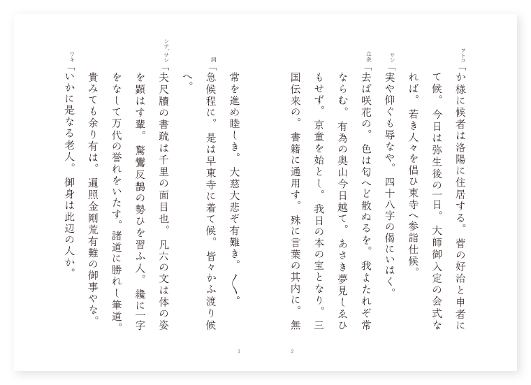 シテ 空海の霊 ワキ 菅好治 ワキツレ 同伴者 所 京都東寺 時 三月下旬 ヲトコ「か様に候者は洛陽に住居する。菅の好治と申者にて候。今日は弥生後の一日。大師御入定の会式なれば。若き人々を倡ひ東寺へ参詣仕候。 サシ「実や仰ぐも辱なや。四十八字の偈にいはく。 立衆「去ば咲花の。色は匂へど散ぬるを。我よたれぞ常ならむ。有為の奥山今日越て。あさき夢見しゑひもせず。京童を始とし。我日の本の宝となり。三国伝来の。書籍に通用す。殊に言葉の其内に。無常を進め睦しき。大慈大悲ぞ有難き。〳〵。 詞「急候程に。是は早東寺に着て候。皆々かふ渡り候へ。 シテ、サシ「夫尺牘の書疏は千里の面目也。凡六の文は体の姿を顕はす輩。驚鸞反鵲の勢ひを習ふ人。纔に一字をなして万代の誉れをいたす。諸道に勝れし筆道。貴みても余り有は。遍照金剛荒有難の御事やな。 ワキ「いかに是なる老人。御身は此辺の人か。 シテ「不思議やな。かほど群集の其中に。分て詞を懸給ふは。何の御用の有やらん。 ワキ「さん候。是は洛陽に住者成が。何れも手跡をたしなみ。分て大師の御筆の跡を。及ばずながら学ぶ故。道を祈りて折々は。参詣申者成が。唯今御身の詞の末に。筆道の不可思議なる事を宣たまふは。同じ願ひの人やらんと。尋申さん其為に。そ忽に詞を懸申す。御心にあはず共。若きにゆるしおはしませ。 シテ「扨は誮しくも手跡に心を入る人とや。我も此寺辺に年を経て。老せまりたる上にても。手跡を学び申也。皆々も信心私なくば。能書と成給はん事疑ひあらじ。たゞ怠らず学ばれ候へ。 ワキ「実有難き御詞や。又承はれば大師は。我朝のみか漢土迄。其名隠れぬ御事よなふ。 シテ「中々の事。入唐渡天まし〳〵て。御智恵をためされ筆道をならひ。三国に御名をかゞやかし。和朝の誉れを顕し給ふ。 ワキ「御身寺辺の人ならば。猶も大師の御事を。委御物語候へ。 シテ「元来旧記にとゞまれ共。御尋にて候程に。懇に語り候べし。 クリ、同「抑大師と申は。金剛三知の薩埵にて。唐土にては恵果にま見え。天竺五台山にては。正身の文殊菩薩を拝し給ふ。浅からぬ大師にておはします。 サシ「唐土にては五筆和尚と号し。我朝にしては三跡のかみに立給ふ。 同「其頃嵯峨の天皇の御宇に叡慮として。唐土和朝の手跡をあつめさせまし〳〵て。筆道に御慮を。尽させ給ふ。 クセ「或時御門は空海を。内裏に召れ此間。異朝より名翰の。巻物朝来せり。日の本に能書多く共。異国には及ばずと。宣旨あれば。空海は。巻物を披見ある。是は我入唐の砌に書たりしと。勅答有ければ。帝いぶかしく思召。支証有やと。叡問なされしかば。則軸を放せば。日の本の沙門空海筆と顕せり。帝猶も覚束なく。然らば此ごとく書ずして。異やうなりと宣旨有。 シテ「大師勅答ましますは。 同「漢土は大国成故に。文字も相応の形ちなりと。答へさせ給へば。帝叡感浅からず。夫より空海を信じおはしまし。大内裏御造営。十二門の其額。南面は大師。西の三つは小野の良記。北は橘の巨勢麿。東の三つは嵯峨の帝。垂露の点を下して。天下の眉目驚怖せり。然して小野の道風。大師の御分律を。難じて朱米と名付。嘲ける権筆を。そしる科にや忽ち。道風手ぶるひせし事。偏に誹る科とかや。心に信なき故ぞ。只正直に修行せよ。我空海と宣ひ。御厨子に入せ給ひけり。〳〵。 後シテ「我過去七仏より以来。番々出生し。今日域に結縁ふかく。其名は高野に入定し。弥勒の出世を待といへ共。衆生済度の思ひふかく。真言秘密の窓の前に。三密の月を澄し。蛍雪にうそぶいて。書経に眼をさらす。有がたや。仏法流布の国なれば。神は高間が原に顕れ。仏は衆生の迷闇を照し。 同「粟散辺土と人はいへども。仏法繁昌神国仏国。竺土も唐土も争か我朝に増らんや。頼めや憑め信受せよ。 シテ「昔日神国の御国の内に。 同「邪の神霊を。千里の外にはらひ給へ共。其執眷属山々峰々嶽々に残り。閑ならず。殊に東夷西戎を治めん為に。魔山に分入。樹下石上に秘密を行へば。雲となり。雨となり。障碍をなせども仏力におされ。虚空に飛去。ならびに山上に水をふうじ。潮海の中に清水を出し。社頭を清め。殺生をとゞめ。秋津島根の風俗を和げ。仁義の道に返る車路。とゞろく道橋をふたたび修覆し。天下泰平。国土安穏。君も豊かに民安き。真言の法味ぞ有難き。 底本:国立国会図書館デジタルコレクション『古今謡曲解題』丸岡桂 著、『宴曲十七帖 謡曲末百番』国書刊行会 編