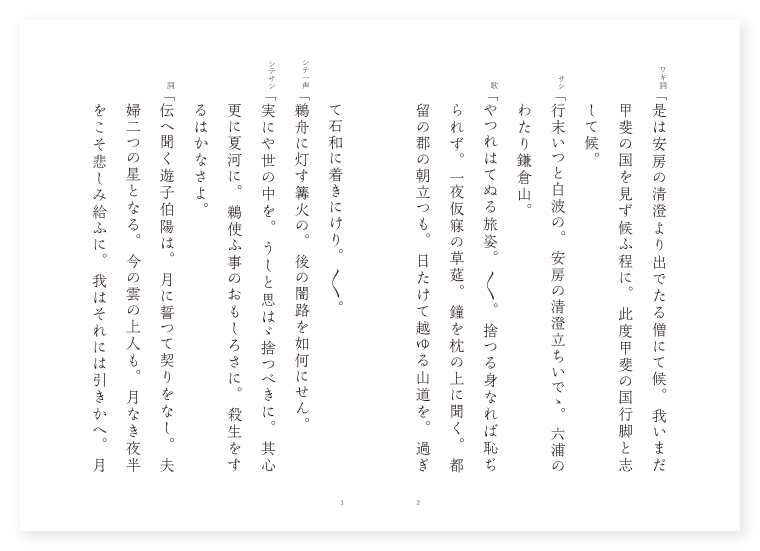 江波左衛門作 前 ワキ 旅僧 ワキヅレ 従伴僧 シテ 鵜つかひの翁 後 シテ 閻魔王 地は 甲斐 季は 夏 ワキ詞「是は安房の清澄より出でたる僧にて候。我いまだ甲斐の国を見ず候ふ程に。此度甲斐の国行脚と志して候。 サシ「行末いつと白波の。安房の清澄立ちいでゝ。六浦のわたり鎌倉山。 歌「やつれはてぬる旅姿。〳〵。捨つる身なれば恥ぢられず。一夜仮寐の草莚。鐘を枕の上に聞く。都留の郡の朝立つも。日たけて越ゆる山道を。過ぎて石和に着きにけり。〳〵。 シテ一声「鵜舟に灯す篝火の。後の闇路を如何にせん。 シテサシ「実にや世の中を。うしと思はゞ捨つべきに。其心更に夏河に。鵜使ふ事のおもしろさに。殺生をするはかなさよ。 詞「伝へ聞く遊子伯陽は。月に誓つて契りをなし。夫婦二つの星となる。今の雲の上人も。月なき夜半をこそ悲しみ給ふに。我はそれには引きかへ。月の夜頃をいとひ。闇になる夜をよろこべば。 下歌「鵜舟に灯す篝火の。消えて闇こそ悲しけれ。 上歌「つたなかりける身の業と。〳〵。今は先非を悔ゆれども。かひも波間に鵜舟漕ぐ。是程惜しめども。叶はぬ命つがんとて。いとなむ業の物うさよ。〳〵。 シテ詞「いつもの如く御堂に上り鵜を休めうずるにて候。や。是は往来の人の御入り候ふよ。 ワキ詞「さん候往来の僧にて候ふが。里にて宿を借り候へば。禁制の由申し候ふ程に。さて此御堂に泊りて候。 シテ「実に〳〵里にて御宿参らせうずる者は覚えず候。 ワキ「さて御身は如何なる人にて渡り候ぞ。 シテ「さん候是は鵜使にて候ふが。いつも月の程は此御堂に休らひ。月入りて鵜を使ひ候。 ワキ「さては苦しからぬ人にて候ふぞや。見申せば早抜群に年たけ給ひて候ふが。かゝる殺生の業勿体なく候。あはれ此業を御とまりあつて。余の業にて身命を御つぎ候へかし。 シテ「仰せ尤にて候へども。若年より此業にて身命を助かり候ふ程に。今更止まつゝべうもなく候。 ワキヅレ「如何に申し候。此人を見て思ひ出だしたる事の候。此二三箇年先に。此河下岩落と申す所を通り候ひしに。かやうの鵜使に行き逢ひ候ふ程に。科の中の殺生の由を申して候へば。実にもとや思ひけん。我屋に連れて帰り。一夜けしからず摂して候ひしよ。 シテ「さては其時の御僧にて渡り候ふか。 ワキヅレ「さん候其時の僧にて候。 シテ「なふ其鵜使こそ空しくなりて候へ。 ワキ「それは何故空しくなりて候ふぞ。 シテ「恥かしながら此業にて空しくなりて候。其時の有様語つて聞かせ申し候ふべし。跡を弔うて御やり候へ。 ワキ「心得申し候。 シテ「抑此石和川と申すは。上下三里が間は堅く殺生禁断の所なり。今おほせ候ふ岩落辺に鵜つかひは多し。夜な〳〵此所に忍び上つて鵜を使ふ。悪き者のしわざかな。彼を見顕はさんとたくみしに。それをば夢にも知らずして。又或る夜忍び上つて鵜を使ふ。ねらふ人々ばつとより。一殺多生の理にまかせ。彼を殺せと言ひあへり。其時左右の手を合はせ。かゝる殺生禁断の所とも知らず候。向後の事をこそ心得候ふべけれとて。手を合はせ歎き悲しめども。助くる人も波の底に。ふしづけにし給へば。叫べど声が出でばこそ。 詞「其鵜使の亡者にて候。 ワキ詞「言語道断の事にて候。さらば罪障懺悔に。業力の鵜を使うて御見せ候へ。跡をば懇に弔ひ申し候ふべし。 シテ「あら有難や候さらば業力の鵜を使うて御目にかけ候ふべし。跡を弔うて賜はり候へ。 ワキ「心得申し候。 シテ「既に此夜も更け過ぎて。鵜使ふ頃にも為りしかば。いざ業力の鵜を使はん。 ワキ「是は他国の物語。死したる人の業により。かく苦しみの憂き業を。今見る事の不思議さよ。 シテ「しめる松明ふり立てゝ。 ワキ「藤の衣の玉だすき。 シテ「鵜籠を開き取り出だし。 ワキ「島つ巣おろし荒鵜ども。 シテ「此河波にばつと放せば。 地「おもしろの有様や。底にも見ゆる篝火に。驚く魚を追ひまはし。かづき上げすくひあげ。隙なく魚を食ふ時は。罪も報いも後の世も。忘れはてゝおもしろや。漲る水の淀ならば。生簀の鯉やのぼらん。玉島川にあらねども。小鮎さばしるせゞらぎに。かだみて魚はよもためじ。不思議やな篝火の。燃えても影の暗くなるは。思ひ出でたり。月になりぬる悲しさよ。鵜舟のかゞり影消えて。闇路に帰る此身の。名残をしさを如何にせん。〳〵。(中入) ワキ歌「河瀬の石を拾ひ上げ。〳〵。妙なる法の御経を。一石に一字書きつけて。波間に沈め弔はゞ。などかは浮まざるべき。〳〵。 後ジテ「夫れ地獄遠きにあらず。眼前の境界。悪鬼外になし。抑彼者。若年の昔より。江河に漁つて其罪おびたゝし。されば鉄札数を尽し。金紙をよごす事もなく。無間の底に堕罪すべかつしを。一僧一宿の功力に引かれ。急ぎ仏所に送らんと。悪鬼心を和らげて。鵜舟を弘誓の船に為し。法華の御法の助舟。篝火も浮ぶけしきかな。 地「迷ひの多き浮雲も。 シテ「実相の風あらく吹いて。 地「千里が外も雲はれて。真如の月や出でぬらん
