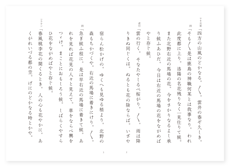 世阿弥作 前 ワキ 鹿島の神職 シテ 貴女 ツレ 侍女 後 シテ 桜葉の神 地は 京都 季は 三月 ワキ次第「四方の山風のどかなる。〳〵。雲井の春ぞ久しき。 詞「そも〳〵是は鹿島の神職何某とは我事なり。われ此度都に上り。洛陽の名花残りなく一見仕りて候。また北野右近の馬場の花。今をさかりなるよし承り候ふあひだ。今日は右近の馬場の花をながめばやと存じ候。 道行「雲の行く。そなたやしるべ桜がり。〳〵。雨は降りきぬ同じくは。ぬるとも花の陰ならば。いざや宿らん松かげの。ゆくへも見ゆる梢より。北野の森もちかづくや。右近の馬場に着きにけり。〳〵。 詞「急ぎ候ふ程に。是は早右近の馬場に着きて候。あれを見れば花見の人々と見えて。車をならべ輿をつゞけ。まことにおもしろう候。しばらくやすらひ花をながめばやと存じ候。 シテサシ「春風桃李花の開くるとき。人の心も花やかに。あくがれいづる都の空。げにのどかなる時とかや。 シテ、ツレ一声「見渡せば。柳桜をこきまぜて。錦をかざる花車。 シテ「くる春ごとにさそはるゝ。 二人「心もながき気色かな。 下歌地「花見車の八重一重。見えて桜の色々に。 上歌「ひをりせし。右近の馬場の木のまより。〳〵。かげも匂ふや朝日寺の。春のひかりも天満てる。神の御幸のあとふりて。松も木高き梅がえの。立枝も見えて紅の。初花車めぐる日の。轅や北につゞくらん。〳〵。 ワキ「のどかなる頃は弥生の花見とて。右近の馬場の並木の桜の。陰ふむ道にやすらへば。 シテ「げにや遥に人家を見て。花あれば即入るなれば。木陰に車を立てよせけり。 ワキ詞「むかひを見れば女車の。所からなる昔語。思ひぞいづる右近の馬場の。ひをりの日にはあらねども。見ずもあらず。見もせぬ人の恋しくは。あやなく今日やながめくらさん。是れ業平の此所にて。女車をよみし歌。今更おもひいでられたり。 シテ「あらおもしろの口ずさみや。右近の馬場のひをりの日。むかひに立てる女車の。所からなる昔語。はづかしながら今はまた。我身の上に業平の。何かあやなく分きていはん。思ひのみこそしるべなりしを。 ワキ「左様にながめし言の葉の。其旧跡もこゝなれば。今またかやうに事問ふ人も。いつ馴れもせぬ人なれども。 シテ「たゞ花ゆゑに北野の杜にて。 ワキ「言葉をかはせば。 シテ「見ずもあらず。 地「見もせぬ人や花の友。〳〵。知るも知らぬも花の陰に。相宿りして諸人の。いつしか馴れて花車の。榻立てゝ木のもとに。下りゐていざやながめん。げにや花のもとに。帰らん事をわするゝは。美景によりて花心。馴れ〳〵そめてながめん。いざいざ馴れてながめん。百千鳥。花になれゆくあだし身は。はかなき程に羨まれて。上の空の心なれや。上の空の心なれ。 ロンギ地「げに名にしおふ神垣や。北野の春も時めける。神の名所かず〳〵に。 シテ「ながむれば。都の空のはる〴〵と。霞み渡るや北野宮居。御覧ぜよ時をえて。花桜葉の宮所。 地「花の濃染の色分けて。紅梅殿や老松の。 シテ「緑より明けそめて。一夜松も見えたり。 地「日影の空も茜さす。 シテ「紫野行きしめ野ゆき。 地「野守は見ずや君が袖。ふるき御幸の物見とて。車も立つや御輿岡。是ぞ此神の御旅居の。右近の馬場わたり。神幸ぞたつとかりける。 ワキ詞「あらありがたの御事や。かくしも委しく語り給ふ。社々の御本地を。なほ〳〵教へおはしませ。 シテ詞「まことは我は此神の。末社とあらはれ君が代を。守りの神と思ふべし。 ワキ「よく〳〵聞けば有難や。守りの神とはさて〳〵いづれの霊神にて。かやうにあらはれ給ふらん。 シテ「あらはづかしや神ぞとは。あさまには何と岩代の。 地「待つこと有りや有明の。〳〵。月も曇らぬ久方の。天照神にては。桜の宮と顕はれ。こゝに北野の桜葉の。神とゆふべの空晴れて。月の夜神楽を待ち給へと。花に隠れ失せにけりや。花に隠れ失せにけり。(中入) ワキ歌「げに今とても神の代の。〳〵。誓ひは尽きぬしるしとて。神と君との御恵み。誠なりけり有難や。〳〵。 後ジテ「天皇の賢き御代を守るなる。右近の馬場の春を得て。花上苑に明にして。軽軒九陌の塵に交る神心。和光の影も曇なき。君の威光も影高く。花もゆるがず治まる風も。のどかなる代のめでたさよ。 地「曇りなき天照神の恵みを受けては。桜の宮居とあらはれ給ひ。 シテ「こゝに北野の神の宮居に。 地「花桜葉の神とあらはれ。曇らぬ威光を顕衣の。袖もかざしの花盛。(中の舞) 地「月も照りそふ花の袖。〳〵。雪をめぐらす神かぐらの。手の舞足ぶみ拍子をそろへ。声すみわたる雲の棧。花に戯れ枝にむすぼゝれ。かざしも花の糸桜。(破の舞) シテ「治まる都の花盛。 地「治まる都の花盛。東南西北も音せぬ浪の。花も色添ふ北野の春の。御池の水に御影をうつし。うつしうつろふ桜衣の。裏吹きかへす梢にあがり。枝に木伝ふ花鳥の。とぶさにかけり雲につたひ。遥かにあがるや雲の羽風。遥かにあがるや雲の羽風に。