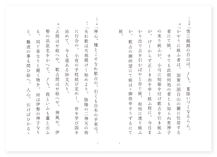 ツレ 里人 シテ 度会の何がし 子方 幸菊丸 地は 加賀 季は 四月 ツレ次第「雪三越路の白山は。〳〵。夏陰いづくなるらん。 詞「かやうに候ふ者は。加賀の国白山の麓に住居する者にて候。さても此程何処の者とも知らぬ男神子の来り候ふが。小弓に短冊を付け歌占を引き候ふが。けしからず正しき由を申し候ふ程に。今日まかり出で占を引かばやと存じ候。如何に渡り候ふか。歌占の御所望にて候はゞ御供申さうずるにて候。 シテ一声「神心。種とこそなれ歌占の。引くも白木の手束弓。 サシ「夫れ歌は天地開けし始めより。陰陽の二神天の街に行合の。小夜の手枕結び定めし。世を学び国を治めて。今も道ある妙文たり。 歌「占問はせ給へや。歌占問はせ給へや。神風や。伊勢の浜荻名をかへて。〳〵。葭といふも蘆と云ふも。同じ草なりと聞く物を。所は伊勢の神子なりと。難波の事も問ひ給へ。人心。引けばひかるゝ梓弓。伊勢や日向の事も問ひ給へ。日向の事も問ひ給へ。 ツレ詞「如何に申すべき事の候。 シテ詞「何事にて候ふぞ。 ツレ「さて御身は何くの人にて渡り候ふぞ。見申せば若き人にて候ふが。何とて白髪とはなり給ひて候ふぞ。 シテ「実に〳〵普く人の御不審にて候。是は伊勢の国二見の浦の神職なるが。我一見のために国々を廻る。或時俄に頓死す。又三日と申すによみがへる。それよりかやうに白髪となりて候。是も神の御咎めと存じ候ふ程に。当年中に帰国すべきとおこたりを申して候。 ツレ「さては其謂にて候ふな。さらば歌占を引き申し候ふべし。 シテ「やすき間の事一番に手に当りたる短冊の歌を遊ばされ候へ。考へて参らせ候ふべし。 ツレ「承り候。教へにまかせ短冊を取り上げ見れば。何々北は黄に。南は青く東白。西くれなゐの蘇命路の山。かやうに見えて候。 シテ「須弥山をよみたる歌にて候。是は父の事を御尋ね候ふな。 ツレ「さん候親にて候ふ者此程所労仕り候ふ間。生死の境を尋ね申し候。 シテ「心得申し候。委しう判じて聞かせ申さう。夫れ今度の所労を尋ぬるに。辺涯一片の風より起つて。水金二輪の重結に顕はる。夫れ須弥は金輪より長じて。其丈十六万由旬のいきほひ。四州常楽の波にうかび。金銀碧瑠璃玻球加宝の影。五重色空の雲に移る。されば須弥の影うつるによつて。南瞻部州の草木みどりなりと云へり。さてこそ南は青しとはよみたれ。こゝに又父の恩の高き事。高山千丈の雲も及びがたし。されば父は山。染色とは風病の身色。しかも生老病死の次第を取れば。西くれなゐと見えたるは。命期六交の滅色なれば。あふ是は既に難義の所労なれども。こゝに又染色とは。声を借りたる色どりにて。文字には蘇命路なり。よみがへる命の路と書きたれば。誠に命期の路なれども。又染色に却来して。二度こゝに蘇生の寿命の。種となるべき歌占の詞。頼もしく思し召され候へ。 ツレ「あらうれしや。さては苦しかるまじく候ふか。 シテ「中々の事御心安く思し召され候へ。 ツレ「近頃祝着申して候。又是なる幼き人も占の所望にて候。 シテ「さてはおことも占の所望にて候ふか。以前の如く一番に手に当りたる短冊の歌を御読み候へ。 子「鶯のかひこの中の時鳥。しやが父に似てしやが父に似ず。 シテ「是も父の事を御尋ね候ふな。 子「さん候父を失ひて尋ね申し候。 シテ「是は早合ひたる占にて候ふ物を。 子「いや逢はねばこそ尋ね申し候へ。 シテ「さりとては占に偽りよもあらじ。鶯に逢ふ言葉の縁あり。又かひこの中の時鳥とも云へり。時も卯月程時も合ひに合ひたり。や。今鳴くは時鳥にて候ふか。 子「さん候時鳥にて候。 シテ「おもしろし〳〵。当面黄舌の囀り。鶯の子は子なりけり子なりけり。不思議や御身は何処の人ぞ。 子「伊勢の国の者。 シテ「在所は。 子「二見の浦。 シテ「父の名字は。 子「二見の太夫度会の何某。 シテ「さて其父は。 子「別れて今年八箇年。 シテ「さておことの幼名は。 子「幸菊丸と申すなり。 シテ「こはそも神の引き合はせか。是こそ父の何某よ。 子「不思議や父にてましますかと。言はんとすれば白髪の。 シテ「身は白雪の面わすれ。 子「されども見れば我父の。 シテ「子は子なりけり。 子「時鳥の。 地「程経て今ぞ廻りあふ。占も合ひたり親と子の。二見の占方の。正しき親子なりけるぞ。実にや君が住む。越の白山知らねども。ふりにし人のゆくへとて。四鳥の別れ親と子に。二度逢ふぞ不思議なる。〳〵。 ツレ詞「かゝる不思議なる事こそ候はね。さては御子息にて候ふか。 シテ詞「さん候疑ひもなき我が子にて候。是も神の御引き合はせと存じ候ふ程に。やがて伴なひ帰国せうずるにて候。 ツレ「近頃めでたき御事にて候ふものかな。又人の申され候ふは。地獄の有様を曲舞に作りて御うたひある由承り及びて候。とてもの事に謡うて御聞かせ候へ。 シテ「やすき御事にて候へども。此一曲を狂言すれば。神気が添うて現なくなり候へども。よし〳〵帰国の事なれば。面々名残の一曲に。