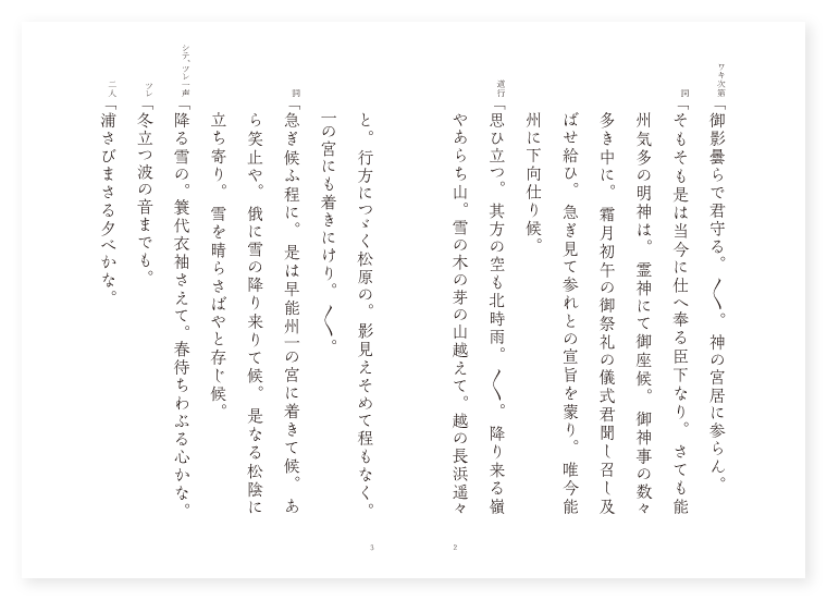 前 ワキ 官人 シテ 海人乙女 ツレ 同 後 ツレ 八尋玉殿の神 シテ 気多明神 地は 能登 季は 十一月 ワキ次第「御影曇らで君守る。〳〵。神の宮居に参らん。 詞「そもそも是は当今に仕へ奉る臣下なり。さても能州気多の明神は。霊神にて御座候。御神事の数々多き中に。霜月初午の御祭礼の儀式君聞し召し及ばせ給ひ。急ぎ見て参れとの宣旨を蒙り。唯今能州に下向仕り候。 道行「思ひ立つ。其方の空も北時雨。〳〵。降り来る嶺やあらち山。雪の木の芽の山越えて。越の長浜遥々と。行方につゞく松原の。影見えそめて程もなく。一の宮にも着きにけり。〳〵。 詞「急ぎ候ふ程に。是は早能州一の宮に着きて候。あら笑止や。俄に雪の降り来りて候。是なる松陰に立ち寄り。雪を晴らさばやと存じ候。 シテ、ツレ一声「降る雪の。簑代衣袖さえて。春待ちわぶる心かな。 ツレ「冬立つ波の音までも。 二人「浦さびまさる夕べかな。 シテ「それ国々所々に。神所垂跡多けれども。殊更御影を仰ぐなる。 二人「此神垣の松の葉の。千代万代の末かけて。運ぶ歩みも積る雪の。深き恵みを頼むなり。我は賤しき海士の子の。よその見る目も如何ならん。誰とても隔てはあらじ神心。〳〵。交はる塵の浮世に。安く楽しむ身の程を。思ひかへせば勇み有る。此神祭急ぐなり。〳〵。 ワキ詞「如何に是なる人々に尋ね申すべき事の候。 シテ詞「此方の事にて候ふか何事にて候ふぞ。 ワキ「是程深き雪の中に。しかも女性の御身として。かやうに歩みを運び給ふ事不審にこそ候へ。 シテ「是は此あたりの者にて候ふが。霜月初午の御祭礼の儀式。殊更神秘多けれども。取り分け歩みを運び候。是は此あたりにては見馴れ申さぬ御事なり。若し都より御参詣候ふやらん。 ワキ「実によく見て有る物かな。是は当今に仕へ奉る臣下にて候。今月初午の御祭礼の儀式。君聞し召し及ばせ給ひ。急ぎ見て参れとの宣旨を蒙り。勅使に下向仕りて候。 シテ「さては遥々の御志。返す〴〵も有難うこそ候へ。 ワキ「さらば御神事の謂委しく御物語り候へ。 シテ「是れ猶秘する事なれば。あからさまには申し難しさりながら。当国ゆのかうと申す所より。荒鵜を取りて生贄に供ふ。彼鵜みづから贄に備はり。放せばやがて飛び去る事。是第一の奇特なり。 ワキ「是は不思議の御事かな。さも心なき鳥類までも。 シテ「贄に備はる神の誓ひ。 ワキ「雲井を翔る翅までも。心なしとはいひ難し。 シテ「ましてやいはん人として。 ワキ「頼みをかけよ。 シテ「かけまくも。 地「かたじけなしや神の代の。尽きぬ御恵み。ひとへに仰ぎ給へや。 地クリ「そも〳〵当社の地形を見るに。西は蒼海漫々たり。北には青山あり。亀鶴蓬萊山と名づく。一つの巌窟あり。七星常住の仙境なり。 シテサシ「然るに此神は。垂跡年久しといへども。利物の風あらたなり。 地「日本第三の社壇。正一位勲一等。気多不思議智満大菩薩と号し。無仏世界度衆生。今世後世能引導の。誓ひを顕はしおはします。 クセ「然るに其昔。神功皇后の勅を受け。干満両顆の明珠を。海底に沈め忽ちに。新羅百済の凶賊を。皆悉く亡ぼして。天下安全に。国土も豊かなりけり。そのかみ垂仁天皇の御宇かとよ。大入杵の神主。祭主と定め此神を。勧請し奉りけり。 シテ「然れば代々の帝までも。 地「神徳を仰ぎ給ひ。社禄を贈り。礼典ひまなくあがめ給ふとか。されば一度も神前に。歩みを運ぶともがらは。息災延命の徳を得。二世の願ひも満つ月の。影明らかに曇りなき。当宮の御恵み。仰ぎても余りあるべし。 ワキ詞「不思議なりとよ方々は。そも誰なればかほどまで。神秘を残さず語り給ふ。其名は如何におぼつかな。 シテ「今は何をか包むべき。我此所に年を経て。有縁の衆生を守るなる。 地「神とやいはん恥かしや。〳〵。御身は勅の使なれば。言葉をかはすぞと。夕べの月の光と共に。朱の玉垣に隠れけり。玉垣の内に隠れけり。(中入) ツレ一声「昔は大入杵の神主と号し。今は此地に跡を垂れ。八尋玉殿の神とは我事なり。 地「即ち御影を顕はし給ひて。即ち御影をあらはし給ひて。勅使に参拝の膝を屈し。其後御殿に上らせ給ひ。手づから扉をひらき給へば。誠に妙なる相好荘厳赫奕として。顕はれ給ふ有難や。 シテ「如何に八尋玉殿の神。いざ諸共に舞楽を奏し。彼客人を慰めん。 ツレ「実に客人は勅の使。さらば舞楽をなすべしと。琴管の役をすゝむれば。 シテ「誠に勅の使ぞと。聞くに付けても思ひ出づる。 地「其古への神祭。〳〵。安倍の貞任勅使として。万歳楽を舞ひし事。唯今の勅の使に。思ひ出づるも面白や。(舞) シテ「更け過ぐる夜神楽の。 地「更け過ぐる夜神楽の。月も傾く空なれや。丑三つも時至れば。神前に供ふる生贄の。真鳥もこゝに顕はれたり。空飛ぶ鳥も地に落ちて。〳〵。神慮に従ふその有様。まのあたりなる奇特かな。 シテ「此鳥少しも驚かで。 地「此鳥少しも驚かで。諸人の中を。静かに歩み出で階を上り。神前に羽を垂れ伏し