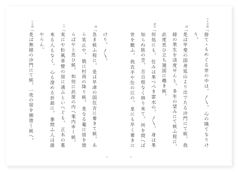 世阿弥作 前 ワキ 身延山の僧 シテ 宿主の女 後 ワキ 前に同じ ワキヅレ 伴僧 シテ 富士の妻 地は 摂津 季は 秋 ワキ次第「捨てゝもめぐる世の中は。〳〵。心の隔てなりけり。 詞「是は甲斐の国身延山より出でたる沙門にて候。我縁の衆生を済度せんと。多年の望みにて候ふ程に。此度思ひ立ち廻国に趣き候。 道行「何処にも。住みは果つべき雲水の。〳〵。身は果知らぬ旅の空。月日程なく移り来て。所を問へば世を厭ふ。我衣手や住の江の。里にも早く着きにけり。〳〵。 詞「急ぎ候ふ程に。是は早津の国住吉に着きて候。あら笑止や。俄に村雨の降り候。是なる菴に宿を借らばやと思ひ候。如何に此屋の内へ案内申し候。 シテ「実にや松風草壁の宿に通ふといへども。正木の葛来る人もなく。心も澄める折節に。事問ふ人は誰やらん。 ワキ詞「是は無縁の沙門にて候。一夜の宿を御借し候へ。 シテ詞「実に〳〵出家の御事。一宿は利益なるべけれども。さながら傾く軒の草。埴生の小家のいぶせくて。何と御身を置かるべき。 ワキ「よし〳〵内はいぶせくとも。降りくる雨に立ち寄る方なし。唯さりとては借し給へ。 シテ「実にや雨降り日も呉竹の。一夜を明かさせ給へとて。 下歌地「早此方へと夕露の。葎の宿はうれたくとも。袖をかたしきて。御泊りあれや旅人。 上歌「西北に雲起りて。〳〵。東南に来る雨の足。早くも吹き晴れて。月にならん嬉しや。所は住吉の。松吹く風も心して。旅人の夢を覚ますなよ。〳〵。 ワキ詞「如何に主に申すべき事の候。 シテ詞「何事にて候ふぞ。 ワキ「是に飾りたる太鼓。同じく舞の衣裳の候ふ不審にこそ候へ。 シテ「実によく御不審候ふ物かな。是は人の形見にて候。是に付きあはれなる物語の候ふ語つて聞かせ申し候ふべし。 ワキ「さらば御物語り候へ。 シテ「昔し当国天王寺に。浅間といひし伶人あり。同じく此住吉にも富士と申す伶人有りしが。其頃内裏に管絃の役を争ひ。互に都に上りしに。富士此役を賜はるによつて。浅間安からずに思ひ。富士をあやまつて討たせぬ。其後富士が妻夫の別れを悲しみ。常は太鼓を打つて慰み候ひしが。それも終に空しくなりて候。逆縁ながら弔ひて給り候へ。 ワキ「かやうに委しく承り候ふは。其古への富士が妻の。ゆかりの人にてましますか。 シテ「いやとよそれは遥かの古へ。思ふも遠き世語の。ゆかりといふ事あるべからず。 ワキ「さらば何とて此物語。深き思ひの色に出でゝ。涙を流し給ふぞや。 シテ「なふ何れも女は思ひ深し。殊に恋慕の涙に沈むを。などかあはれと御覧ぜざらん。 ワキ「猶も不審は残るなり。形見の太鼓形見の衣。こゝには残し給ふらん。 シテ「主は昔になり行けども。太鼓は朽ちず苔むして。 ワキ「鳥驚かぬ。 シテ「此御代に。 地「住むもかひなき池水の。〳〵。忘れて年を経し物を。又立ち帰る執心を。助け給へといひ捨てゝ。かき消す如くに失せにけり。(中入) ワキ「それ仏法さま〴〵なりと申せども。法華は是れ最第一。 ツレ「三世の諸仏の出世の本懐。衆生成仏の直道なり。 ワキ「中んづく女人成仏疑ひあるべからず。 二人「一者不得作梵天王。二者帝釈三者魔王。四者転輪聖王。五者仏身云何女身。 地「速得成仏。何疑ひか荒磯海の。深き執心を。晴らして浮び給へや。或ひは若有聞法者。〳〵。無一不成仏と説き。一度此経を聞く人。成仏せずといふ事なし。唯頼め頼もしや。弔ふ灯の影よりも。化したる人の来りたり。夢か現か。見たりともなき姿かな。 ワキ「不思議やな見れば女性の姿なるが。舞の衣裳を着し。さながら夫の姿なり。 詞「さては有りつる富士が妻の。其幽霊にてましますか。 シテ「実にや碧玉の寒き蘆。錐嚢に脱すとは。今身の上に知られさぶらふぞや。さりながら妙なる法の受持に逢はゞ。変成男子の姿とは。などや御覧じ給はぬぞ。然らば御弔ひの力にて。 地「憂かりし身の昔を。懺悔に語り申さん。さるにても我ながら。よしなき恋路に侵されて。長く悪趣に堕しけるよ。さればにや。女心の乱髪。ゆひかひなくも恋衣の。妻の形見を戴き。此狩衣を着しつゝ。常には打ちし此太鼓の。寐もせず起きもせず。涙敷妙の枕上に。残る執心を晴らしつゝ。仏所に至るべし。うれしの今の教へや。 シテ「思ひ出でたる一念の。 地「起るは病ふとなりつゝ。継がざるは是薬なりと。古人の教へなれば。思はじ〳〵。恋忘草も住吉の。岸に生ふてふ花なれば。手折りやせまし我心。契り麻衣の片思ひ。執心を助け給へや。 ロンギ地「実に面白や同じくは。懺悔の舞をかなでゝ。愛着の心を捨て給へ。 シテ「いざ〳〵さらば妄執の。雲霧を払ふ夜の。月も半なり。夜半楽をかなでん。 地「心も共に住吉の。松のひまより詠むれば。 シテ「波もて結へる淡路潟。 地「沖も静かに青海の。 シテ「青海波の波返し。 地「かへすや袖の折を得て。軒端の梅に鶯の。 シテ「来鳴くや花の越殿楽。 地「うたへやうたへ。 シテ「梅が枝。 地「梅が枝にこそ。鶯は巣をく