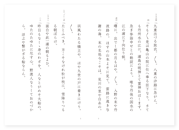 宮増作 前 ワキ 勅使 シテ 海士乙女 ツレ 同じく 後 シテ 浦島の神 ツレ 天女 ツレ 龍神 地は 丹後 季は 冬 ワキ次第「九重出づる旅衣。〳〵。八重の汐路に急がん。 詞「そも〳〵是は亀山の院に仕へ奉る臣下なり。さても丹州水の江に。浦島の明神とて霊神おはします。急ぎ参詣申せとの勅諚により。唯今丹後の国水の江の浦に下向仕り候。 道行「曙に。出でし都の月もはや。〳〵。入野の末や丹波路の。ほすの山本よそに見て。雲路に遠き与謝の海。末の名処今こそは。見川の里や白糸の。浜風わたる橋立や。はや九世の戸に着きにけり。〳〵。 シテ、ツレ一声「たとふべき。方こそなけれ松が枝に。雪降りつもる朝ぼらけ。 シテサシ「面白や此一浦の朝もよひ。 二人「昨日もなしゝ身のわざを。人なとがめそ大船の。ゆたのたゆたに尽す心。野渡人なうしておのづから。浮ぶや繫がざる船ならん。 下歌「いざ〳〵釣に出でうよ。釣の暇も波の上。わりなくも暮るゝ日に。 上歌「帰るさの。道をいづくと人問はゞ。〳〵。何と答へん白玉の。乙女の姿を此浦の。島根の波も心せよ。げにや幾度か。都ならばと夕波に。釣人多き船路かな。〳〵。 ワキ詞「いかに是なる釣垂れ給ふ女性に尋ね申すべき事の候。 シテ詞「此方の事にて候ふか何事にて候ふぞ。 ワキ「見申せば女性の身として。釣たれ給ふ事不審にこそ候へ。是は処の習ひにて候ふか。 シテ「御不審は御理にて候ふ去りながら。かたじけなくも神功皇后。新羅とやらんを従へ給ひし占方にも。玉島川にて三尺の鮎を釣らせ給ひし御事ぞかし。 二人「それは玉島是は又。其名を聞くも浦島の。答へ申さん言葉をも。知らで賤しき海人乙女に。不審な為させ給ひそとよ。 ワキ「実に面白き答へかな。さらば海士人浦島の。宮居を教へてたび給へ。 シテ「汀は満ちくる夕汐に。其通路もさだかならず。とても我らが世渡る船に。恥かしながら乗り給へ。 ワキ「是はうれしき事なるぞや。いざ此船に乗らんとて。 シテ「汀の波に。 二人「裳裾をひたし。 地「海士ならぬ。身も袖ぬらす旅衣。〳〵。幾野の道の遠ければ。まだ踏みも見ぬ海士人の。情ゆゑ白糸の。浜路の末も遥かなる。知らず范蠡が船の内。呉王一国のうれひを載す。是に引きかへて。小船に至る都人の。恵みの縁ある。我身の程ぞありがたき。 シテ「船が着いて候ふ御上り候へ。 ワキ「御船恐れて候。 シテ「是こそ浦島の明神にて候ふよく〳〵御拝み候へ。 ワキ「承り及びたるよりも有難う候。猶々当社のいはれ委しく御物語り候へ。 地クリ「花は雨の過ぐるに依つて紅まさに老いたり。柳は風に欺かれて緑やうやく垂れり。 シテサシ「ことわりやさては仙女の計らひにて。 地「行くや月日を此箱に。畳みかくして年並の。老いせず死せぬ薬を籠めて。あさまになさじとさしもげに。明くなと教へ給ひける。言葉を変へて明くる箱の。再び返すかひもなく。老いとなるこそ不思議なれ。 シテ「北州の千年天上の五衰。 地「身に白露の玉手箱。明けて悔しき心かな。 クセ「明けて見るべきは雨の夜に。残る朝の月。咲くも見せぬ夜桜。まだ時ならぬ鶏の。空音を聞きし関の戸は。明けしぞうれしかりける。明けて何より悦びの。御代となりしは久方の。天照大神の。素盞嗚の尊に襲はれ出でゝ。千早振る神も世の中の。交りや浮雲の。高天の原の岩座に。天の戸を閉ぢて跡は早。常闇の世と。なりし間は六つの年。こゝに月神の御子に。うねみの命其時の。御供に洩れ残り。闇中に身を歎き。諸神を集め神歌や。 シテ「御声も妙なる舞の袖。 地「真榊とりて香具山の。むすきが本つ葉や。青和幣白和幣。日形の鏡天照らす。神も御影を写して。磐戸を去りて出で給へば。天地二度ひらけて。国土ゆたかになる事も。岩戸を明けし故ぞかし。それは神代の古へ。是は人の今の代。かしこは明けてよろこび。こゝは明けて悔しき。浦島が箱ぞよしなき。 ワキ詞「さて〳〵かやうに承る。御身はいかなる人やらん。 シテ詞「今は何をかつゝむべき。我は蓬萊の仙女なるが。 地「此君を守りつゝ。不死の薬を与へん。暫く待たせ給へやと。夕べの空の雲の浪。帰るも見えずになりにけり。〳〵。(中入) 天女「有難やかゝる聖主の代に引かれ。 地「有りし昔の舞歌の袖。いで〳〵夢中に浦島の。昔を語る神託を見せんと。五色の亀の寄る白波は。いかさま龍神の参会なるかや。あれ〳〵汀の波の上。 龍神「そも〳〵是は下界に住んで。神を敬ひ君を守り。殊には大慈大悲の悲願を行ふ。海龍王とは我事なり。 シテ「我はまた玉の手箱を守る浦島の神。 地「互に姿を顕はして。〳〵。龍神みぎはの浪に座して。折柄を守護し。又は神風に雲霧を払つて。あたりも耀く玉の手箱を。彼旅人の稀なる故に。夢中に顕はし見せ給ふ。 シテ「夢ばし覚ますな客人よ。 地「夢ばし覚ますな客人よ。 シテ「夜はまだ明けじ玉手箱。 地「早くも治まる君が代の。勅使を慰めの夜遊ぞかし。海龍王も心せよ。 龍神「海龍王も神勅に