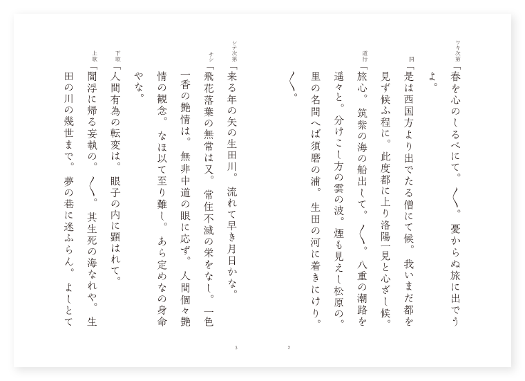世阿弥作 前 ワキ 西国の僧 シテ 里人 後 ワキ 前に同じ シテ 梶原景季 地は 摂津 季は 二月 ワキ次第「春を心のしるべにて。〳〵。憂からぬ旅に出でうよ。 詞「是は西国方より出でたる僧にて候。我いまだ都を見ず候ふ程に。此度都に上り洛陽一見と心ざし候。 道行「旅心。筑紫の海の船出して。〳〵。八重の潮路を遥々と。分けこし方の雲の波。煙も見えし松原の。里の名問へば須磨の浦。生田の河に着きにけり。〳〵。 シテ次第「来る年の矢の生田川。流れて早き月日かな。 サシ「飛花落葉の無常は又。常住不滅の栄をなし。一色一香の艶情は。無非中道の眼に応ず。人間個々艶情の観念。なほ以て至り難し。あら定めなの身命やな。 下歌「人間有為の転変は。眼子の内に顕はれて。 上歌「閻浮に帰る妄執の。〳〵。其生死の海なれや。生田の川の幾世まで。夢の巷に迷ふらん。よしとても身の行くへ。定めありとても終には。夢の直路に帰らん。〳〵。 ワキ詞「如何に申すべき事の候。是なる梅は名木にて候ふか。 シテ「さん候是は箙の梅と申し候。 ワキ「あらおもしろや箙の梅とは。いつの代よりの名木にて候ふぞ。 シテ「いや名木程の事は候はねども。唯私に申しならはしたる異名にて候。 ワキ「よし〳〵私に名づけたる異名なりとも。委しく御物語り候へ。 シテ「そも〳〵此生田の森は。平家十万余騎の追手なりしに。源氏の方に梶原平三景時。同じき源太景季。色ことなる梅花の有りしを。一枝折つて箙にさす。此花すなはち笠印となりて。気色あらはに著く。功名人に勝れしかば。景季かへつて此花を礼し。すなはち八幡の神木と敬せしより以来。名将の古跡の花なればとて。箙の梅とは申すなり。 ワキ「実にや名将の古跡と云ひ名木と云ひ。名残尽きせぬ年々に。 シテ詞「降るは程なき春雨の。古きに帰る名を聞けば。 ワキ「其景季の盛りなりし。 シテ「若木の花の白真弓。 ワキ「箙の梅の。 シテ「今までも。 地「名を留めし。主は花の景季の。〳〵。末の世かけて生田川の。身を捨てゝこそ。名は久しけれ武士の。やたけ心の花に引く。弓筆の名こそ妙なれや。弓筆の名こそ妙なれ。 地クリ「さる程に平家は去年播磨の室山。備中の水島二箇度の合戦に打ち勝つて。山陽道南海道。合はせて十四箇国の兵。都合十万余騎。津の国一の谷にぞ籠りける。 シテサシ「東は生田の森。西は一の谷を限つて。其間三里が程は満ち〳〵たり。 地「浦々には数千艘の船を浮べ。陸には赤旗いくらも立てならべ。春風に靡き天に翻る有様。猛火雲を焼くかと見えたり。 シテ「総じて此城の前は海後は山。 地「左は須磨右は明石の。とよりかくより行きかふ舟の。共音の千鳥も声々なり。 クセ「時しも如月。上旬の空の事なれば。須磨の若木の桜も。まだ咲きかぬる薄雪の。さえかへる波こゝもとに。生田のおのづから盛りを得て。かつ色見する梅が枝。一花開けては天下の春よと。軍の門出を祝ふ。心の花もさきかけぬ。さる程に味方の勢。六万余騎を二手に分けて。範頼義経の追手搦手の。海山かけて須磨の浦。四方を囲みて押し寄する。 シテ「魚鱗鶴翼もかくばかり。 地「後の山松にむれゐるは。残りの雪の白妙に。ねぐらを立たん真鶴の。翅を連ぬる其気色。雲にたぐへて夥し。浦には海人様々の。漁父の船影数見えて。漁たく火もかげろふや。嵐も波も須磨の浦。野にも山にも漕ぎ寄する。兵船はさながら。天の鳥船もかくやらん。 ロンギ地「はや夕ばえの梅の花。月になり行く仮枕。一夜の宿を借し給へ。 シテ「我は宿りも白雪の。花の主と思し召さば。下臥に待ち給へ。 地「花の主と思へとは。御身如何なる人やらん。 シテ「今は何をか包むべき。我は此世に亡き影の。 地「跡弔はれんと夕草の。 シテ「其景季が幽霊なり。 地「御身他生の縁ありて。一樹の陰の花の縁に。鶯宿梅の木の本に。宿らせ給へ我は又。世を鶯のねぐらは。此花よとて失せにけり。此花よとてぞ失せにける。(中入) ワキ歌「うば玉の。夜の衣を返しつゝ。〳〵。更け行くまゝに生田川。水音も澄む夜もすがら。花の木陰に臥しにけり。〳〵。 後ジテ「魂は陽に帰り魄は陰に残る。執心却来の修羅の妄執。去つて生田の名にしおへり。 地「血は涿鹿の河となり。 シテ「紅波楯を流しつゝ。 地「白刄骨を砕く苦しみ。月をも日をも手に取る影かや。長夜のやみ〳〵と眼もくらみ。心も乱るゝ修羅道の苦しみ。御覧ぜよ。 ワキ「不思議やな其さまいまだ若武者の。胡籙に梅花の枝をさし。さも花やかに見え給ふは。如何なる人にてましますぞ。 シテ「今は何をか包むべき。是は源太景季。他生の縁の一樹の陰に。夢中の対面向顔をなす。御身貴き人なれば。法味を得んと魄霊の。魂に移りて来りたり。跡弔ひ給へといはんとすれば。又嗔恚の敵の攻め。あれ御覧ぜよ御聖。 ワキ「実に〳〵見れば恐ろしや。剣は雨と降りかゝつて。 シテ「天地をかへす如くにて。 ワキ「山も震動。 シテ「海も鳴り。 ワキ「雷火も乱れ。 シテ