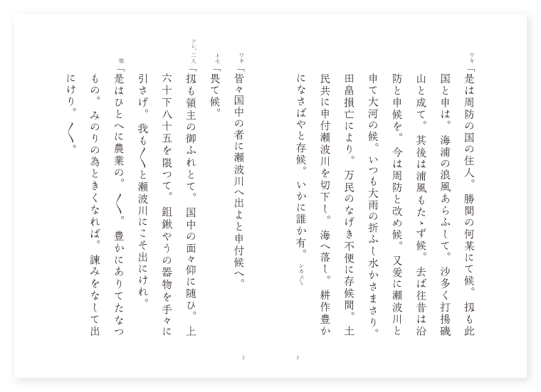 シテ 河伯 ワキ 瀬波の領主勝間某 ワキツレ 里人 トモ 勝間の臣 所 周防瀬波川 ワキ「是は周防の国の住人。勝間の何某にて候。扨も此国と申は。海浦の浪風あらふして。沙多く打揚磯山と成て。其後は浦風もたゝず候。去ば往昔は沿防と申候を。今は周防と改め候。又爰に瀬波川と申て大河の候。いつも大雨の折ふし水かさまさり。田畠損亡により。万民のなげき不便に存候間。土民共に申付瀬波川を切下し。海へ落し。耕作豊かになさばやと存候。いかに誰か有。(シカ〴〵) ワキ「皆々国中の者に瀬波川へ出よと申付候へ。 トモ「畏て候。 ツレ、二人「扨も領主の御ふれとて。国中の面々仰に随ひ。上六十下八十五を限つて。鉏鍬やうの器物を手々に引さげ。我も〳〵と瀬波川にこそ出にけれ。 歌「是はひとへに農業の。〳〵。豊かにありてたなつもの。みのりの為ときくなれば。諫みをなして出にけり。〳〵。 シテ「喃々あれ成人々。何とて其堤をば切おとし給ふぞ。 ワキ「さん候。此瀬波川の。海へも他国へも落ず。たゞ国を廻り。大雨の折ふしは水まさり。農事の障と成候故。此堤を切。海へ水を落し候。 シテ「尤仰はさる事なれ共。昔より此河を他国へ落す事もなきに。今あらたに落さんとは。心得がたきいひ事哉。 ワキ「不思議やな。見れば童子の姿にて。堤を切をあらそひいなむ。 詞「そも汝はいかなる者ぞ。 シテ「今は何をかつゝむべき。我は此川に年経て住る河伯士也。我独りのみに非ず。門葉広く数多眷属あり。代々を重て爰に住り。我いふ事を用ひずして。堤をはなし水を落さば。人民にたゝりて命を取べし。かまへて堤を切開き。後悔すなと気色をかへ。 同「さもみやびたる童形の。〳〵。其様はやく変じつゝ。面さながら沙丹塗の。軒の瓦の鬼と成。あたりを払ひ冷じき姿と成て。其儘河浪に入にけり。河瀬の波に入にけり。(中入) ワキ「ふしぎや今の童形。顔色かはり鬼神と成て。堤を制する有様也。然れ共かれは異形のなす業。殊に河伯が事なれば。何程の事か有べきなれども。若も此事さはりとならば。万民の悲しみも不便に候へば。当国一の宮玉祖の神に。祈誓かけばやと存候。勝間の何某。急ぎ神前に参り膝まづき。幣とりあへず逆手をうつて頓首し。仰ぎ願はくば。此度瀬波河の水を難なく切くださしめ。国の農業を安穏に守らせ給へ。寸善尺魔の河伯がたゝりを。他方へ退けおはしませと。丹誠をこらす。南無帰命頂礼玉祖の神。 里人カヽル「斯て時刻も移るとて。国中の諸民数百人。鉏鍬大籠石どうつき。思ひ〳〵に用意して。曳声を出して瀬波川の。堤を切て水をくだす。実おびただしき有様かな。 同「あれ〳〵見よや瀬波川の。〳〵。水上に河霧立くらがつて。渦浪をめぐらす其内より。化したる者のあまた顕れ。堤のあたりを取かこみ。いかれる姿に肝をけし。鉏鍬器物をなげ捨て。皆ちり〴〵に逃さりけり。 同「かゝりければふしぎやな。佐波の府中の玉祖の。社頭の方より白雲立て。神火飛ちり神通の鏑の音冷じく。瀬波川の堤の方へぞ飛行する。 シテ「其時河伯が眷属共。 同「其時河伯が眷属共。此神祟に恐れをなして。衆類を引つれ他方をさして退散すれば。人歩は悦び農具を以て。難なく堤を切ひらき。瀬波の大河を切くだし。耕作豊かに久堅の。天の玉祖威光を現じ。善哉々々と詔命して上らせ給へば。いよ〳〵国民にぎわひて。〳〵。栄ふる御代とぞ成にけり。 底本:国立国会図書館デジタルコレクション『古今謡曲解題』丸岡桂 著、『宴曲十七帖 謡曲末百番』国書刊行会 編
