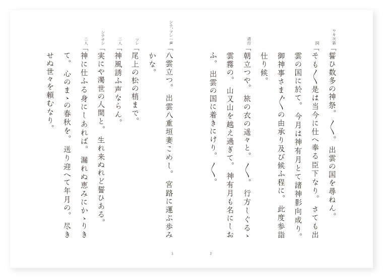 観世弥次郎作 前 ワキ 官人 シテ 宮人 ツレ 同じく 後 ツレ(天女) 御崎の神 ツレ(龍神) 海龍王 シテ 杵築大神 地は 出雲 季は 十月 ワキ次第「誓ひ数多の神祭。〳〵。出雲の国を尋ねん。 詞「そも〳〵是は当今に仕へ奉る臣下なり。さても出雲の国に於て。今月は神有月とて諸神影向成り。御神事さま〴〵の由承り及び候ふ程に。此度参詣仕り候。 道行「朝立つや。旅の衣の遥々と。〳〵。行方しぐるゝ雲霧の。山又山を越え過ぎて。神有月も名にしおふ。出雲の国に着きにけり。〳〵。 シテ、ツレ一声「八雲立つ。出雲八重垣妻こめし。宮路に運ぶ歩みかな。 ツレ「尾上の松の梢まで。 二人「神風誘ふ声ならん。 シテサシ「実にや濁世の人間と。生れ来ぬれど誓ひある。 二人「神に仕ふる身にしあれば。漏れぬ恵みにかゝりきて。心のまゝの春秋を。送り迎へて年月の。尽きせぬ世々を頼むなり。 下歌「いざや歩みを運ばん。〳〵。 上歌「いづくにか。神の宿らぬ陰ならん。〳〵。嶺も尾上も松杉も。山河海村野田。残る方なく神のます。御蔭を受けて隔てなき。宮人多き往来かな。〳〵。 ワキ詞「我出雲の国大社に参り。案内をうかゞふ所に。宮人あまた来れり。如何に方々に申すべき事の侯。 シテ詞「是は此あたりにては見馴れ申さぬ御事なり。何くよりの御参詣にて候ふぞ。 ワキ「さん候是は朝に隙なき身なれども。当国に於て今月は神有月とて。諸神残らず影向の地と承り及びて候へば。此度君に御暇を申し。遥々参詣申したり。 ツレ「実に有難や神と君との。 ワキ「隔てなき世のしるしとて。 シテ「歩みを運ぶ此神の。 ワキ「恵み普き。 シテ「月影も。 地「神の世を。思ひ出雲の宮柱。〳〵。ふとしき立ちて敷島の。大和島根まで。動かぬ国ぞ久しき。実にや紅も。深くなり行く梢より。しぐれて渡る深山辺の。里も冬立つ気色かな。〳〵。 ワキ詞「不知案内の事にて候へば。当社の神秘委しく御物語り候へ。 地クリ「そも〳〵出雲の国大社は。三十八社を勧請の地なり。 シテサシ「然るに五人の王子おはします。 地「第一はあじかの大明神と顕はれ給ふ。山王権現是なり。 シテ「第二には湊の大明神。 地「九州宗像の明神と顕はれ給ふ。第三は伊奈佐の速玉の神。常陸鹿島の明神とかや。 クセ「第四には鳥屋の大明神。信濃の諏訪の明神と。即ち現じおはします。第五には出雲路の大明神。伊予の三島の明神と。顕はれ給ふ御誓ひ。実に曇りなき長月や。月のみそかにとりわきて。 シテ「住吉一所は影向なる。 地「残りの神々は。十月一日の寅の時に。悉く影向なり。さま〴〵いろいろの神遊び。今も絶えせぬ此宮居。語るも中々。愚かなる誓ひなるべし。 ロンギ地「実に有難き物語り。〳〵。末世ながらも隔てなき。神の威光ぞあらたなる。 シテ「なか〳〵なれや年々に。今日の今宵の神遊び。 地「其役々も。 シテ「数々に。 地「あらぶる神達の舞歌の袖。引くや御注連の名は誰と。白木綿かくる玉垣に。立ち寄ると見えつるが。神の告ぞと言ひ捨てゝ。社壇に入りにけり。社壇の内に入りにけり。(中入) 地「しぐるゝ空も雲晴れて。月も輝く玉の御殿に。光りを添ふる気色かな。 天女「我は是れ。出雲の御崎に跡を垂れ。仏法王法を守りの神。本地十羅刹女の化現なり。 地「容顔美麗の女体の神。〳〵。光りもかゝやく玉のかんざし。かざしも匂ふ袂を返す。夜遊の舞楽はおもしろや。(天女舞) 地「実に類ひなき舞の袖。〳〵。靡くや雲の絶間より。諸神は残らず顕はれ給ひ。舞楽を奏し神前に飛行し。早とく姿を顕はし給へと。夕べの月も雲晴れて。光りも朱の玉垣かゝやき。神体顕はれおはします。 ロンギ地「実にや貴き御相好。〳〵。まのあたりなる神徳を。受くるも君の恵みかな。 シテ「とても夜遊の神祭。委しくいざや顕はし。彼客人を慰めん。 地「さて神楽の役々は。 シテ「住吉鹿島。 地「諏訪熱田。其外三千世界の諸神は。こゝに影向なり。とり〴〵の小忌の袖。返す〴〵も面白や。(楽) 地「舞楽も今は時過ぎて。〳〵。更け行く空もしぐるゝ雲の。沖よりはやて吹き立つ波は。海龍王の出現かや。 龍神「そも〳〵是は。海龍王とは我事なり。さても毎年龍宮より。黄金の箱に小龍を入れ。神前に捧げ申すなり。 地「龍神即ち顕はれて。〳〵。波をはらひ潮を退け。汀に上り御箱をすゑ置き。神前を拝し渇仰せり。其時龍神御箱の蓋を。忽ち開き。小龍を取り出だし。即ち神前に捧げ申し。海陸ともに治まる御代の。実に有難き恵みかな。 シテ「四海安全に国治まり。 地「四海安全に国治まつて。五穀成就福寿円満に。いよ〳〵君を守るべしと。木綿四手の数々。神々とり〴〵に御前を払ひ。神あげの御山に上らせ給へば。龍神平地に波浪を起し。逆巻く潮に引かれ行けば。諸神は虚空に遍満しつゝ。げにあらたなる神は社内。〳〵。龍神は海中に入りにけり。 底本:国立国会図書館デジタルコレクション『謡曲評釈 第五輯』大和田建樹 著