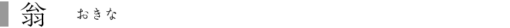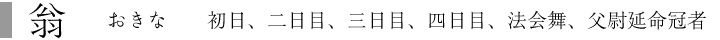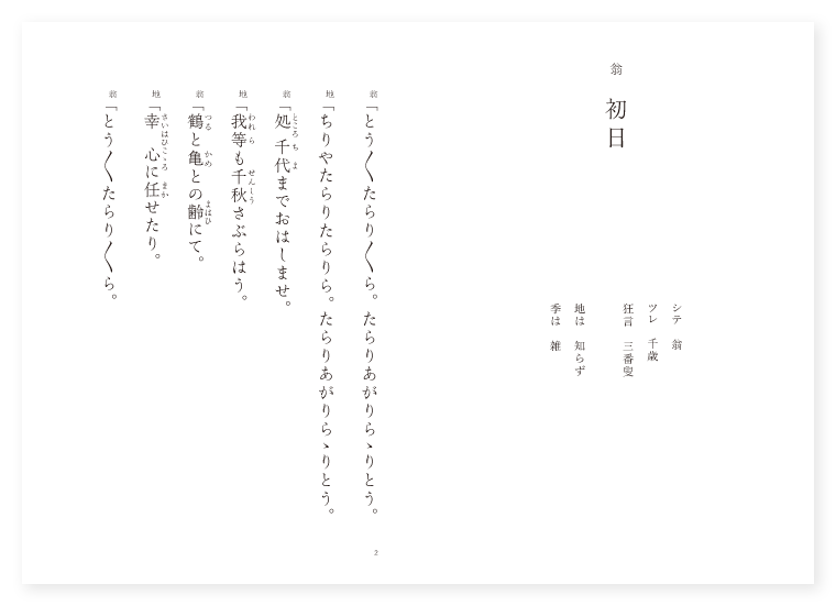 シテ 翁 ツレ 千歳 狂言 三番叟 地は 知らず 季は 雑 翁「とう〳〵たらり〳〵ら。たらりあがりらゝりとう。 地「ちりやたらりたらりら。たらりあがりらゝりとう。 翁「処千代までおはしませ。 地「我等も千秋さぶらはう。 翁「鶴と亀との齢にて。 地「幸心に任せたり。 翁「とう〳〵たらり〳〵ら。 地「ちりやたらりたらりら。たらりあがりらゝりとう。 千歳「鳴るは滝の水。〳〵。日は照るとも。 地「絶えずとうたり。ありうとうとうとう。 千歳「絶えずとうたり常にとうたり。(千歳舞) 千歳「処千代までおはしませ。 地「我等も千秋さぶらはう。 千歳「鶴と亀との齢にて。処は久しく栄え給ふべしや。鶴は千代経る君は如何経る。 地「万代こそ経れ。ありうとうとうとう。 翁「総角やとんどや。 地「尋ばかりやとんどや。 翁「やあ座して居たれども。 地「参らうれんげりやとんどや。 翁「松やさき翁や先に生れけん。いざ姫小松年くらべせん。 地「そよやりちやんや。 翁「およそ千年の鶴は。万歳楽と歌うたり。又万代の池の亀は。甲に三極をそなへたり。渚の砂索々として。朝の日の色を朗じ。滝の水冷々として。夜の月鮮かに浮んだり。天下泰平国土安穏。今日の御祈禱なり。在原や。なぞの翁ども。 地「あれはなぞの翁ども。そやいづくの翁。とう〳〵。 翁「そよや。(神ガク) 翁「千秋万歳の。歓びの舞なれば。一舞まはう万歳楽。 地「万歳楽。 翁「万歳楽。 地「万歳楽。 底本:国立国会図書館デジタルコレクション『謡曲評釈 第五輯』大和田建樹 著