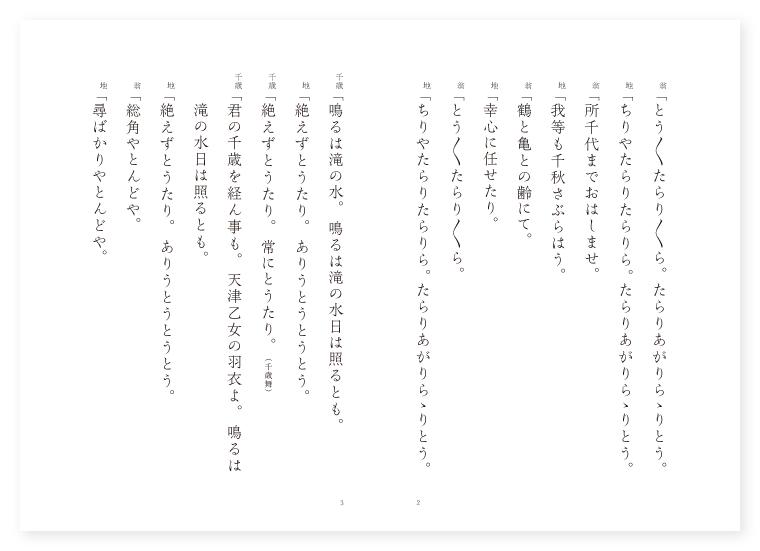 シテ 翁 ツレ 千歳 狂言 三番叟 地は 知らず 季は 雑 翁「とう〳〵たらり〳〵ら。たらりあがりらゝりとう。 地「ちりやたらりたらりら。たらりあがりらゝりとう。 翁「所千代までおはしませ。 地「我等も千秋さぶらはう。 翁「鶴と亀との齢にて。 地「幸心に任せたり。 翁「とう〳〵たらり〳〵ら。 地「ちりやたらりたらりら。たらりあがりらゝりとう。 千歳「鳴るは滝の水。鳴るは滝の水日は照るとも。 地「絶えずとうたり。ありうとうとうとう。 千歳「絶えずとうたり。常にとうたり。(千歳舞) 千歳「君の千歳を経ん事も。天津乙女の羽衣よ。鳴るは滝の水日は照るとも。 地「絶えずとうたり。ありうとうとうとう。 翁「総角やとんどや。 地「尋ばかりやとんどや。 翁「やあ座して居たれども。 地「参らうれんげりやとんどや。 翁「千早振。神のひこさの昔より。久しかれとぞ祝ひ。 地「そよやりちやんや。 翁「凡そ千年の鶴は。万歳楽と歌うたり。又万代の池の亀は。甲に三極を備へたり。渚の砂索々として。朝の日の色を朗じ。滝の水冷々として。夜の月あざやかに浮んだり。天下泰平国土安穏。今日の御祈禱なり。在原やなぞの翁ども。 地「あれはなぞの翁ども。そや何くの翁とうとう。 翁「そよや。(神ガク) 翁「千秋万歳の歓びの舞なれば。一舞まはう万歳楽。 地「万歳楽。 翁「万歳楽。 地「万歳楽。 底本:国立国会図書館デジタルコレクション『謡曲評釈 第五輯』大和田建樹 著