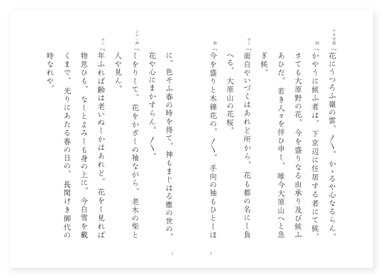 禅竹作 前 ワキ 都の人 シテ 樵の翁 後 ワキ 前に同じ シテ 在原業平 地は 山城 季は 三月 ワキ次第「花にうつろふ嶺の雲。〳〵。かゝるや心なるらん。 詞「かやうに候ふ者は。下京辺に住居する者にて候。さても大原野の花。今を盛りなる由承り及び候ふあひだ。若き人々を伴ひ申し。唯今大原山へと急ぎ候。 サシ「面白やいづくはあれど所から。花も都の名にし負へる。大原山の花桜。 歌「今を盛りと木綿花の。〳〵。手向の袖もひとしほに。色そふ春の時を得て。神もまじはる塵の世の。花や心にまかすらん。〳〵。 シテ一声「しをりして。花をかざしの袖ながら。老木の柴と人や見ん。 サシ「年ふれば齢は老いぬしかはあれど。花をし見れば物思ひも。なしとよみしも身の上に。今白雪を戴くまで。光りにあたる春の日の。長閑けき御代の時なれや。 歌「散りもせず。咲きも残らぬ花ざかり。〳〵。四方のけしきも一しほに。にほひ満ち色にそふ。情の道にさそはるゝ。老な厭ひそ花心。〳〵。 ワキ詞「ふしぎやな貴賤群集の其中に。ことに年たけたる老人花の枝をかざし。さも花やかに見え給ふは。そも何くより来り給ふぞ。 シテ「思ひよらずや貴賤の中に。わきて言葉をかけ給ふは。さも心なき山賤の。身にも応ぜぬ花ずきぞと。お笑ひあるか人々よ。姿こそ山のかせきに似たりとも。心は花にならばこそ。なさばならめや心からに。 地「をかしとこそは御覧ずらめ。よしや此身は埋木の。朽ちは果てし無や心の。色も香も知る人ぞ。知らずな問はせ給ひそ。 ワキ詞「あら面白のたはぶれやな。よも誠には腹立ち給はじ。いか様故ある心言葉の。奥床しきを語り給へ。 シテ詞「何と語らん花盛り。いふに及ばぬけしきをば。いかゞは思ひ給ふらん。 ワキ「げに〳〵妙なる梢の色。うつろふ影も大原や。 シテ詞「小塩の山の小松が原より。煙る霞の遠山桜。 ワキ「里は軒端の家ざくら。 シテ「匂ふや窓の梅もさき。 ワキ「あかねさす日も紅の。 シテ「かすみか。 ワキ「雲か。 シテ「八重。 ワキ「九重の。 地「都辺は。なべて錦と為りにけり。〳〵。桜を織らぬ人し無き。花衣着にけりな。時も日も月もやよひ。逢ひにあふ詠めかな。げにや大原や。小塩の山も今日こそは。神代も思ひ知られけれ。〳〵。 ワキ詞「かゝる面白き人に参りあひて候ふ物かな。此まゝ御供申し花を詠めうずるにて候。又唯今の言葉のすゑに。大原や小塩の山も今日こそは。 詞「神代の事も思ひ出づらめ。今所から面白う候。是は如何なる人の御詠歌にて候ふぞ。 シテ詞「事あたらしき問事かな。此大原野の行幸に。在原の業平供奉し給ひし時。かたじけなくも后の御事を思ひいでゝ。神代の事とはよみしとなり。申すにつけて我ながら。空おそろしや天地の。神の御代より人の身の。妹背の道は浅からぬ。 地「名残をしほの山深み。〳〵。のぼりての世の物語。かたるも昔男。あはれ旧りぬる身の程。歎きてもかひなかりけり。歎きてもかひぞなかりける。 ロンギ地「げに山賤のさしもげに。しわふるびとゝ見ゆるにも。心ありける姿かな。 シテ「心知らればとても身の。姿に恥ぢぬ花の友に。馴れてさらばまじらん。 地「まじれやまじれ老人の。心若木の花の枝。 シテ「老隠るやとかざゝん。 地「かざしの袖を引き引かれ。このもかのもの陰ごとに。 シテ「貴賤の花見。 地「輿車の。花のながえをかざしつれて。よろぼひさぞらひ。とり〴〵にめぐる盃の。天も花にや酔へるらん。紅うづむ夕霞。かげろふ人の面影。ありと見えつゝ失せにけり。〳〵。(中入) ワキ詞「ふしぎや今の老人の。唯人ならず見えつるが。さては小塩の神代の古跡。和光の影に業平の。花に詠じて衆生済度の。姿顕はし給ふぞと。 歌「思ひの露もたまさかの。〳〵。光りを見るも花心。妙なる法の道のべに。猶も奇特を待ち居たり。〳〵。 後ジテ「月やあらぬ春や昔の春ならぬ。我身ぞ本の身も知らじ。 ワキ「ふしぎやな今までは。立つとも知らぬ花見車の。やごとなき人の御有様。是は如何なる事やらん。 シテ「げにや及ばぬ雲の上。花の姿はよも知らじ。 詞「有りし神代の物語り。姿顕はすばかりなり。 ワキ「あら有難の御事や。他生の縁は朽ちもせで。 シテ「契りし人も様々に。 ワキ「思ひぞいづる。 シテ「花も今。 地「今日こずは。あすは雪とぞ降りなまし。〳〵。消えずはありと。花と見ましやと詠ぜしに。今はさながら花も雪も。皆白雲の上人の。桜かざしの袖ふれて。花見車くるゝより。月の花よ待たうよ。 地クリ「それ春宵一刻価千金。花に清香月に陰。惜しまるべきは只此時なり。 シテサシ「思ふ事いはで唯にや止みぬべき。 地「我にひとしき人しなければ。とは思へども人しれぬ。心の色はおのづから。思ひ内より言の葉の。露しな〴〵に洩れけるぞや。 クセ「春日野の。若紫のすり衣。しのぶの乱れ。限りしらずもと詠ぜしに。陸奥の忍ぶもぢずり誰故。乱れんと思ふ我ならなくにと。よみしも紫の。色に染み香にめでし