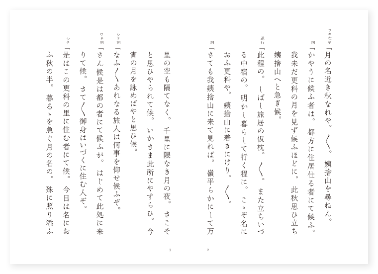 世阿弥作 前 ワキ 都の人 シテ 里女 後 ワキ 前に同じ シテ 老女 地は 信濃 季は 八月 ワキ次第「月の名近き秋なれや。〳〵。姨捨山を尋ねん。 詞「かやうに候ふ者は。都方に住居仕る者にて候ふ。我未だ更科の月を見ず候ふほどに。此秋思ひ立ち姨捨山へと急ぎ候。 道行「此程の。しばし旅居の仮枕。〳〵。また立ちいづる中宿の。明かし暮らして行く程に。こゝぞ名におふ更科や。姨捨山に着きにけり。〳〵。 詞「さても我姨捨山に来て見れば。嶺平らかにして万里の空も隔てなく。千里に隈なき月の夜。さこそと思ひやられて候。いかさま此所にやすらひ。今宵の月を詠めばやと思ひ候。 シテ詞「なふ〳〵あれなる旅人は何事を仰せ候ふぞ。 ワキ詞「さん候是は都の者にて候ふが。はじめて此処に来りて候。さて〳〵御身はいづくに住む人ぞ。 シテ「是はこの更科の里に住む者にて候。今日は名におふ秋の半。暮るゝを急ぐ月の名の。殊に照り添ふ天の原。くまなき四方の気色かな。いかに今宵の月の面白からんずらん。 ワキ「さては更科の人にてましますかや。さて〳〵古へ姨捨の。在所はいづくの程にて候ふぞ。 シテ「姨捨山のなき跡と。問はせ給ふは心得ぬ。我心慰めかねつ更科や。姨捨山に照る月を見てと。詠ぜし人の跡ならば。是に小高き桂の木の。陰こそ昔の姨捨の。其なき跡にて候へとよ。 ワキ「さては此木の陰にして。捨て置かれにし人の跡の。 シテ「其まゝ土中に埋草。かりなる世とて今は早。 ワキ「昔語りになりし人の。猶執心や残りけん。 シテ「なき跡までも何とやらん。 ワキ「物すさましき此原の。 シテ「風も身にしむ。 ワキ「秋の心。 地「今とても。なぐさめかねつ更科や。〳〵。姨捨山の夕暮に。松も桂もまじる木の。緑も残りて秋の葉の。はや色づくか一重山。薄霧も立ちわたり。風冷ましく雲尽きて。さびしき山の気色かな。〳〵。 シテ詞「旅人はいづくより来り給ふぞ。 ワキ「されば以前も申すごとく。都の者にて候ふが。更科の月を承り及び。始めて此所に来りて候ふよ。 シテ「さては都の人にてましますかや。さあらば妾も月と共に。顕はれ出でゝ旅人の。夜遊を慰め申すべし。 ワキ「そもや夜遊を慰めんとは。御身はいかなる人やらん。 シテ「誠は我は更科の者。 ワキ「さていまは又何方に。 シテ「住家といはんは此山の。 ワキ「名にしおひたる。 シテ「姨捨の。 地「それといはんも恥かしや。〳〵。其古へも捨てられて。只一人此山に。澄む月の名の秋毎に。執心の闇を晴らさんと。今宵顕はれ出でたりと。夕陰の木の本に。かき消すやうに失せにけり。〳〵。(中入) ワキ歌「夕陰すぐる月影の。〳〵。はや出で初めて面白や。万里の空も隈なくて。いづくの秋も隔てなき。心もすみて夜もすがら。三五夜中の新月の色。二千里の外の故人の心。 後ジテ「あら面白のをりからやな。あら面白のをりからや。明けば又秋の半も過ぎぬべし。今宵の月の惜しきのみかは。さなきだに秋待ちかねてたぐひなき。名を望月の見しだにも。おぼえぬ程に隈もなき。姨捨山の秋の月。余りに堪へぬ心とや。昔とだにも思はぬぞや。 ワキ「不思議やな早更けすぐる月の夜に。白衣の女人あらはれ給ふは。夢か現か覚束な。 シテ「夢とはなどや夕暮に。顕はれ出でし老の姿。恥かしながら来りたり。 ワキ「何をか包み給ふらん。本より処も姨捨の。 シテ「山は老女が住処の。 ワキ「昔に帰る秋の夜の。 シテ「月の友人円居して。 ワキ「草を敷き。 シテ「花に起き臥す袖の露の。 二人「さも色々の夜遊の人に。いつ馴れそめてうつゝなや。 地「盛ふけたる女郎花の。〳〵。草衣しほたれて。昔だに。捨てられしほどの身を知らで。又姨捨の山に出でゝ。面を更科の。月に見ゆるも恥かしや。よしや何事も夢の世の。中々いはじ思はじや。思草花にめで。月に染みて遊ばん。 地クリ「実にや興にひかれて来り。興尽きて帰りしも。今のをりかと知られたる。今宵の空の気色かな。 シテサシ「然るに月の名所。何くはあれど更科や。 地「姨捨山の曇りなき。一輪満てる清光の影。団々として海嶠を離る。 シテ「然れば諸仏の御誓ひ。 地「いづれ勝劣なけれども。超世の悲願あまねき影。弥陀光明に若くはなし。 クセ「さるほどに。三光西に行く事は。衆生応して西方に。すゝめ入れんが為めとかや。月は彼如来の右の脇士として。有縁を殊に導き。重き罪を軽んずる。天上の力を得る故に。大勢至とは号すとか。天冠の間に。花の光りかゝやき。玉の台の数々に。他方の浄土をあらはす。玉珠楼の風の音。糸竹の調べとり〴〵に。心ひかるゝ方もあり。はち色々に咲きまじる。宝の池の辺に。立つや並木の花ちりて。芬芳しきりに乱れたり。 シテ「迦陵頻伽のたぐひなき。 地「声をたぐへて諸共に。孔雀鸚鵡の同じく。囀づる鳥のおのづから。光りも影もおしなべて。至らぬ隈もなければ。無辺光とは名づけたり。然れども雲月の。ある時は影満ち。又ある時は影欠くる。有為転変の世