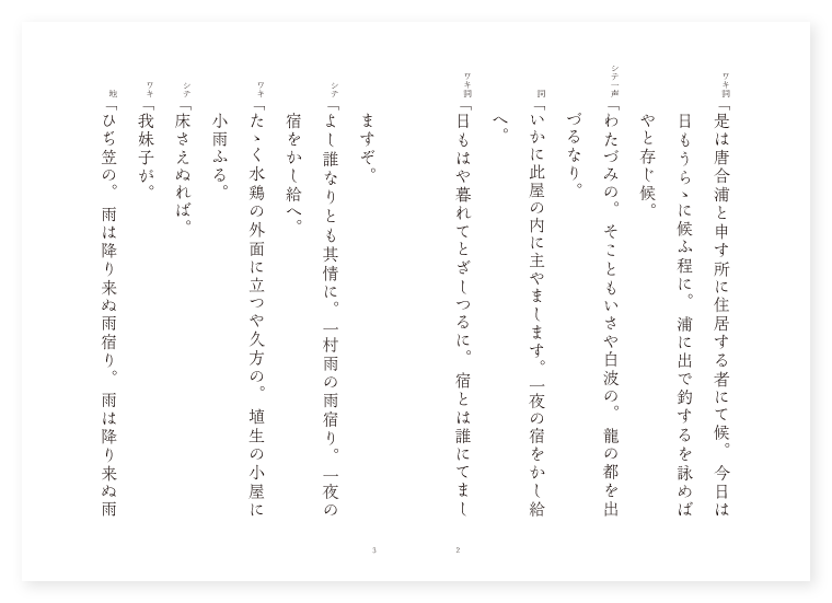 前 ワキ 合浦の里人 シテ 童子 後 シテ 鮫人 地は 唐土 季は 夏 ワキ詞「是は唐合浦と申す所に住居する者にて候。今日は日もうらゝに候ふ程に。浦に出で釣するを詠めばやと存じ候。 シテ一声「わたづみの。そこともいさや白波の。龍の都を出づるなり。 詞「いかに此屋の内に主やまします。一夜の宿をかし給へ。 ワキ詞「日もはや暮れてとざしつるに。宿とは誰にてましますぞ。 シテ「よし誰なりとも其情に。一村雨の雨宿り。一夜の宿をかし給へ。 ワキ「たゝく水鶏の外面に立つや久方の。埴生の小屋に小雨ふる。 シテ「床さえぬれば。 ワキ「我妹子が。 地「ひぢ笠の。雨は降り来ぬ雨宿り。雨は降り来ぬ雨宿りの。頼む木陰かや。一樹の陰のやどりも。此世ならぬ契なり。一河の流れを汲みて知る。合浦の浦の江のほとり。鱗もなどや命恩の。其情をば知らざらん。〳〵。 ワキ詞「何と見申せども更に人間とは見え給はず候。名を御なのり候へ。 シテ「今は何をかつゝむべき。我は鮫人といへる魚の精なり。命をつがれまゐらせし。報謝の為めに来りたり。我泣く涙の露の玉。絶えぬ宝となるべきなり。 地「鮫人涙に。玉をなして命恩を。宝珠をなほも捧げて。合浦にも入らせ給へと。前なる渚の波の上に。入るよと見えつるが。白魚となつて其まゝに。ひれふして失せにけり。あとひれふして失せにけり。(中入) 後ジテ「龍女は如意の宝珠を釈尊に捧げ。変成就の法をなし。 地「奈落や奈落の底の白魚なれども。など命恩を報ぜざらんと。波立ちさわぎ汐うづまいて。うたかたの上にぞ顕はれたる。 シテ「是こそ真如の玉の緒の。 地「是こそ真如の玉の緒の。寿命長遠息災延命の宝の玉は。当来までの。二世の願ひも成就なるべし。是までなりや。織りつる綾の浦は合浦。玉はふたゝび帰る波の。千秋万歳の宝の玉は。〳〵。合浦の浦にぞをさまりける。 底本:国立国会図書館デジタルコレクション『謡曲評釈 第二輯』大和田建樹 著