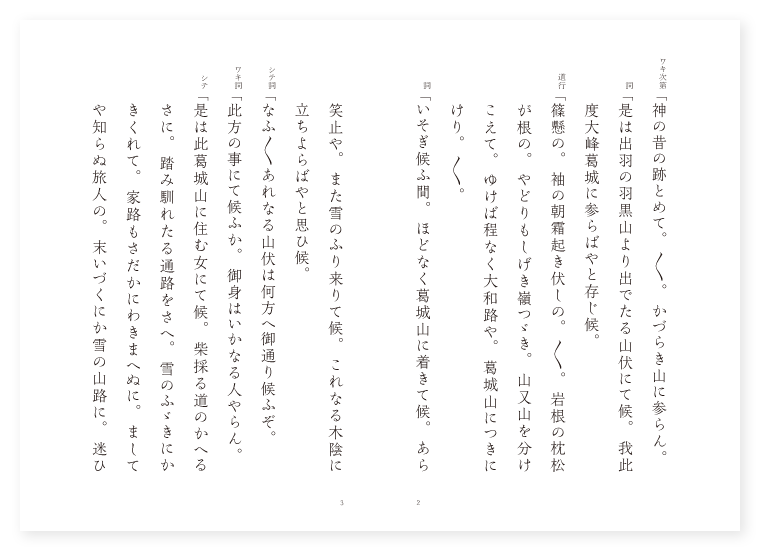 世阿弥作 前 ワキ 羽黒山の山伏 シテ 里女 後 ワキ 前に同じ シテ 葛城の神 地は 大和 季は 冬 ワキ次第「神の昔の跡とめて。〳〵。かづらき山に参らん。 詞「是は出羽の羽黒山より出でたる山伏にて候。我此度大峰葛城に参らばやと存じ候。 道行「篠懸の。袖の朝霜起き伏しの。〳〵。岩根の枕松が根の。やどりもしげき嶺つゞき。山又山を分けこえて。ゆけば程なく大和路や。葛城山につきにけり。〳〵。 詞「いそぎ候ふ間。ほどなく葛城山に着きて候。あら笑止や。また雪のふり来りて候。これなる木陰に立ちよらばやと思ひ候。 シテ詞「なふ〳〵あれなる山伏は何方へ御通り候ふぞ。 ワキ詞「此方の事にて候ふか。御身はいかなる人やらん。 シテ「是は此葛城山に住む女にて候。柴採る道のかへるさに。踏み馴れたる通路をさへ。雪のふゞきにかきくれて。家路もさだかにわきまへぬに。ましてや知らぬ旅人の。末いづくにか雪の山路に。迷ひ給ふはいたはしや。見苦しく候へども。わらはが庵にて一夜を御あかし候へ。 ワキ「うれしくも仰せ候ふ物かな。今にはじめぬ此山の度々峰入して。通ひなれたる山路なれども。今の雪吹に前後を忘じて候ふに。御志ありがたうこそ候へ。さて御宿りはいづくぞや。 シテ「此岨づたひのあなたなる。谷の下庵みぐるしくとも。程ふる雪の晴間まで。御身をやすめ給ふべし。 ワキ「さらば御供申さんと。夕べの山の常陰より。 シテ「さらでも嶮しき岨づたひを。 ワキ「道しるべする山人の。 シテ「笠はおもし呉山の雪。 二人「靴は香ばし楚地の花。 地「肩上の笠には。〳〵。無影の月をかたぶけ。担頭の柴には。不香の花を手折りつゝ。帰る姿や山人の。笠も薪も埋もれて。雪こそくだれ谷の道を。たどり〳〵帰りきて。柴のいほりに着きにけり。〳〵。 ワキ詞「あらうれしや候。今の雪に前後を忘じて候ふ処に。こよひの御宿かへす〴〵も有りがたうこそ候へ。 シテ詞「あまりに夜寒に候ふ程に。是なるしもとを解きみだし。火に焼きてあて参らせ候ふべし。 ワキ「あらおもしろやしもとゝは此木の名にて候ふか。 シテ「うたてやな此葛城山の雪の内に。結ひあつめたる木々の梢を。しもとゝ知ろしめされぬは御心なきやうにこそ候へ。 ワキ「あらおもしろやさては此。しもとゝ言ふ木は葛城山に。由緒ある木にて候ふよなふ。 シテ「申すにや及ぶ古き歌の言葉ぞかし。しもとを結ひたる葛なるを。此葛城山の名に寄せたり。是れ大和舞の歌といへり。 ワキ「げに〳〵ふるき大和舞の。歌の昔を思ひでの。 シテ「をりから雪も。 ワキ「降るものを。 地「しもとゆふ。葛城山にふる雪は。〳〵。間なく時なく。おもほゆるかなとよむ歌の。言の葉そへて大和舞の。袖の雪も古き世の。よそにのみ。見し白雲や高間山の。嶺の柴屋の夕煙。松が枝そへて焼かうよ。〳〵。 クセ「葛城や。木の間にひかる稲妻は。山伏の打つ火かとこそ見れ。実にや世の中は。電光朝露石の火の。ひかりの間ぞと思へたゞ。わが身のなげきをも。取り添へて。思ひ真柴を焼かうよ。 シテ「捨人の。苔の衣の色ふかく。 地「法にこゝろは墨染の。袖もさながら白妙の。雪にや色をそみかくたの。篠懸もさえまさる。しもとをあつめ柴をたき。寒風をふせぐ葛城の。山伏の名にし負ふ。かたしく袖の枕して。身を休め給へや。御身を休め給へや。 ワキ詞「あらうれしや篠懸を乾して候ふぞや。いそぎ後夜の勤めをはじめばやとおもひ候。 シテ詞「御勤めとは有難や。我に悩める心あり。御つとめのついでに祈り加持して賜はり候へ。 ワキ「そも御身に悩む事ありとは。何といひたる事やらん。 シテ「さなきだに女は五障の罪ふかきに。法のとがめの咒詛を負ひ。此山の名にしおふ。蔦かづらにて身を戒めて。猶三熱のくるしみあり。此身を助けてたび給へ。 ワキ「そも神ならで三熱の。くるしみといふ事あるべきか。 シテ「はづかしながら古への。法の岩橋かけざりし。其とがめとて明王の。さつくにて身をいましめて。今に苦しみ絶えぬ身なり。 ワキ「是はふしぎの御事かな。さては昔の葛城の。神の苦しみ尽きがたき。 シテ「石は一つの神体として。 ワキ「蔦かづらのみかゝる巌の。 シテ「撫づとも尽きじ葛の葉。 ワキ「はひ広ごりて。 シテ「露に置かれ。 二人「霜に責められ起き伏しの。立居もおもき岩戸のうち。 地「明くるわびしきかづらきの。神に五衰のくるしみあり。祈り加持してたび給へと。岩橋のすゑ絶えて。神がくれにぞなりにける。〳〵。(中入) ワキ歌「岩橋の。苔の衣の袖そへて。〳〵。法の莚のとことはに。法味をなして夜もすがら。彼葛城の神ごゝろ。夜の行ひ声すみて。一心敬礼。 後ジテ「われ葛城の夜もすがら。和光の影にあらはれて。五衰の眠を無上正覚の月にさまし。法性真如の宝の山に。法味に引かれて来りたり。よく〳〵勤めおはしませ。 ワキ「ふしぎやな峨々たる山の常陰より。女体の神とおぼしくて。玉のかんざし玉かづらの。なほ懸けそへて蔦