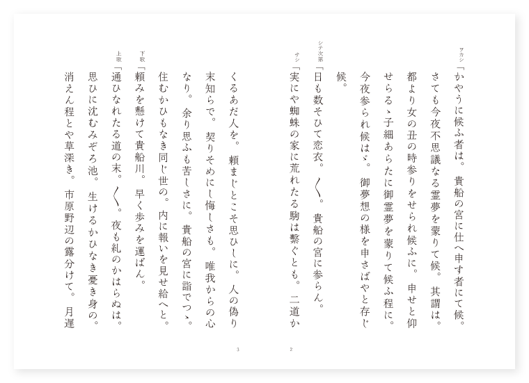 世阿弥作 前 ヲカシ 貴船社人 シテ 都の女 後 男 夫 ワキ 安倍晴明 シテ 女の生霊 地は 京都 季は 雑 ヲカシ「かやうに候ふ者は。貴船の宮に仕へ申す者にて候。さても今夜不思議なる霊夢を蒙りて候。其謂は。都より女の丑の時参りをせられ候ふに。申せと仰せらるゝ子細あらたに御霊夢を蒙りて候ふ程に。今夜参られ候はゞ。御夢想の様を申さばやと存じ候。 シテ次第「日も数そひて恋衣。〳〵。貴船の宮に参らん。 サシ「実にや蜘蛛の家に荒れたる駒は繫ぐとも。二道かくるあだ人を。頼まじとこそ思ひしに。人の偽り末知らで。契りそめにし悔しさも。唯我からの心なり。余り思ふも苦しさに。貴船の宮に詣でつゝ。住むかひもなき同じ世の。内に報いを見せ給へと。 下歌「頼みを懸けて貴船川。早く歩みを運ばん。 上歌「通ひなれたる道の末。〳〵。夜も糺のかはらぬは。思ひに沈むみぞろ池。生けるかひなき憂き身の。消えん程とや草深き。市原野辺の露分けて。月遅き夜の鞍馬川。橋を過ぐれば程もなく。貴船の宮に着きにけり。〳〵。 詞「急ぎ候ふ程に。貴船の宮に着きて候。心静に参詣申さうずるにて候。 ヲカシ「如何に申すべき事の候。御身は都より丑の時参り召さるゝ御方にて渡り候ふか。今夜御身の上を御夢想に蒙りて候。御申し有る事ははや叶ひて候。鬼になりたきとの御願にて候ふ程に。我屋へ御帰りあつて。身には赤き衣を着。顔には丹を塗り頭には鉄輪を戴き。三つの足に火を灯し。怒る心を持つならば。忽ち鬼神と御なりあらうずるとの御告にて候。急ぎ御帰りあつて告の如く召され候へ。なんぼう奇特なる御告にて御座候ふぞ。 シテ詞「是は思ひもよらぬ仰にて候。わらはが事にては有るまじく候。定めて人違にて候ふべし。 ヲカシ「いや〳〵しかとあらたなる御夢想にて候ふ程に。御身の上にて候ふぞ。かやうに申す内に何とやらん恐ろしく見え給ひて候。急ぎ御帰り候へ。 シテ「是は不思議の御告かな。先々我屋に帰りつゝ。夢想の如く為るべしと。 地「いふより早く色変はり。〳〵。気色変じて今までは。美女の形と見えつる。緑の髪は空ざまに。立つや黒雲の。雨降り風と鳴神も。思ふ中をば避けられし。恨みの鬼と為つて。人に思ひ知らせん。憂き人に思ひ知らせん。(中入) 男詞「かやうに候ふ者は。下京辺に住居する者にて候。我此間うち続き夢見悪しく候ふ程に。晴明の許へ立ち越え。夢の様をも占はせ申さばやと存じ候。如何に案内申し候。 ワキ詞「誰にて渡り候ふぞ。 男「さん候下京辺の者にて候ふが。此程うち続き夢見悪しく候ふ程に。尋ね申さん為めに参りて候。 ワキ「あら不思議や。考へ申すに及ばず。是は女の恨みを深く蒙りたる人にて候。殊に今夜の内に。御命も危く見え給ひて候。若し左様の事にて候ふか。 男「さん候何をか隠し申すべき。我本妻を離別し。新しき妻を語らひて候ふが。若し左様の事にてもや候ふらん。 ワキ「実に左様に見えて候。彼者仏神に祈る数積つて。御命も今夜に究つて候ふ程に。某が調法には叶ひがたく候。 男「是まで参り御目に懸り候ふ事こそ幸にて候へ。平に然るべき様に御祈念有つて賜はり候へ。 ワキ「此上は何ともして御命を転じかへて参らせうずるにて候。急いで供物を御調へ候へ。 ワキ「いで〳〵転じかへんとて。茅の人形を人尺に作り。夫婦の名字を内に籠め。三重の高棚五色の幣。おの〳〵供物を調へて。肝胆を砕き祈りけり。謹上再拝。夫れ天開け地固まつしよりこのかた。伊奘諾伊奘冊尊。天の磐座にして。みとのまくばひ有りしより。男女夫婦のかたらひをなし。陰陽の道ながく伝はる。それに何ぞ魍魎鬼神妨げをなし。非業の命を取らんとや。 地「大小の神祇。諸仏菩薩。明王部天童部。九曜七星二十八宿を驚かし奉り。祈れば不思議や雨降り風落ち。神鳴り稲妻頻りに満ち満ち。御幣もざゞめき鳴動して。身の毛よだちて恐ろしや。 後ジテ「夫れ花は斜脚の暖風に開けて。同じく暮春の風に散り。月は東山より出でゝ早く西嶺に隠れぬ。世上の無常かくの如し。因果は車輪の廻るが如く。我に憂かりし人々に。忽ち報いを見すべきなり。恋の身の浮ぶ事なき鴨川に。 地「沈みしは水の青き鬼。 シテ「我は貴船の河瀬の蛍火。 地「頭に戴く鉄輪の足の。 シテ「焰の赤き鬼と為つて。 地「臥したる男の枕に寄り添ひ。如何に殿御よ珍らしや。 シテ「恨めしや御身と契りし其時は。玉椿の八千代二葉の松の末かけて。変はらじとこそ思ひしに。などしも捨ては果て給ふらん。あら恨めしや。捨てられて。 地「捨てられて。思ふ思ひの涙に沈み。人を恨み。 シテ「夫をかこち。 地「ある時は恋しく。 シテ「又は恨めしく。 地「起きても寐ても忘れぬ思ひの。因果は今ぞと白雪の。消えなん命は今宵ぞ。痛はしや。 地「悪しかれと。思はぬ山の峰にだに。〳〵。人の歎きは生ふなるに。いはんや年月。思ひに沈む恨みの数。積つて執心の。鬼となるも理や。 シテ「いで〳〵命を取らん。 地「いで〳〵命を