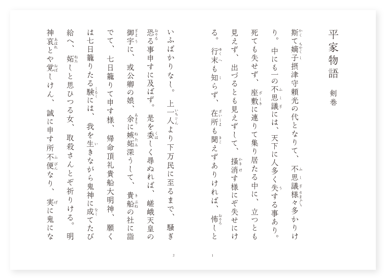 斯て嫡子摂津守頼光の代となりて、不思議様々多かりけり。中にも一の不思議には、天下に人多く失する事あり。死ても失せず、座敷に連りて集り居たる中に、立つとも見えず、出づるとも見えずして、搔消す様にぞ失せにける。行末も知らず、在所も聞えずありければ、怖しといふばかりなし。上一人より下万民に至るまで、騒ぎ恐る事申すに及ばず。是を委しく尋ぬれば、嵯峨天皇の御宇に、或公卿の娘、余に嫉妬深うして、貴船の社に詣でて、七日籠りて申す様、帰命頂礼貴船大明神、願くは七日籠りたる験には、我を生きながら鬼神に成てたび給へ、妬しと思ひつる女、取殺さんとぞ祈りける。明神哀とや覚しけん、誠に申す所不便なり、実に鬼になりたくば、姿を改めて、宇治の河瀬に行きて、三七日漬れと示現あり。女房悦びて都に帰り、人なき処にたて籠りて、長なる髪をば五つに分け、五つの角にぞ造りける。顔には朱を指し、身には丹を塗り、鉄輪を戴きて、三つの足には松を燃し、続松を拵へて、両方に火をつけて、口にくはへつゝ、夜更け人定りて後、大和大路へ走り出で、南を指して行きければ、頭より五つの火燃上り、眉太く、鉄漿にて、面赤く、身も赤ければ、さながら鬼形に異ならず。是を見る人、肝魂を失ひ倒れ伏し、死せずといふ事なかりけり。斯の如くして、宇治の河瀬に行きて、三七日漬りければ、貴船社の計にて、生きながら鬼となりぬ。宇治の橋姫とは是なるべし。さて妬しと思ふ女、其ゆかり、我をすさむ男の親類、境界、上下をも選ばず、男女をも嫌はず、思ふ様にぞ取り失ふ。男を取らんとては女に変じ、女を取らんとては男に変じて人をとる。京中の貴賤、申の時より下になりぬれば、人をも入れず、出づる事もなし。門を閉ぢてぞ侍りける。 底本:国立国会図書館デジタルコレクション『平家物語』永井一孝 校