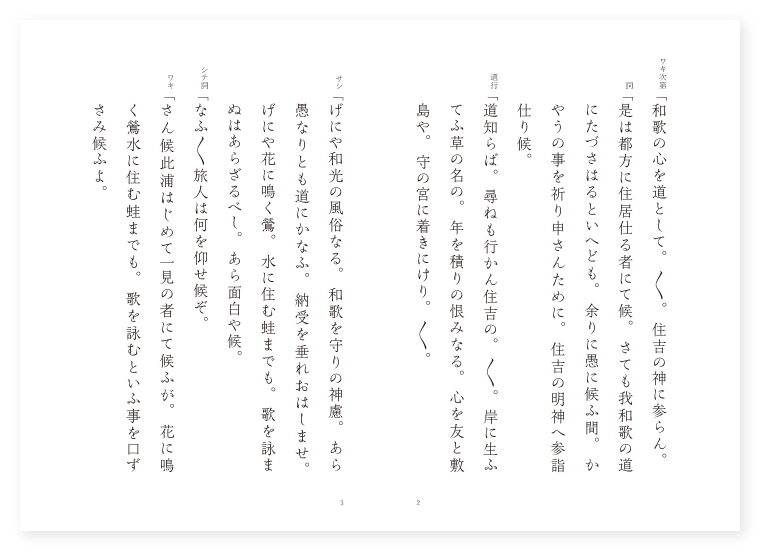 前 ワキ 都の人 シテ 里女 後 ワキ 前に同じ シテ 蛙の精 地は 摂津 季は 雑 ワキ次第「和歌の心を道として。〳〵。住吉の神に参らん。 詞「是は都方に住居仕る者にて候。さても我和歌の道にたづさはるといへども。余りに愚に候ふ間。かやうの事を祈り申さんために。住吉の明神へ参詣仕り候。 道行「道知らば。尋ねも行かん住吉の。〳〵。岸に生ふてふ草の名の。年を積りの恨みなる。心を友と敷島や。守の宮に着きにけり。〳〵。 サシ「げにや和光の風俗なる。和歌を守りの神慮。あら愚なりとも道にかなふ。納受を垂れおはしませ。げにや花に鳴く鶯。水に住む蛙までも。歌を詠まぬはあらざるべし。あら面白や候。 シテ詞「なふ〳〵旅人は何を仰せ候ぞ。 ワキ「さん候此浦はじめて一見の者にて候ふが。花に鳴く鶯水に住む蛙までも。歌を詠むといふ事を口ずさみ候ふよ。 シテ「さればこそ鶯の歌はよその例し。蛙の歌は此浦に。由緒ある事にて候ふ物を。 ワキ「あら面白や蛙の歌は。由緒は如何に語り給へ。 シテ「昔し此浦に詣で候ふ都の人。江による蛙のみなはとをく。 ワキ「あはれ昔のためしを残して。 シテ「今も囀る蛙の歌は。 地「住吉の。海士の見るめも忘れねば。〳〵。仮にぞ人に又訪はれぬると。詠みし歌もこの浦の。所から住吉の。海士の囀にあらずや。面白や雁なきて。菊の花さく秋あれど。春の海辺に住吉の。浦の名までもなつかしや。〳〵。 クリ地「それ敷島の道のしるべ。此御神の守りとして。国土ゆたかに民安し。 サシ「昔し壱岐の守何がしと申しゝ雲の上人。あからさまなる此宮地に。行きとゞまりし海士乙女の。仮の苫屋の浜庇。久にもあらぬ一夜の契。思ひの妻となりたるなり。 クセ「其まゝきぬ〴〵の。袖の名残も引き留むる。心ならずも帰るさに。年月つもる心地して。又この浦に立ち帰る。問へば行方も白波の。あはれはかなき契ゆゑ。面影のこる海ぎはに。さそらへ出でし夕まぐれ。浜の真砂の踏み渡る。蛙の道の跡みれば。有りし言の葉あらはるゝ。心を知れば疑ひも。 シテ「涙ながらもつく〴〵と。 地「思へばよしな人界も。水の底なるうろくづや。藻に住む蛙うたかたの。あはれ江による心なれば。六趣四生にめぐりめぐる。車の輪の如く。鳥の翅や花に鳴く。鶯も同じ御法なる。言の葉を囀る。蛙こそためしなりけれ。 ロンギ地「げにや蛙の物語。委しく語りおはします。御身いかなる人やらん。 シテ「此身はさすが住吉と。海士はいふとも長居せし。姿やさても顕はれん。 地「あらはれ給ふ御姿。何の故にか憚りの。 シテ「誠を見れば。 地「浅沼の。蛙とな思し召しそ。此神の御誓ひ。なにはの事も和歌の道を。守ります心よとて。松陰に隠れけり。此松陰に隠れけり。(中入) ワキ歌「住の江や。此松陰に旅居して。〳〵。下枝を洗ふ白波に。袖うちしをる塩風に。心を澄ます夕べかな。〳〵。 地「住の江や。〳〵。水の蛙の囀り出でゝ。すだくも和歌の声なれや。 シテ「おんころ〳〵せんだりまとうぎ。 地「そはかの心は。天竺の霊文唐土の詩賦。我朝の風俗。げにまこと有り。花になく鶯。梢に飛びあがり。水に住む蛙のあひやどり。雨やどり。村雨の音も諸声に。鳴くかと思へば旅枕。鳴くかと思へば旅寝の枕の。夢はさむるぞあはれなる。 底本:国立国会図書館デジタルコレクション『謡曲評釈 第二輯』大和田建樹 著