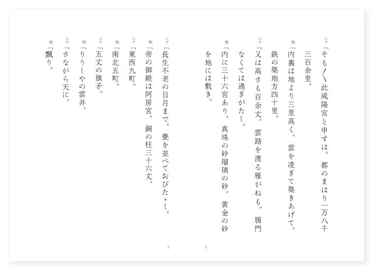 シテ 秦始皇 ワキ 荊軻 ワキヅレ 秦舞陽 ワキヅレ 大臣 狂言 官人 ツレ(后) 花陽夫人 地は 唐土 季は 雑 シテ「そも〳〵此咸陽宮と申すは。都のまはり一万八千三百余里。 地「内裏は地より三里高く。雲を凌ぎて築きあげて。鉄の築地方四十里。 シテ「又は高さも百余丈。雲路を渡る雁がねも。鴈門なくては過ぎがたし。 地「内に三十六宮あり。真珠の砂瑠璃の砂。黄金の砂を地には敷き。 シテ「長生不老の日月まで。甍を並べておびたゝし。 地「帝の御殿は阿房宮。銅の柱三十六丈。 シテ「東西九町。 地「南北五町。 シテ「五丈の旗矛。 地「りうしやの雲井。 シテ「さながら天に。 地「飄り。 歌「のぼれば玉の階の。〳〵。金銀を研きて輝けり。たゞ日月の影を踏み。蒼天をわたる心地して。おの〳〵肝を消すとかや。〳〵。 ワキ、ツレ一声「思ひ立つ。朝の雲の旅衣。落葉重なる嵐かな。 ワキ「山遠うしては雲行客の跡をうづみ。 ツレ「松高うしては風旅人の夢を破る。 ワキ「たとひ轅門は高くとも。 ツレ「思ひの末は。 ワキ「石に立つ。 二人歌「弥猛の心あらはれて。〳〵。遠山の雲に日を重ね。やう〳〵行けば名も高き。咸陽宮に着きにけり。〳〵。 ワキ詞「急ぎ候ふ程に。咸陽宮に着きて候。先づ奏問申さうずるにて候。如何に奏問申し候。燕の国の傍に。荊軻秦舞陽と申す両人の者。高札のおもてに任せ。燕の指図の箱。ならびに樊於期が頭を持ちて。是まで参内申して候。 狂言「シカ〳〵。 大臣「何と申すぞ。燕の国の民に。荊軻秦舞陽と申す両人の者。燕の指図の箱。ならびに樊於期がかうべを持ちて参内したると申すか。かゝるめでたき事こそなけれ。やがて奏聞申し候ふべし。如何に奏問申し候。燕の国の民に。荊軻秦舞陽と申す両人の者。燕の指図の箱。ならびに樊於期がかうべを持ちて只今参内申して候。 シテ「何と燕の国の傍に。荊軻秦舞陽と申す両人の者。指図の箱。ならびに樊於期がかうべを持ちて参内したると申すか。 大臣「さん候。 シテ「急いで参内させ候へ。 大臣「畏つて候。只今のよしを奏聞申してあれば。急いで参内させよとの宣旨にて有るぞ。さりながら御大法のごとく。太刀刀を汝あづかり候へ。 狂言「畏つて候。如何に方々ヘ申し候。急いで御参内あれとの御事にて候ふさりながら。御大法の事にて候ふ間。面々の太刀刀をあづかり申して参内させ申せとの御事にて候ふぞ。太刀刀を賜はり候へ。 ワキ「いかに秦舞陽。太刀刀を参らせよと承り候ふが。何と仕り候ふべき。 ツレ「御大法にて候はゞ唯まゐらせられ候へ。 ワキ「さらば参らせうずるにて候。 狂言「シカ〳〵。 ワキ「荊軻は佩剣を解いて威儀をなし。節会の儀式に従ひて。雲上遥に見わたせば。 ツレ「金銀珠玉の御階を踏み。三里が間をのぼりゆけば。 ワキ「薄氷を踏む心地して。荊軻は既にのぼれども。 ツレ「跡に立ちたる秦舞陽。身体わなゝき手を押して。のぼり兼ねてぞ休らひける。 ワキ「あゝ不覚なりとよ秦舞陽。燕のいやしき住居にならつて。玉殿を踏む恐ろしさに。臆してあがりかねけるか。 ツレ「それをなさのみ諌め給ひそ。其磧礫に習つて玉淵を窺はざるは。驪龍の蟠る所を知らず。 地「げに理とて典獄は。さしも厳しき禁中に。轅門を解いてゆるしけり。〳〵。 大臣「帝は之を聞しめし。臨時の節会を執り行ひ。燕使の参内を待ち給ふ。 ワキ「舞陽荊軻は大床の。胡床に参着申しけり。 ツレ「まづ秦舞陽すゝみ出でゝ。樊於期がかうべを皇帝の。上覧にそなへ立ちのけば。 大臣「帝は笑める御気色。御心も釈けて見え給ふ。 ワキ「其時荊軻すゝみよつて。燕の指図の箱の蓋を開き。上覧にそなへ立ちのけば。 シテ「不思議やな箱の底に剣の影。氷の如く見えければ。既に立ち去り給はんとす。 地「荊軻は期したる事なれば。御衣の袖にむんずとすがつて。剣を御胸にさしあて奉りけり。 后「あさましや聖人人にまみえずとは。今此時にて有りけるぞや。あらあさましの御事やな。 シテ詞「如何に荊軻。秦舞陽もたしかに聞け。我三千人の后を持つ。其中に花陽夫人とて琴の上手あり。されば毎日おこたる事なし。然れども今日は汝等が参内により。いまだ琴の音を聞かず。ことさら今は最期なれば。片時の暇をくれよ。彼琴の音を聞いて。黄泉の道をもまぬかれうずると思ふは如何に。 ワキ「いかに秦舞陽。さて何と有るべきぞ。 ツレ「是程まで手ごめ申すうへは。片時の御暇ならば参らせられ候ヘ。 ワキ「さらば片時の御暇をまゐらせうずるにて候。 シテ「如何に花陽夫人。急ぎ秘曲を奏し給へ。 后「さらば秘曲を奏すべし。本より妙なる琴の音に。飛ぶ鳥も地に落ち武士も。やはらぐ程の秘曲なれば。ましてや今はの玉の小琴。さこそは御手も尽されけめ。 地「花の春の琴曲は。花風楽に柳花苑。柳花苑の鶯は。おなじ曲の囀り。月の前のしらべは。夜寒をつぐる秋風。雲井に渡れる雁金。琴柱におつる声々も。涙の露の玉章。たまさかに。〳〵。人はよも白糸の。しら