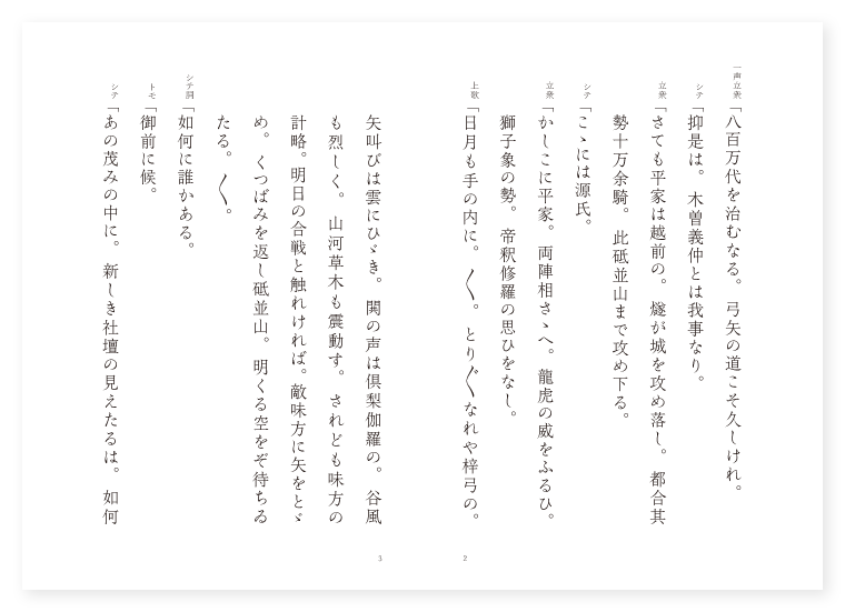 シテ 木曽義仲 立衆 従兵 トモ 立衆中の一人 ヲカシ 里人 ツレ 覚明 ワキ 今井兼平 地は 越中 季は 夏 一声立衆「八百万代を治むなる。弓矢の道こそ久しけれ。 シテ「抑是は。木曽義仲とは我事なり。 立衆「さても平家は越前の。燧が城を攻め落し。都合其勢十万余騎。此砥並山まで攻め下る。 シテ「こゝには源氏。 立衆「かしこに平家。両陣相さゝへ。龍虎の威をふるひ。獅子象の勢。帝釈修羅の思ひをなし。 上歌「日月も手の内に。〳〵。とり〴〵なれや梓弓の。矢叫びは雲にひゞき。閧の声は倶梨伽羅の。谷風も烈しく。山河草木も震動す。されども味方の計略。明日の合戦と触れければ。敵味方に矢をとゞめ。くつばみを返し砥並山。明くる空をぞ待ちゐたる。〳〵。 シテ詞「如何に誰かある。 トモ「御前に候。 シテ「あの茂みの中に。新しき社壇の見えたるは。如何なる神を勧請申したるぞ尋ね来り候へ。 トモ「畏つて候。如何に在所の人の渡り候ふか。 ヲカシ「何事にて御座候ふぞ。 トモ「あれに新しき社壇の見えて候ふは。如何なる神を勧請申してあるぞ。 ヲカシ「さん候始めて八幡を勧請申して候。今八幡とも又在所を羽生と申すにより。羽生の八幡とも申し候。 トモ「如何に申し上げ候。在所の者に尋ね申して候へば。新しく八幡を勧請申して候ふが。今八幡とも申し。又羽生の八幡とも申すよしを申し候。 シテ「近頃めでたき事にて候。やがて社参申さうずるにて候。覚明を召して願書をこめ候へ。 トモ「畏つて候。如何に覚明御参り候へ。急ぎ願書を書きて御こめあれとの御諚にて候。 覚明「畏つて候。やがて仕らうずるにて候。 サシ立衆「今井樋口を始めとして。其数多き兵ども。皆悦びの色をなして。 地「急ぎ社壇に参りつゝ。〳〵。信心を致し取り分きて。願書を読み上げ。猶神徳を仰がん。 シテ「何々帰命頂礼。八幡大菩薩は。日域朝廷の本主。累世明君の曩祖たり。 地「宝祚を守らんが為め。蒼生を利せんが為めに。三身の金容を顕はして。三所の権扉を押し開き給へり。こゝに頻の年よりこのかた。平相国といふ者あつて。四海を掌にし。万民を悩乱せしむ。是れ仏法の怨み王法の敵なり。抑曽祖父前の陸奥守。名を宗廟の氏族に帰附す。義仲いやしくも。其後胤として此大功を起すこと。喩へば嬰児の蠡を以て巨海を測り。蟷螂が斧を取つて。隆車に向ふ如くなり。然れども君の為め国の為めに。是を起すのみなり。伏して願はくは。神明納受垂れ給ひ。勝軍を究めつゝ。仇を四方に退け給へ。寿永二年五月日と。高らかに読み上ぐれば。 シテ「義仲願書に鏑矢を。神前に捧げ申せば。御供の兵どもゝ。上差の鏑を一つづゝ。彼宝前に捧げて。南無帰命頂礼。八幡大菩薩とて。皆礼拝を参らする。 一声ワキ「寄せかくる。汀の波のおのづから。音も烈しき朝嵐。 詞「如何に平家の軍兵たしかに聞け。抑是は木曽殿の御内に。今井の四郎兼平。今日追手の大将と名乗り呼ばゝる其声は。天地も響くばかりなり。 地「今井が合図の鬨の声に。後の林の五万余騎。一度に鬨をどつと作る。 地「平家は其勢十万余騎。〳〵。時もこそあれ五月闇。暗さは暗し巌石巌の。敵も味方も同士討すなと。魚鱗鶴翼定めもなし。 シテ「かゝりける処に。 地「かゝりける処に。羽生の八幡の社壇の上より。神火一村飛び上つて。源氏の軍兵の闇を照らす。光の影をよく〳〵見れば。鳩鳥を戴く忍辱の御鎧。悪魔降伏の白羽の鏑矢を。平家の陣に射給ふと見えしが。平家の大勢取る物も取りあへず。倶梨伽羅が谷の。巌石の上に走りかゝり。落ち重なり〳〵。馬には人々には馬。雪のしづえや霜くづれ。積る木の葉の塵ひぢの如く。七万余騎は倶梨伽羅の。谷の千尋の深きをも。浅くなる程埋めたりけり。 底本:国立国会図書館デジタルコレクション『謡曲評釈 第七輯』大和田建樹 著