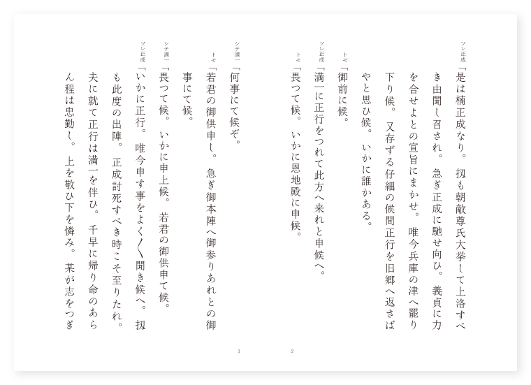 シテ 満一 ツレ 正成 子方 正行 トモ 従者 五月 ツレ正成「是は楠正成なり。扨も朝敵尊氏大挙して上洛すべき由聞し召され。急ぎ正成に馳せ向ひ。義貞に力を合せよとの宣旨にまかせ。唯今兵庫の津へ罷り下り候。又存ずる仔細の候間正行を旧郷へ返さばやと思ひ候。いかに誰かある。 トモ「御前に候。 ツレ正成「満一に正行をつれて此方へ来れと申候へ。 トモ「畏つて候。いかに恩地殿に申候。 シテ満一「何事にて候ぞ。 トモ「若君の御供申し。急ぎ御本陣へ御参りあれとの御事にて候。 シテ満一「畏つて候。いかに申上候。若君の御供申て候。 ツレ正成「いかに正行。唯今申す事をよく〳〵聞き候へ。扨も此度の出陣。正成討死すべき時こそ至りたれ。夫に就て正行は満一を伴ひ。千早に帰り命のあらん程は忠勤し。上を敬ひ下を憐み。某が志をつぎ候へ。又満一には。正行の成長の程を頼む也。是を此世の別と思ひて。急ぎ旧郷へ帰り候へ。 子方正行「仰謹んで承り候さり乍ら。弓矢の家に生れ。父の最期をよそに見て。誰に面を向け候べき。唯召具して給はり候へ。 正成「こざかしき事を申す者哉。是皆朝廷の御為なれば。とく〳〵千早に帰り候へ。 子方「いかに君の御為なりとも。罷り帰る事はなり難う候。 正成「やあか程迄父が申す事に従はざるやと。恩愛の子を叱りければ。 同「正行も満一も。〳〵。なにと云ふべき言の葉も。泣く〳〵袖をしほりつゝ。畏つたる。けしきかな〳〵。 正成「此上は語つて聞せ候べし。扨も逆徒尊氏兄弟西海より大軍を率ゐ。上洛すべき由叡聞に達し。急ぎ正成に馳せ向ひ。義貞諸共追伐すべきとの勅諚也。正成謹んで申し上るやうは。此度逆徒罷り上る事。新手といひ大軍といひ。労れたる官軍を以てくひとめ候はん事。中々存じも寄らず。義貞を召返され。今一度叡山へ行幸なし奉りなば。必定逆徒上洛仕候べし。其時正成は糧道を絶ち。義貞と内外より攻め候はんに於ては。恐れ乍ら御勝利疑ひある可らずと。必勝の計議を申上ぐるといへども。坊門殿の支へにて。既に防戦に定る事。偏に天運の極まりなり。 クリ地「夫日月うへに明かなれ共。雲霧光を覆ふ習ひ。今に始めぬ事なれ共。嘆きても又余りあり。 正成サシ「良薬口に苦く。忠言耳に逆ふといふ。 同「其故事を語給ひ。藤房の卿は世を遁れ。今正成が門出も引きは返さじ武夫の。 正成「弥猛の心ふし清く。 同「世をいさめんと。思ふなり。 クセ「獅子の子を生みて。三日を経る時は。数千丈の巌より。是を投げて試る。其子獅子の気力あれば教へざるに宙より。跳ね返りて死せずといへり。況んや正行。十歳に余りぬ。一言耳に留めつゝ。此教戒に違はざれ。我討死と聞とても。歎きを留めいづく迄も。朝敵を平らげて。聖運の開けん事を思ふべし。 正成「たとひ逆賊日の本に。 同「羽をのし嘴を鳴すとも。命のあらん其程は。帝位を守護し私の。心いさゝか無き跡に。汚名を残す事勿れ。おひさき思ふ撫子に。かゝる涙や楠の露。 満一ロンギ「時しも頃は五月雨の。ふる枝も繁る下草の。雫にしほる袂かな。 正成「花散りて。春は暮にし桜井の。名にだにありて朽ちせざる。 満一「石になるてふ楠の葉の。恨も何かあまざかる。 正成「鄙人迄も哀れしる。 満一「恩愛。 子方「親子。 満一正成子方三人「主従の。 同「別れも今更に。涙を袖に満一が。お酌に立て取敢ず。 満一「清き名を。千代に伝へて菊水の。 地「流れ久しき。湊川。(男舞) 満一ワカ「諸人の。鑑となりて。ますらをの。 地「花橘の。香ひぬる哉香ひぬる哉。 正成「斯て時刻も移るなる。 同「とく〳〵帰れといさぎよき。仰せに従ふ主従は。つきぬ涙をひるがへし。其名も清き。河内の国へ。帰るは孝行とまるは忠義の。畏きためしぞ。ありがたき。 底本:国立国会図書館デジタルコレクション『観世流謡曲錦囊 巻之四』観世流謡曲同志研究会 編