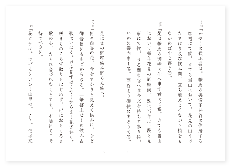 宮増作 前 シテ 山伏 狂言 能力 ワキ 鞍馬の僧 子方 牛若丸 後 子方 前に同じ シテ 大天狗 地は 山城 季は 三月 シテ詞「かやうに候ふ者は。鞍馬の奥僧正が谷に住居する客僧にて候。さても当山において。花見の由うけたまはり及び候ふ間。立ち越えよそながら梢をもながめばやと存じ候。 狂言「是は鞍馬の御寺に仕へ申す者にて候。さても当山において毎年花見の御座候。殊に当年は一段と見事にて候。さる間東谷へ唯今文を持ちて参り候。いかに案内申し候。西谷より御使にまゐりて候。是に文の御座候ふ御らん候へ。 ワキ詞「何々西谷の花。今をさかりと見えて候ふに。など御音信にもあづからざる。一筆啓上せしめ候ふ古歌にいはく。けふ見ずはくやしからまし花ざかり。咲きものこらず散りもはじめず。げにおもしろき歌の心。たとひ音づれなくとても。木陰にてこそ待つべきに。 地「花さかば。つげんといひし山里の。〳〵。使は来たり馬に鞍。鞍馬の山の雲珠桜。たをり枝折をしるべにて。奥も迷はじ咲きつゞく。木陰に並み居て。いざ〳〵花をながめん。 狂言「いかに申し候。あれに客僧の渡り候。是は近頃狼藉なる者にて候。追つ立てうずるにて候。 ワキ詞「しばらく。さすがに此御座敷と申すに。源平両家の童形達各御座候ふに。かやうの外人は然るべからず候。しかれども又かやうに申せば人を撰び申すに似て候ふ間。花をば明日こそ御らん候ふべけれ。まづ〳〵此所をば御立ち有らうずるにて候。 狂言「いや〳〵それは御諚にて候へども。あの客僧を追つ立てうずるにて候。 ワキ「いやたゞ御立ち有らうずるにて候。 シテ「遥に人家を見て花あれば即ち入る。論ぜず貴賤と親疎とを弁へぬをこそ。春の習ひと聞くものを。浮世に遠き鞍馬寺。本尊は大悲多聞天。慈悲に洩れたる人々かな。 牛若「げにや花の下の半日の客。月の前の一夜の友。それさへ好みはあるものを。あら痛はしや近うよつて花御らん候へ。 シテ詞「思ひよらずや松虫の。音にだに立てぬ深山桜を。御訪ひの有難さよ此山に。 牛若「ありとも誰か白雲の。立ち交はらねば知る人なし。 シテ「誰をかも知る人にせん高砂の。 牛若「松も昔の。 シテ「友烏の。 地「御物笑の種蒔くや。言の葉しげき恋草の。老をな隔てそ垣穂の梅。さてこそ花の情なれ。花に三春の約あり。人に一夜を馴れそめて。後いかならんうちつけに。心空に楢柴の。馴れは増らで。恋のまさらん悔しさよ。 シテ詞「いかに申し候。只今の児達は皆々御帰り候ふに。何とて御一人是には御坐候ふぞ。 牛若詞「さん候唯今の児達は平家の一門。中にも安芸の守清盛が子供たるにより。一寺の賞翫他山のおぼえ時の花たり。みづからも同山には候へども。よろづ面目もなき事どもにて。月にも花にも捨てられて候。 シテ「あら痛はしや候。さすがに和上﨟は。常磐腹には三男。毘沙門の沙の字をかたどり。御名をも沙那王殿と附け申す。あら痛はしや御身を知れば。所も鞍馬の木陰の月。 地「見る人もなき山里の桜花。よその散りなん後にこそ。咲かばさくべきに。あら痛はしの御事や。 地「松嵐花の跡訪ひて。〳〵。雪と降り雨となる。哀猿雲に叫んでは。腸を断つとかや。心凄のけしきや。夕を残す花のあたり。鐘は聞えて夜ぞ遅き。奥は鞍馬の山道の。花ぞしるべなる。此方へ入らせ給へや。さても此程御供して。見せ申しつる名どころの。ある時は愛宕高雄の初桜。比良や横河の遅桜。吉野初瀬の名所を。見のこす方も有らばこそ。 牛若「さるにても。如何なる人にましませば。我をなぐさめ給ふらん。御名を名のりおはしませ。 シテ「今は何をか包むべき。我此山に年経たる。大天狗は我なり。 地「君兵法の大事を伝へて。平家を亡ぼし給ふべきなり。さも思しめされば。明日参会申すべし。さらばといひて客僧は。大僧正が谷を分けて。雲を蹈んで飛んでゆく。立つ雲を蹈んで飛んでゆく。(中入) 牛若「さても沙那王がいでたちには。肌には薄花桜の単に。顕紋紗の直垂の。露を結んで肩にかけ。白糸の腹巻白柄の長刀。 地「たとへば天魔鬼神なりとも。さこそ嵐の山桜。花やかなりける出で立ちかな。 後ジテ「そも〳〵是は。鞍馬の奥僧正が谷に。年経て住める大天狗なり。 地「まづ御供の天狗は誰々ぞ。筑紫には。 シテ「彦山の豊前坊。 地「四州には。 シテ「白峰の相模坊。大山の伯耆坊。 地「飯綱の三郎富士太郎。大峰の前鬼が一党。葛城高間。よそまでもあるまじ。辺土においては。 シテ「比良。 地「横川。 シテ「如意が嶽。 地「我慢高雄の峰に住んで。人の為めには愛宕山。霞とたなびき雲となつて。 シテ「月は鞍馬の僧正が。 地「谷に満ち〳〵峰をうごかし。嵐こがらし滝の音。天狗だふしはおびたゝしや。 シテ詞「いかに沙那王殿。只今小天狗をまゐらせて候ふに。稽古の際をばなんぼう御見せ候ふぞ。 牛若詞「さん候只今小天狗ども来り候ふ程に。薄手をも切りつけ。稽古の際を見せ申したくは候ひつれども。師匠にや叱られ申さ