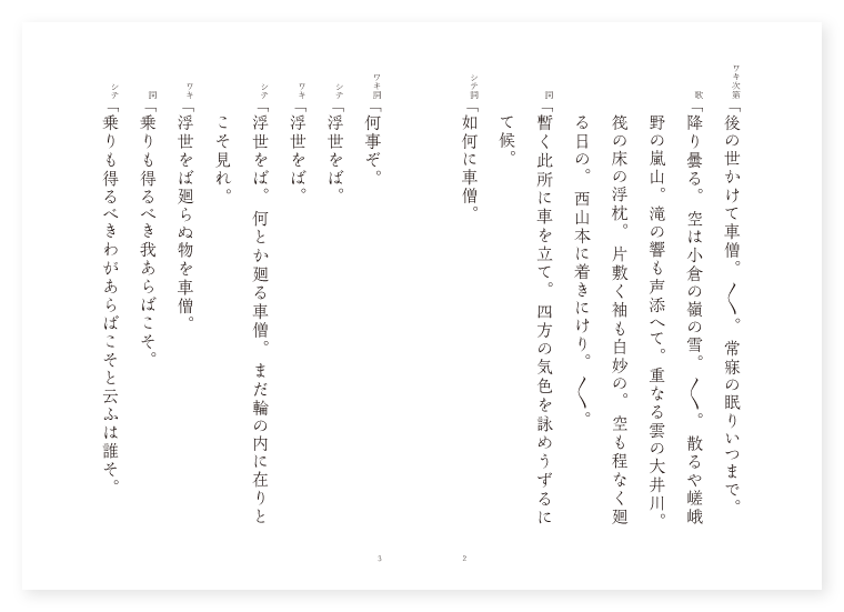 世阿弥作 前 ワキ 車僧 シテ 山伏 後 ワキ 前に同じ シテ 太郎坊 地は 山城 季は 冬 ワキ次第「後の世かけて車僧。〳〵。常寐の眠りいつまで。 歌「降り曇る。空は小倉の嶺の雪。〳〵。散るや嵯峨野の嵐山。滝の響も声添へて。重なる雲の大井川。筏の床の浮枕。片敷く袖も白妙の。空も程なく廻る日の。西山本に着きにけり。〳〵。 詞「暫く此所に車を立て。四方の気色を詠めうずるにて候。 シテ詞「如何に車僧。 ワキ詞「何事ぞ。 シテ「浮世をば。 ワキ「浮世をば。 シテ「浮世をば。何とか廻る車僧。まだ輪の内に在りとこそ見れ。 ワキ「浮世をば廻らぬ物を車僧。 詞「乗りも得るべき我あらばこそ。 シテ「乗りも得るべきわがあらばこそと云ふは誰そ。 ワキ「空堂風涼し。 シテ「我名のみ高雄の山に言ひ立つる。 ワキ「人は愛宕の嶺に住むな。 シテ「さて御僧の住家は。 ワキ「一所不住。 シテ「車は如何に。 ワキ「火宅の出車。 シテ「廻れど。 ワキ「廻らず。 シテ「押せど。 ワキ「押されず。 シテ「引くも。 ワキ「引かれぬ。 シテ「車僧の。 地「三界無安猶如火宅をば。出でたる三つの車僧かな。廻るも直なる道なりけり。あふ乗り得たり乗り得たり。 地「見聞く人。心空なる雲水の。〳〵。深立つ空も冷ましく。嵐も声々に愛宕山。嶺とよむまで響き合ひて。車路は無けれども。我住む方は愛宕山。太郎坊が庵室に。御入りあれや車僧と。呼ばゝりて夕山の。黒雲に乗りて上りけり。〳〵。(中入) 後ジテ一声「愛宕山。樒が原に雪積り。花摘む人の跡だにもなし。 詞「実に雪中に山路なし。さて車輪は如何に車僧。我程貴き者あらじと。慢心の心路跡なからんや。然らば無着法欲心に。引くか移るか車僧。魔道にも心を寄せよ車僧。 地「善悪二つは両輪の如し。 シテ「仏法あれば世法あり。 地「煩悩あれば菩提あり。 シテ「仏あれば衆生もあり。 地「車僧あれば。 シテ「太郎坊の行者も有り。 地「祈らば祈るべし。行ぜば行徳も。劣るまじとよ〳〵。いざ車僧行くらべせん。 ワキ詞「如何に汝妨ぐるとも。それには寄らじ争はじ。我はもとより不増不滅。あらおもしろの時節やな。 シテ詞「実におもしろき時節ならば。雪中に車を廻らし。嵯峨野の原にいざ遊ばん。 ワキ「遊ばゝ遊べ糸ゆふの。我心をば引かれめや。 シテ「などかは引かで有るべきと。標を振り上げ車を打つ。 ワキ「あふ車を打たば行くべきか。牛を打たば行くべしや。 シテ「実に〳〵車は心なし。さて牛を打たんも有らばこそ。 ワキ「愚や汝人牛の道。見えたる牛をばなど打たぬ。 シテ「見えたる牛とはさて如何にそも人牛は。 ワキ「打つとも行かじ。 シテ「さて御僧の打たば行くべきか。 ワキ「中々の事。いで〳〵さらば露地の白牛を打つて見せんと。払子を上げて虚空を打てば。 地「不思議やな此車の。〳〵。ゆるぎ迴りて今までは。足弱車と見えつるが。牛も無く人も引かぬに。易々と遣りかけて。飛ぶ車とぞなりたりける。 ロンギ地「小車の。山の蔭野の道すがら。法の道の辺遊行して。貴賤の利益なすとかや。 シテ「所から。こゝは浮世の嵯峨なれや。雪の古道跡ふかき。車のわだちは足引の。大雪にはよも行かじ。 地「実に雪山の道なりと。法の車路平らかに。 シテ「行くか行かぬか此原の。 地「草の小車雨添へて。 シテ「打てども行かず。 地「とむれば進む。 シテ「此車の。 地「法の力とて。嵯峨小倉大井嵐の。山河を飛び翔つて。眩惑すれども騒がばこそ。誠に奇特の車僧かな。あら貴や恐ろしやと。魔障を和らげ大天狗は。合掌してこそ失せにけれ。 底本:国立国会図書館デジタルコレクション『謡曲評釈 第五輯』大和田建樹 著