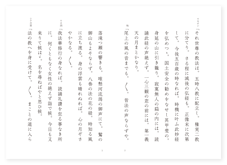 前 ワキ 日蓮上人 シテ 里女 後 ワキ 前に同じ シテ 蛇神 地は 甲斐 季は 春 ワキサシ「それ世尊の教法は。五時八教に配立し。権実二教に分てり。さる程に滅後の弘経も。正像末に次第して。今後五百歳の時なれば。時機に叶ふ此妙経を弘めつゝ。国土安全の勧めをなせし其甲斐の。身延の山に引き籠り。寂寞無人の扃の内には。読誦此経の声絶えず。一心三観の窓の前には。第一義天の月まとかなり。 地「尾上の風の音までも。〳〵。皆法の声ならずや。落滝つ瀬の響きも。唯懸河流潟の御声にて。鷲の御山もよそならず。八巻の法の花の紐。時知る風に立ち渡る。身の浮雲も晴れぬれば。心の月ぞさやかなる。〳〵。 ワキ詞「我法華修行の身なれば。読誦礼讃を怠る事なき所に。何くともなく女性の絶えず詣で候。今日も又来りて候はゞ。名を尋ねばやと思ひ候。 シテ次第「法の教へを身に受けて。〳〵。まことの道に入らうよ。 サシ「有難の霊地やな。漢土にては四明の洞。和朝にては我立つ杣と詠じけん。御山もいかでまさるべき。さて又大城波木井の河風に。波の立居もおのづから。随縁真如を顕はせり。 下歌「谷の戸出づる鶯も。法を唱ふる花の枝。 上歌「来ても見よ。身延の山の深雪だに。〳〵。春を迎へて消えぬれば。是も恵日の光りかと。思へば我作りにし罪科も。かくこそ消えめ頼もしやと。信心はいやましに。実に有難き御山かな。〳〵。 ワキ詞「あやしやな此山は。花より外は知る人もなき菴なるに。そもや女性の御身ながら。御経読誦の折々に。歩みを運び花水を仏に捧げ給ふ。さて御事はいかなる人にてましますぞ。 シテ詞「是は此あたりに住む者なるが。かく有難き御法に逢ふ事。盲亀の浮木優曇華の。花待ち得たる心地して。悦びの涙の露。斯かるをりしも縁を結び。後の世の闇を晴らさずは。又いつの世を松の戸の。明暮歩みを運びつゝ。上人に結縁をなすばかりなり。 ワキ「実に奇特なる信心かな。此法華経を保ちぬれば。若有聞法者。無一不成仏と説き給ひて。二乗闡提悪人女人おしなべて。成仏する事疑ひなし。 シテ「さては殊更有難や。 地「其名をだにもまだ聞かぬ。〳〵。御法を既に保つまで。いかで契りを結びけん。実に頼もしき折からや。猶も女の仏となる。謂を示しおはしませ。 ワキ詞「中々の事草木国土。悉皆成仏の法華経なれば。女人の助かりたる所をも語つて聞かせ候ふべし。 地クリ「そも〳〵法華経と云つぱ。釈尊久遠劫の其昔。初成道の時悟り得給ひし。妙法華経なり。 ワキサシ「然るに華厳の朝より。般若の夕べに至るまで。 地「抑止在懐し給ひて。種々の方便機に随ひ。終に一乗を説き給はねば。十界差別まち〳〵なり。 クセ「さる程に女人は。外面は菩薩に似て。内心は夜叉の如しと嫌はれし。其言の葉はもろ〳〵の。経の内にし陸奥の。安達が原の黒塚や。荒れたる宿のうれたきに。仮にも鬼のすだくなると。よみしも女の事とかや。かゝる憂き身の浮まん事。いつの時をか松山や。袖に涙の波越えて。作り重ねし罪科を。悔の八千度身をかこち。仏の御法の言の葉さへ。恨めしとのみ歎きけり。 ワキ「然るに此法華経は。 地「仏七十余歳にて。始めて説かせ給ひしに。そよや一味の法の雨。ひとしく注ぐ湿ひに。敗種の二乗闡提も。皆々同じ悟りを得。殊に文珠の教へにて。龍女は須臾に法を得て。此世ながらの身を捨てず。本の悟りの故郷に。立ち帰る有様や。錦の袂なるらん。 ロンギ地「此妙典の理を。説く唐糸の一筋に。仰ぎて保ち給へや。 シテ「有難の御事や。さては妾も隔てなき。御法の水を手に結び。絶えず苦しき三熱の。焰を早くまぬかれん。 地「そも三熱の苦しみを。まぬかるべしと宣ふは。さては御身は霊神の。仮に女となりたるや。 シテ「今は何をか包むべき。我は七面の池に。澄む月並の数知らぬ。年経たる蛇身なり。 地「さらば懺悔の其為めに。本の姿を見せ給へ。 シテ「恥かしながら報恩に。ありし姿を顕はさんと。 地「夕風も烈しく。立つや黒雲の。行方も早き雨の足。踏みとゞろかし鳴神の。稲光して冷ましき。音にまぎれて失せにけり。〳〵。(中入) ワキ歌「かゝる不思議に逢ふ事も。〳〵。唯是れ法の力ぞと。心を澄ましひたぶるに。読誦をなして待ち居たり。〳〵。 地「あら不思議やな今までは。〳〵。妙に優なる女人と見えつるが。さも冷ましき大蛇となつて。日月の如くなる眼を開き。上人の高座を幾重ともなく。くる〳〵と引き纏ひ。慙愧懺悔の姿を顕はし。高座へ頭を差し上げて。瞻仰してこそ居たりけれ。 ワキ「其時上人御経を取り上げ。 地「其時上人御経を取り上げ。於須臾頃便成正覚と。高らかに称へ給へば。忽ち蛇身を変じつゝ。忽ち蛇身変じつゝ。如我等無異の身となれば。空には紫雲たなびき。四種の花降り。虚空に音楽聞え来て。宜禰が鼓にたぐふなる。報謝の舞の袂も。異香薫じて吹き送る。松の風颯々の。鈴の音も更け行く夜半の。月も霜も白和幣。振り上げて声澄むや。 シテ