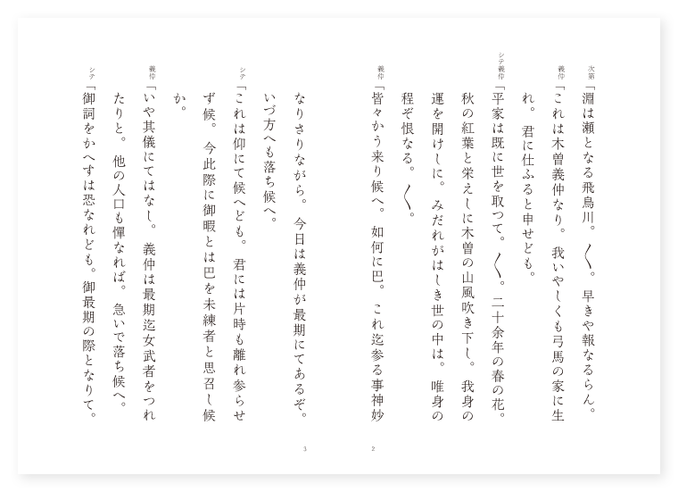 シテ 巴 ツレ 寄手の兵 ワキ 源義仲 ツレ 今井兼平 ツレ 立衆 所 近江粟津 次第「淵は瀬となる飛鳥川。〳〵。早きや報なるらん。 義仲「これは木曽義仲なり。我いやしくも弓馬の家に生れ。君に仕ふると申せども。 シテ義仲「平家は既に世を取つて。〳〵。二十余年の春の花。秋の紅葉と栄えしに木曽の山風吹き下し。我身の運を開けしに。みだれがはしき世の中は。唯身の程ぞ恨なる。〳〵。 義仲「皆々かう来り候へ。如何に巴。これ迄参る事神妙なりさりながら。今日は義仲が最期にてあるぞ。いづ方へも落ち候へ。 シテ「これは仰にて候へども。君には片時も離れ参らせず候。今此際に御暇とは巴を未練者と思召し候か。 義仲「いや其儀にてはなし。義仲は最期迄女武者をつれたりと。他の人口も憚なれば。急いで落ち候へ。 シテ「御詞をかへすは恐なれども。御最期の際となりて。他の人口もいるまじや。同じ枕に討死して。二世の御供申すべし。 義仲「実に〳〵それはさる事なれども。誠の心あるならば。形見を持ちて古郷へ帰り。様かへ跡弔ひ申すべしと。 地「涙にむせび宣へども。理や古郷を。出でゝ越路の道迄も。巴は命ながらへて。今此際に成りぬれば。落ちよと仰せ候は。情なの御事や。何れの国の果迄も。命のあらん其程は。御供に参るべし情なの今の御諚やな。時刻うつりて叶ふまじ早々帰れ帰れとて。座敷を立たせおはしませば。力なくして巴は。行くも行かれぬ御名残。涙にむせぶばかりなり。〳〵。 ワキ立衆「よせかくる。汀の波のおのづから。音も烈しき。夕嵐。 シテ「抑これは木曽殿の御内に。其名を得たる女武者。今日を限の軍ぞと。寄せ来る勢をぞ。待ちかけたる。 地「敵はこれを見るよりも。〳〵。あれは巴か女武者。あますな洩すな討取れとて。我も〳〵と進みけり。 シテ「一騎当千の秘術をつくし。 地「一騎当千の秘術をつくし。ふせぎ戦ひ追払ひ。討たるゝ者は数を知らず。唯一人に斬りたてられて続く兵なかりけり。 ワキ「爰に武蔵の住人に。 地「恩田の八郎師重とて。巴に組まんと飛んでかゝるをわだがみつかんで引寄せて。首ねぢ切つてぞ捨てにける。 シテ「今は巴もこれ迄なり。 地「今は巴もこれ迄なりと長刀追つとり駒引きよせて。ゆらりと打ち乗り木曽の浅ぢふかけし中の。由なかりける契の末ぞと行方も知らず成りにけり。 底本:国立国会図書館デジタルコレクション『古今謡曲解題』丸岡桂 著、『四流対照 謡曲二百番 上巻』芳賀矢一 訂