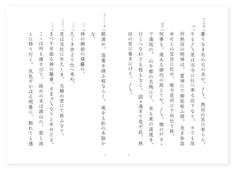 禅竹作 前 ワキ 勅使 シテ 老翁 ツレ 老女 後 ツレ(天女) 橘姫 シテ 源太夫の神 地は 尾張 季は 六月 ワキ次第「曇りなき名の日の本や。〳〵。熱田の宮に参らん。 詞「そも〳〵是は当今に仕ヘ奉る臣下なり。さても尾州熱田の明神は。霊神にて御座候ふ間。急ぎ参詣申せとの宣旨に任せ。唯今尾州に下向仕り候。 道行「何事も。道ある御代の旅とてや。〳〵。関の戸さゝで逢坂の。山を都の名残にて。末も東の道遠き。行くへなれども程もなく。国々過ぎて是ぞ此。熱田の宮に着きにけり。〳〵。 シテ、ツレ一声「朝清め。落葉を掃ふ程ならし。風をも松の木陰かな。 ツレ「神の御前の瑞籬の。 二人「久しき世より仕ヘ来ぬ。 シテサシ「是は当社に年久しき。夫婦の者にて候ふなり。 二人「まづ千早振る神の職事。さま〴〵なりと申せども。こゝは所も浦さびて。詠めの末は浦山の。雲と波とに移り行く。気色ぞかはる明暮に。馴れても通ふ心とて。折々毎にめづらしさよ。もとよりも誓ひの海の底ひなく。深き教への彼国に。安く至らん法の御舟。仏の道もよそならぬ。神の恵みを頼むなり。 下歌「歩みを運び年月を。送り迎へて老が身の。 上歌「夙に起き。夜半に寐覚め仕へてぞ。〳〵。ながらへ来ぬる春秋の。月に馴れ花に添ふ。心も老と身はなりて。誠を致す志。実に神感も頼もしや。〳〵。 ワキ詞「我暁天より星を戴き。宮中を拝する所に。是なる老人夫婦神前を清め。御垣を囲ふ気色見えたり。御身は宮つこにてましますか。 シテ詞「さん候是は当社の宮つこにて候。分きては御垣守にて候ふ程に。折々は庭を清め信心をいたし候。 ワキ「実に〳〵有難う候。大方神前に於て。御垣を囲ひ申さるゝ事はさる事なれども。まづは大内の御垣守とこそ申すべけれ。分きて当社の御垣を囲ふ謂ばし候ふやらん。 シテ「御不審は御理にて候。かたじけなくも当社と申すは。出雲の大社と御一体の御事ぞかし。 ツレ「然るに当時素盞嗚の尊。出雲の国に至り給ひ。大宮造り有りし時。 二人「八雲立つ出雲八重垣つまごめに。八重垣作る其八重垣を。こゝにも由緒は有る物を。不審な為させ給ひそとよ。 ワキ「実に有難き御事かな。さては出雲と御一体。和光垂跡の御事なるか。猶々謂を語り給へ。 シテ詞「景行第三の皇子。日本武の尊と申すは。東夷を平らげ国家を鎮め。終にはこゝに地を占め給ふ。 ツレ「是れ素盞嗚の御再来。衆生済度の方便にて。 シテ「或は人の代。 二人「或は又。 地「神の代を。思ひ出雲の宮柱。〳〵。立ち添ふ雲も八重垣の。こゝも隔ては名も異に。誓ひはさま〴〵変はれども。一体分身の御神所。一心に仰ぎ給へや。時は三伏の夏の日の。熱田の宮路浦伝ひ。近く鳴海の磯の波。松風の声寐覚の里。聞くにも心涼しく。老の身も夏や忘るらん。〳〵。 ワキ詞「猶々当社の御神秘委しく御物語り候へ。 地クリ「それ和光同塵の御垂跡。いづれ以て疎かならねど。威光を四方に顕はし給ふは。是れ八剣の神徳なり。 シテサシ「然れば景行第三の皇子。御名は日本武の尊。 地「地神五代には天照太神の兄。素盞嗚の尊。出雲の国に跡を垂れ。暫く宮居し給へり。 シテ「こゝに簸の川上に涕哭する声あり。 地「尊至りて見給へば。老人夫婦が中に。乙女を抱きて泣き居たり。是を如何にと尋ぬるに。 クセ「老人答へて申すやう。我は手摩乳脚摩乳。娘を稲田姫と。いふ者にて候ふが。大蛇の生贄を。悲しむなりと申せば。然らば其姫を。我に得させよ其の難を。遁すべしと宣へば。喜悦の心妙にして。尊に姫を奉る。 シテ「やがて大蛇を従ヘ。 地「其尾に有りし剣を。村雲の剣と名づけしこそ。八剣の宮の御事よ。されば簸上の明神は。其時の稲田姫なり。父の老翁名をかへて。源太夫の神と顕はれ。東海道の旅人を。守らんと誓ひ給へり。 ワキ詞「実に有難き神秘の教へ。唯人ならず覚えたり。御名を名乗り給ふべし。 シテ詞「今や何をか包むべき。簸の川上に顕はれし。我は手摩乳。 ツレ「脚摩乳。 シテ「夫婦是まで。 二人「顕はれたり。 地「常ならず御身は。勅諚の使なる故に。仰ぐべし神とても。人の敬ひ深ければ。守らん為めに来りたり。こゝにては源太夫の。神ぞと名乗り捨てゝ。行く方見えずなりぬ。行方知らずなりにけり。(中入) ツレ「我は是れ。真如実相の無漏を出でゝ。有為の濁塵に光りを交へ。結縁の衆生擁護の神。橘姫とは我事なり。 後ジテ「我は又無縁の衆生を利益せんと。東海道を日夜に守る。源太夫の神とは我事なり。 地「あら有難や。 ワキ「実に有難き御影向。感涙肝に銘じつゝ。心空なるばかりなり。 ツレ詞「とても姿を顕はさば。いざや舞楽の曲を奏し。彼客人に見せ申さん。 シテ「実に〳〵是もいはれたり。さて役々は。 ツレ「糸竹の。 シテ「中に異なる太鼓の役。 ツレ「即ち御身。 シテ「源太夫が。 ツレ「嘉例もさぞな。 シテ「思ひ出づる。 地「昔も打ちたる太鼓の御役。今も妙なる秘曲を添へて。撥も数ある楽拍子。今打ち寄るも波の調べ。