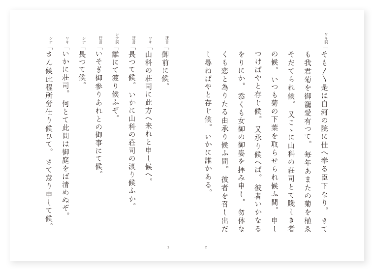 世阿弥作 前 ワキ 官人 狂言 下人 シテ 山科荘司 後 ワキ 前に同じ ツレ 女御 シテ 荘司の霊 地は 京都 季は 雑 ワキ詞「そも〳〵是は白河の院に仕へ奉る臣下なり。さても我君菊を御寵愛有つて。毎年あまたの菊を植ゑそだてられ候。又こゝに山科の荘司とて賤しき者の候。いつも菊の下葉を取らせられ候ふ間。申しつけばやと存じ候。又承り候へば。彼者いかなるをりにか。忝くも女御の御姿を拝み申し。勿体なくも恋と為りたる由承り候ふ間。彼者を召し出だし尋ねばやと存じ候。いかに誰かある。 狂言「御前に候。 ワキ「山科の荘司に此方へ来れと申し候へ。 狂言「畏つて候。いかに山科の荘司の渡り候ふか。 シテ詞「誰にて渡り候ふぞ。 狂言「いそぎ御参りあれとの御事にて候。 シテ「畏つて候。 ワキ「いかに荘司。何とて此間は御庭をば清めぬぞ。 シテ「さん候此程所労仕り候ひて。さて怠り申して候。 ワキ「尤にて候。さて汝は恋をするといふは誠か。 シテ「さやうの事をば何とて知しめされて候ふぞ。 ワキ「いや〳〵はや色にいでゝあるぞとよ。さる間此事を忝くも女御きこしめし及ばれ。急ぎ此荷を持ちて御庭を百度千度まはるならば。其間に御姿を拝ませ給ふべきとの御事なり。なんぼう有難き御諚にてはなきか。 シテ「何と此事をきこしめし及ばれ。其荷を持ちて御庭を百度千度まはれとかや。百度千度とは。百度も千度も持ちてめぐらば。其間に御姿を拝まれさせ給ふべきと候ふや。 ワキ「げによく心得て有るぞ。なんぼう有難き御事にてはなきか。 シテ「さらば其荷を御見せ候へ。 ワキ「此方へ来り候へ。是こそ恋の重荷よ。なんぼう美しき荷にてはなきか。 シテ「げに〳〵美しき荷にて候。たとひ叶はぬ業なりとも。仰せならばさこそあるべけれ。ましてや是は賤しき業。さのみは隔てじ名を聞くも。 地「重荷なりとも逢ふまでの。〳〵。恋の持夫に為らうよ。 シテ「誰踏みそめて恋の路。 地「ちまたに人の迷ふらん。 シテ「名もことわりや恋の重荷。 地「げに持ちかねる此身かな。 シテサシ「夫れ及びがたきは高き山。思ひの深きはわたづみの如し。 地「いづれ以てたやすからんや。げに心さへ軽き身の。塵の浮世にながらへて。よしなく物を思ふかな。 ロンギ地「思ひや少し慰むと。露のかごとを夕顔の。黄昏時も早過ぎぬ。恋の重荷を持つやらん。 シテ「重くとも。思ひは捨てじ唐国の。虎と思へば石にだに。立つ矢の有るぞかし。いかにも軽く持たうよ。 地「持つや荷前の運ぶなる。心ぞ君が為めを知る。重くとも心そへて。持てや〳〵下人。 シテ「よしとても。此身は軽し徒らに。恋の奴に為りはてゝ。亡き世なりと憂からじ。 地「なき世に為すもよしなやな。げには命ぞ唯頼め。 シテ「しめぢが腹立ちや。 地「よしなき恋を菅莚。伏して見れども寝らればこそ。苦しや独寝の。我手枕の肩替へて。持てども持たれぬ。そも恋は何の重荷ぞ。 シテ「あはれてふ。言だに無くは何をさて。恋の乱れの。束緒も絶えはてぬ。 地「よしや恋ひ死なん。報はゞそれぞ人心。乱恋になして。思ひ知らせ申さん。(中入) ワキ詞「何と荘司が空しくなりたると申すか。言語道断近頃ふびんなる事にて候ふぞや。総じて恋と申す事は。高き賤しき隔てぬ事にて候へどもさりながら。彼者の恋の心を止むとの御方便にて。重荷を作つて上を綾羅錦繍を以て美しく包みて。いかにも軽げに見せて持たせなば。彼者思はんには。かほど軽げなる荷なれども。恋の叶ふまじき故に持たれぬぞと心得。恋の心や止まるべきとの御事にて候ふ処に。賤しき者のかなしさは。是を持ち御庭をめぐらば。御姿をまみえさせ給はん事を悦び。勢力を尽し候へども。もとより重荷なれば持たれぬ事を恨み。嘆きてかやうに身を失ひ候ふ事。かへす〴〵もふびんにこそ候へ。此由を申し上げうずるにて候。いかに申し上げ候。山科の荘司重荷を持ちかねて。御庭にて空しく為りて候。かやうの賤しき者の一念は恐ろしく候。何か苦しう候ふべき。そと御出であつて。彼者の姿を一目御覧ぜられ候へ。 ツレ「恋よ恋。我中空に為すな恋。恋には人の死なぬものかは。無慙の者の心やな。 ワキ詞「是はあまりに忝き御諚にて候。はや〳〵立たせおはしませ。 ツレ「いや立たんとすれば磐石に押されて。更に立つべきやうもなし。 地「報いは常の世の習ひ。 後ジテ「吉野川岩切り通し行く水の。音には立てじ恋ひ死にし。一念無量の鬼となるも。唯よしなやな誠なき。言縁妻の空だのめ。 地「げにもよしなき心かな。 シテ「浮寐のみ。三世の契の満ちてこそ。石の上にも座すといふに。我はよしなや逢ひがたき。巌の重荷持たるゝものか。あら恨めしや葛の葉の。玉だすき。畝傍の山の山守も。 地「さのみ重荷は持たればこそ。 シテ「重荷といふも思ひなり。 地「浅間の煙あさましの身や。衆合地獄の重き苦しみ。さて懲り給へや懲り給へ。 地「思ひの煙立ち別れ。いなばの山風吹き乱れ。恋路の闇に迷ふとも。跡弔はゞ其