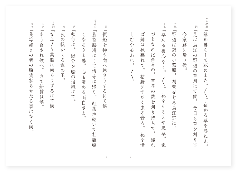 世阿弥作 前 ワキ 草刈男 シテ 渡守 後 ワキ 前に同じ シテ 楚の項羽 ツレ 虞美人 地は 唐土 季は 七月 ワキ次第「詠め暮らして花にまた。〳〵。宿かる草を尋ねん。 詞「是は烏江の野辺の草刈にて候。今日も草を刈り唯今家路に帰り候。 下歌「野辺は錦の小萩原。刈萱交じる烏江野に。 上歌「草刈る男心なく。〳〵。花を刈るとや思草。家づとなれば色々の。草花の数を刈り持ちて。帰れば跡は秋暮れて。枯野にすだく虫の音も。花を惜しむか心あれ。〳〵。 詞「便船を待ち向へ越さうずるにて候。 シテサシ「蒼苔路滑にして僧寺に帰り。紅葉声乾いて牡鹿鳴くなる夕ま暮。心も澄める面白さよ。 一声「秋毎に。野分を船の追風にて。 地「荻の帆かくる露の玉。 ワキ詞「なふ〳〵其船に乗らうずるにて候。 シテ「あう召され候へ。さて船賃は候。 ワキ「我等如きの者の船賃参らせたる事はなく候。 シテ「船賃なくは此舟には叶ひ候ふまじ。 ワキ「さらば上の瀬へ廻らうずるにて候。 シテ「なふ〳〵道理は申しつ船に召され候へ。 ワキ「乗りおくれじと草刈は。もとの渚に立ち寄れば。 シテ「とく乗り給へとさし寄する。 地「露刈り込めて秋草の。〳〵。葉毎に影宿る。月をや船に乗せつらん。天の川。たな渡りして七夕の。たな渡りして七夕の。年に一夜は心せよ。秋風吹けば波の音。湊に近き海士小船。水音なしに行く船の。水馴棹をさゝうよや。水馴棹をさゝうよ。 シテ詞「船が着いて候ふ御上り候へ。 ワキ詞「御船恐れて候。 シテ「さて船賃は候。 ワキ「又船賃と仰せられ候ふよ。其為めにこそ向ひにて申し定めて候ふに。何とて聊爾なる事をば承り候ふぞ。 シテ「いや船賃と申せばとて。別の子細にても候はゞこそ。それ程多き草花をなど一本賜はり候はぬぞ。 ワキ「あら優しや。何れにても召され候へ。 シテ「さらば此花を賜はらうずるにて候。 ワキ「不思議やな是程多き草花の中に。何とて其花をば撰つて召され候ふぞ。 シテ「さん候是は美人草と申して。故有る花にて候。 ワキ「あら面白や美人草とは。何と申したる謂にて候ふぞ。 シテ「是は項羽の后虞氏と申せし人の。身を投げ空しくなり給ひしを。取り上げ土中に築き込め候へば。其塚より生ひ出でたる草なればとて。さて美人草とは申し候。 ワキ「さらば項羽高祖の戦ひの様を。御存じ候はゞそと御物語り候へ。 シテ「さらば語つて聞かせ申し候ふべし。 シテ「さても項羽高祖の戦ひ。七十余度に及ぶといへども。始めは項羽打ち勝ち給ひ。一度も高祖の利なかりしに。ある時項羽の兵心変りし。却つて項羽を狭めつゝ。四面に鬨の声をあぐれば。虞氏は思ひに堪へかねて。いかゞはせんと伏し給ふ。又望雲騅と云ふ馬は。一日に千里を駆くる名馬なれども。主の運命尽きぬれば。膝を折つて一足も行かず。其時項羽はちつとも騒がず。馬よりしづ〳〵とおり立つて。如何に呂馬童。我首取つて高祖に捧げ。名を揚げよやと呼ばゝれども。 地「呂馬童は恐れて近づかず。不覚なる者の心かな。是見よ後の世に。語り伝へよと言ひあへず。剣を抜いてあへなくも。我と我首を搔き落し。呂馬童に与へ其まゝ。此原の露と消えにけり。望雲騅は膝を折り。黄なる涙を流せば。さのみ語れば我心。昔に帰る身の果。今は包まじ我こそは。項羽が幽霊顕はれたり。跡弔ひてたび給へ。〳〵。(中入) ワキ歌「様々に。弔ふ法の声立てゝ。〳〵。波に浮寐の夜となく。昼とも分かぬ弔ひの。般若の船のおのづから。其纜を説く法の。心を静め声をあげ。一切有情。殺害三界不堕悪趣。 後ジテ「昔は月卿雲客うち囲み。今は樵歌野田の月。爛体霧深し古松下の陰。 地「苔紛々として旧名を埋む。 シテ「紫の雲間よこぎる出立は。 地「天つ乙女の調べかな。おの〳〵伎楽を奏しつゝ。〳〵。夢の黄楊櫛弾く琴琵琶の。四面に鬨の声を上ぐれば。又執心の攻め来るぞや。あら苦しの苦患やな。 ツレ「虞氏は思ひに堪へかねて。 地「虞氏は思ひに堪へかね給ひて。高楼に登りて。落つるはさながら涙の雨の。身を投げ空しくなり給へば。 シテ「項羽は虞氏が別れと我身の。 地「なり行く草葉の露諸共に。消え果てし悲しさ。思ひ出づれば。剣も鉾も皆投げ捨てゝ。身を焼くばかりに口惜しかりし。夢物語ぞ哀れなる。 シテ「あはれ苦しき瞋恚の焰。 地「あはれ苦しき瞋恚の焰の。立ち上りつゝ味方を見れば。高祖に属して寄せ来る波の。荒き声々聞けば腹立。いで物見せんと自ら駆け出で。敵を近づけ取つては投げ捨て。又は引き伏せ捻首とり〴〵に。恐ろしかりける勢なれども。運尽きぬれば烏江の野辺の。土中の塵とぞなりにける。 底本:国立国会図書館デジタルコレクション『謡曲評釈 第六輯』大和田建樹 著