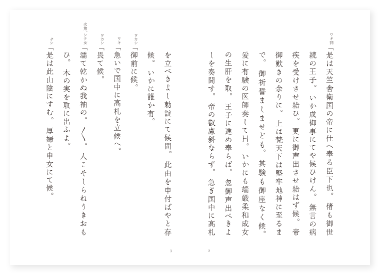 シテ 厚婦 ツレ 母 ツレ 国王 子方 太子 ワキ 臣下 狂言 臣下 所 天竺舎衛国 ワキ詞「是は天竺舎衛国の帝に仕へ奉る臣下也。偖も御世続の王子。いか成御事にてや候ひけん。無言の病疾を受けさせ給ひ。更に御声出させ給はず候。帝御歎きの余りに。上は梵天下は堅牢地神に至るまで。御祈誓ましませども。其験も御座なく候。爰に有験の医師奏して曰。いかにも端厳柔和成女の生肝を取。王子に進め奉らば。忽御声出べきよしを奏聞す。帝の叡慮斜ならず。急ぎ国中に高札を立べきよし勅諚にて候間。此由を申付ばやと存候。いかに誰か有。 ヲカシ「御前に候。 ワキ「急いで国中に高札を立候へ。 ヲカシ「畏て候。 次第、シテ女「濡て乾かぬ我袖の。〳〵。人こそしらねうきおもひ。木の実を取に出ふよ。 サシ「是は此山陰にすむ。厚婦と申女にて候。 詞「偖も妾は老母を持て候が。家貧しければ養ひ難く。おとゞひ共に山に登り。このみを拾ひて孚み候。 詞「けふも又木の実を取に出候。不思議や是に高札の候。立より見ばやと存候。何々。王子の御病気に付。端厳柔和成女人の生肝を。速かに取捧奉る者あらば。望は心に任すべしと也。や。急度思ひ出して候。わらは身を売。此価ひを母に授け申さんと。 歌「思ふ心をたよりにて。帝都にはやく参りけり。〳〵。 詞「いかに奏聞申べき事の候。 ヲカシ「奏聞とはいか成者ぞ。 シテ「是は高札の面に付て参りて候。此よし御申有て給はり候へ。(シカ〴〵) ワキ「何高札に任せ。参りたるとは汝が事か。 シテ「さん候。わらはが事にて候。 ワキ「偖生肝を奉るべきか。 シテ「中々の事。わらはが望みを叶へたまはゞ。生肝を奉り候べし。 ワキ「本来望みは心に任すべしとの勅諚也。偖命にかゑん望みとは。いか成事にて有やらん。 シテ「いや望みと申は余の儀にあらず。老母を一人持て候。此代を母に与へ申度候。 ワキ「偖は親孝行の為にて候な。あら誮の者や候。此由奏聞申べし。暫く待候へ。いかに貧女。上よりの宣旨には。汝親に孝深く君にも忠あり。寔に世に類なき者也。汝がなき跡をば。管絃講にて御弔ひ被成。又望のごとく価ひをも下され。其上母をも世に御立あるべきとの勅諚也。心安く思ひ候へ。 シテ「荒有難や候。今は早思ひ残す事もなく候。さりながら。片時の御暇を給はり候へ。母に今一度対面申たく候。 ワキ「安き間の事。片時の暇ならば得させ候べし。はやばや参り候へ。 シテ「荒嬉しや候。 同「帰る家路の別れをば。〳〵。何をつゝまんから衣。もるゝ涙に目もくれて。それ共更にみえわかぬ。草の庵に帰りけり。〳〵。 母、サシ「白雲山を帯て。人煙を隔つれば。訪ひ来る人もなく。蒼苔露深ふして。洞門に茂れども。憐み給ふ人もなし。実や人の親の。子を思ふ程。子は親を思はず。荒心許なや候。 シテ詞「いかに母上のましますか。厚婦が帰て候。 母詞「何とて遅く帰りたるぞ。わらは御身を待わびたり。世に人を待ほどくるしき物はなきに。ましてや是はおもひ子の。母が心をおもひやれ。 詞「偖今までは焉くに有けるぞ。 シテ詞「さん候。山路に踏迷ひ行方を忘れ。さて遅はりて候。又かゝる目出度物の候程に。取て帰候。是々御覧候へ。 母「荒嬉しや候。是も偏に御身の孝を感じ。天のあたへ給ふ所也。 同「是に付ても厚祇が尋兼てや居たるならん。荒心元なやと。打詫給ふ御有様。厚婦は心苦しくて。忍び涙は塞敢ず。 ワキカヽル「角て時刻も移り行ば。貧女遅しと官人は。厚婦が扉に声立て。はや〴〵出給へとよ。 母「母は思ひの外なれば。唯茫然とあきれ居たり。 シテ「厚婦はつつめど。漏る涙にせかれつゝ。声をもたてず泣居たり。 同「母は涙の下よりも。〳〵。思ひ合せしかねごと。齢ひ傾く母が身を。養はん其為に。身を売り給ふか恨めしや。縦ひ珍宝積たりと。子には争か増るべき。誠孝行たるべくば。老たる母にはつかへもせで。かく憂目をば見せ給ふ。千金もよしなしと。倒れ臥てぞ泣ゐたる。〳〵。 クリ、地「実や碧緑の紺青の髪筋も。終には所在の芝にまとひ。荘厳柔和の姿も。又路辺の。芥骨となる。 サシ「生ずる者は必ず滅す。釈尊も末栴檀の煙をまぬかれず。 地、同「楽みつき悲み来る。天人も猶五衰の日に逢り。 シテ「増てや人身を受ながら。生死の別れ思はざらん。 地、同「焼野の雉子夜の鶴。梁の燕も。子には別れを。催ほせり。 クセ「況んや人の親として。子を思ふ事浅からず。仮初に別れしだに。待遠に思ひしに。又何の世に逢べき。老たる母を残し置。先だち給ふ御身は。恨めしや今日計。明日はたれにか問るべき。それのみならず。厚祇が。山よりかへりて。歎かん事も不便なり。一方ならぬおもひに。沈む事の悲しやと。暫し消いり給へば。 シテ「その時なみだながらに厚婦は。母をいさめ申やう。 同「是とても前世の。宿業とおぼしめし。さのみ歎かせ給ふなよ。今あひ別れ申共。かならずながき浄土にて。廻り逢べし。生死不定のさかひなれば。何に愛着の留まらん