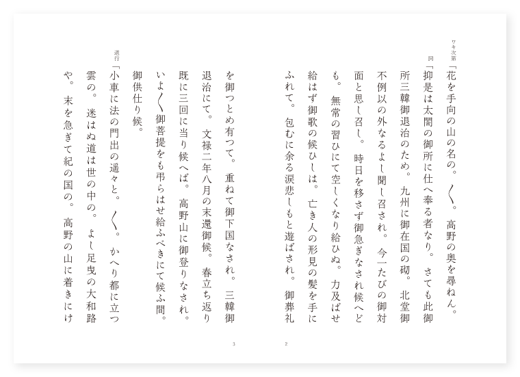 シテ 豊太閤の母の霊 子方 豊太閤 ワキ 豊臣家臣 ワキツレ 従者 所 紀伊高野山 時 春 ワキ次第「花を手向の山の名の。〳〵。高野の奥を尋ねん。 詞「抑是は太閤の御所に仕へ奉る者なり。さても此御所三韓御退治のため。九州に御在国の砌。北堂御不例以の外なるよし聞し召され。今一たびの御対面と思し召し。時日を移さず御急ぎなされ候へども。無常の習ひにて空しくなり給ひぬ。力及ばせ給はず御歌の候ひしは。亡き人の形見の髪を手にふれて。包むに余る涙悲しもと遊ばされ。御葬礼を御つとめ有つて。重ねて御下国なされ。三韓御退治にて。文禄二年八月の末還御候。春立ち返り既に三回に当り候へば。高野山に御登りなされ。いよ〳〵御菩提をも弔らはせ給ふべきにて候ふ間。御供仕り候。 道行「小車に法の門出の遥々と。〳〵。かへり都に立つ雲の。迷はぬ道は世の中の。よし足曳の大和路や。末を急ぎて紀の国の。高野の山に着きにけり。〳〵。 詞「御急ぎ候ふ程に。高野の山に御着きにて候。北堂春岩大禅定尼の御位牌所に御安座ありて。御焼香なさるべく候。御車を寄せ候へ。 シテサシ「人の親の心は闇にあらねども。子を思ふ道に迷ふなる。無明塵労即是菩提。大道本来所染なし。白雲何ぞ心あらん。 歌「暁を高野の山に待つ程や。〳〵。苔の下にも有明の。月の光は春の夜の。花の木陰に若く物は。亡き身の果といひながら。名は残る世の習ひかな。〳〵。 ワキカヽル「春の夜の夢の浮橋とだえして。峰に残れる暁の。ほのかに見ゆる面影は。それかあらぬか思ほえず。 シテ詞「反魂香にあらねども。花の匂ひに誘はれて。谷より出づる鶯の。声こそ道のしるべなれ。 ワキカヽル「あら不思議や。月の夜陰に老尼の姿の見えけるぞや。こゝはもとより女人結界の山なるに。不浄の身にてまう登る。故を如何にと答ふべし。 シテ詞「現にもあらぬ身なれば津の国の。 ワキ「難波の浦のよしあしの。二つの道も。 シテ「一筋に。 地「頼む仏の御心に。〳〵。かゝる高野の山雲の。浮世の中の罪科を。ゆるし給ふぞ有難き。〳〵。 ワキ詞「簾中近う参り此処の謂れ委しく語り候へ。 クセ地「抑金剛峯寺と申すは。帝都を去つて二百里。郷里を離れて無人声。八葉の峰八の谷。諸行無常の花をだも。晴嵐枝をならさず。 シテサシ「生滅々已の月をさへ。白雲影を隠さず。おのづから静なりける嶺の松。弘法大師其昔。入唐ありし折からに。薩埵にうけて仏法も。東漸なりと日の本に。三鈷を投げて此行方。とまらん山を我があらん。伽藍と定め申さんと。遥の空に投げ給ふ。 クセ「三鈷は落ちて此嶺の。梢にかゝる其故に。三鈷の松とは申すとかや。されば星霜ふりにたる。大塔ことに金堂。軒端かたぶき崩るゝを。悲しみ給ひ豊臣の。御代の始めにたらちねの。逆修のためにいらかをも。上人之を造営す。 シテ「猶陰深き奥の院。 地「古木怪巌苔むして。連なる道の右左。石塔数もいさ知らず。かゝげ添へたるともし火の。かげに晨鐘夕梵の。心耳をすます霊地なり。 ロンギ地「げにや老尼の物語。聞くにつけてもなつかしき。住家を知らせ給へや。 シテ「かゝる貴き此山の。浄土に登り住む事は。賢き人の孝行の。道に引かるゝ心かな。 地「そもや浮世に亡き跡は。色即是空なるものを。何の残りて呼子鳥の。声をかはすも山中に。覚束なくぞ覚ゆる。 シテ「天が下。治むる雲の上人の。かゝる山路によぢのぼる。心の程の嬉しさを。深山隠れの老木の桜。花に顕れ出づるぞや。 地「今の宣ふ言の葉は。生ふし立てたる我行方。千代もと祈るたらちねの。春岩にてましますか。 シテ「其原や〳〵。伏屋に生ふる箒木の。ありとは見えてあはれ世の。昔に帰る心地して。 地「袖の涙は石の上。ふるや雨夜の春の月。霞にまぎれ失せにけり。〳〵。 ワキ詞「如何に誰かある。 ツレ「御前に候。 ワキ「大相国今夜不思議の御霊夢を御覧ぜられて候ふ間。此寺の衆徒を召し出し。春岩の御菩提を。いよ〳〵弔はせ申さうずるにて候。 ツレ「畏つて候。 歌「暁の尾上の鐘の一声に。〳〵。僧は仰に随ひて。清巌山に参りつゝ。座具を述べ香を焼き。南無尊霊春岩大禅尼。一見阿字五逆消滅。真言得果即身成仏。 後ジテ「あら有難の御弔ひや。此御経の功力により。いよ〳〵五障の苦を離れて。只今夢に顕はれけるぞや。 ワキ「それながら見しに変れる御容。七宝荘厳の玉のかんざし。忍辱慈悲の御衣。色も妙なる御声の内に。仏言を唱へ出で給ふ。是や誠に即身成仏。疑ひもなき有様なり。 シテ「是れ孝行の道により。微妙の法を得る事の。浅からざりける志。いかで報謝をつくすべき。 ワキ「見ればげに。歌舞の菩薩となり給ふ。遊戯神通の事なれば。そのかみ世尊の御前にて。阿難座して歌へば。 シテ「迦葉立ちて舞ふ。 ワキ「其音楽の一ふしを。只今かなで見せ給へ。 地「さては昔在霊山の。妙なる法をひるがへす。袂ゆたかに立ち舞へる。舞楽の遊びは面白や。(舞) 地「思へば過去の宿縁なれや。