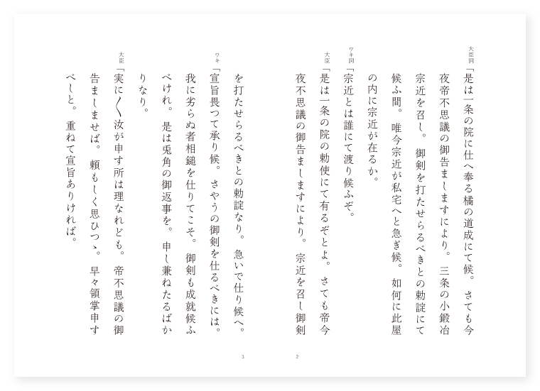 前 大臣(ワキヅレ) 橘道成 ワキ 小鍛冶宗近 シテ 童子 後 ワキ 前に同じ シテ 稲荷明神 地は 山城 季は 雑 大臣詞「是は一条の院に仕へ奉る橘の道成にて候。さても今夜帝不思議の御告ましますにより。三条の小鍛冶宗近を召し。御剣を打たせらるべきとの勅諚にて候ふ間。唯今宗近が私宅へと急ぎ候。如何に此屋の内に宗近が在るか。 ワキ詞「宗近とは誰にて渡り候ふぞ。 大臣「是は一条の院の勅使にて有るぞとよ。さても帝今夜不思議の御告ましますにより。宗近を召し御剣を打たせらるべきとの勅諚なり。急いで仕り候へ。 ワキ「宣旨畏つて承り候。さやうの御剣を仕るべきには。我に劣らぬ者相鎚を仕りてこそ。御剣も成就候ふべけれ。是は兎角の御返事を。申し兼ねたるばかりなり。 大臣「実に〳〵汝が申す所は理なれども。帝不思議の御告ましませば。頼もしく思ひつゝ。早々領掌申すべしと。重ねて宣旨ありければ。 ワキ「此上は。兎にも角にも宗近が。 地「兎にも角にも宗近が。進退こゝに窮まりて。御剣の刃の。乱るゝ心なりけり。さりながら御政道。直なる今の御代なれば。若しも奇特の有りやせん。それのみ頼む心かな。〳〵。 ワキ詞「言語道断。一大事を仰せ出だされて候ふ物かな。かやうの御事は神力を頼み申すならではと存じ候。某が氏の神は稲荷の明神なれば。是より直に稲荷に参り。祈誓申さばやと存じ候。 シテ詞「なふ〳〵あれなるは三条の小鍛冶宗近にて御入り候ふか。 ワキ「不思議やなゝべてならざる御事の。我名をさして宣ふは。いかなる人にてましますぞ。 シテ「雲の上なる帝より。剣を打ちて参らせよと。汝に仰せ有りしよなふ。 ワキ「さればこそゝれに付けても猶々不思議の御事かな。剣の勅も唯今なるを。早くも知し召さるゝ事。返す〴〵も不審なり。 シテ「実に〳〵不審はさる事なれども。我のみ知ればよそ人までも。 ワキ「天に声あり。 シテ「地に響く。 地「壁に耳。岩の物いふ世の中に。〳〵。隠れはあらじ殊に猶。雲の上人の御剣の。光りは何か闇からん。唯頼め此君の。恵みによらば御剣も。などか心に叶はざる。などかは叶はざるべき。 地クリ「それ漢王三尺の剣。居ながら秦の乱れを治め。又煬帝がけいの剣。周室の光りを奪へり。 シテサシ「其後玄宗皇帝の鍾馗大臣も。 地「剣の徳に魂魄は。君辺に仕へ奉り。 シテ「魍魎鬼神に至るまで。 地「剣の刃の光りに恐れて。其寇をなす事を得ず。 シテ「漢家本朝に於て剣の威徳。 地「申すに及ばぬ奇特とかや。 クセ「又我朝の其始め。人皇十二代。景行天皇。詔の御名をば。日本武と申しゝが。東夷を退治の勅を受け。関の東も遥かなる。東の旅の道すがら。伊勢や尾張の海面に。立つ波までも。帰る事よと羨み。いつか我も帰る波の。衣手にあらめやと。思ひつゞけて行く程に。 シテ「こゝやかしこの戦ひに。 地「人馬巌窟に身を砕き。血は涿鹿の川となつて。紅波楯流し。数度に及べる夷も。兜を脱いで矛を伏せ。皆降参を申しけり。尊の御宇より。御狩場を始め給へり。頃は神無月。二十日あまりの事なれば。四方の紅葉も冬枯の。遠山にかゝる薄雪を。詠めさせ給ひしに。 シテ「夷四方を囲みつゝ。 地「枯野の草に火を懸け。余焰しきりに燃え上り。敵攻鼓を打ちかけて。火焰を放ちてかゝりければ。 シテ「尊は剣を抜いて。 地「尊は剣を抜いて。あたりを払ひ忽に。焰も立ち退けと。四方の草を薙ぎ払へば。剣の精霊嵐となつて。焰も草も吹き返されて。天にかゝやき地に満ち〳〵て。猛火はかへつて敵を焼けば。数万騎の夷どもは。忽ちこゝにて失せてんげり。其後四海治まりて。人家戸ざしを忘れしも。其草薙の故とかや。唯今汝が打つべき。其瑞相の御剣も。いかでそれには劣るべき。伝ふる家の宗近よ。心安く思ひて下向し給へ。 ワキ詞「漢家本朝に於て剣の威徳。時に取つての祝言なり。さて〳〵御身は如何なる人ぞ。 シテ「よし誰とても唯頼め。まづ〳〵勅の御剣を。打つべき壇を飾りつゝ。其時我を待ち給はゞ。 地「通力の身を変じ。通力の身を変じて。必ず其時節に。参り会ひて御力を。附け申すべし待ち給へと。夕雲の稲荷山。行方も知らず失せにけり。〳〵。(中入) ワキ「宗近勅に随つて。即ち壇に上りつゝ。不浄を隔つる七重の注連。四方に本尊を懸け奉り。幣帛を捧げ。仰ぎ願はくは。宗近時に至つて。人皇六十六代。一条の院の御宇に。其職の誉れを蒙る事。是れ私の力にあらず。伊奘諾伊奘冊の。天の浮橋を踏み渡り。豊蘆原を探り給ひし。御矛より始まれり。其後南瞻僧伽陀国。波斯弥陀尊者よりこのかた。天国ひつきの子孫に伝へて今に至れり。願はくは。 地「願はくは。宗近私の高名に非ず。普天率土の勅命によれり。さあらば十方恒沙の諸神。唯今の宗近に。力を合はせてたび給へとて。幣帛を捧げつゝ。天に仰ぎ頭を地に付け。骨髄の丹誠。聞き入れ納受せしめ給へや。 ワキ「謹上再拝。 地「いかにや宗近勅の剣。〳〵。打つべき時節は虚空に知れり。