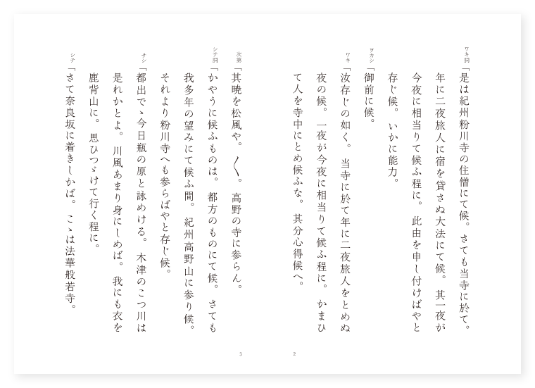ワキ 粉川寺の住僧 ヲカシ 能力 シテ 杉村弾正少弼 立衆 随行者 子方 梅夜叉 トモ 杉村の従者 地は 紀伊 季は 雑 ワキ詞「是は紀州粉川寺の住僧にて候。さても当寺に於て。年に二夜旅人に宿を貸さぬ大法にて候。其一夜が今夜に相当りて候ふ程に。此由を申し付けばやと存じ候。いかに能力。 ヲカシ「御前に候。 ワキ「汝存じの如く。当寺に於て年に二夜旅人をとめぬ夜の候。一夜が今夜に相当りて候ふ程に。かまひて人を寺中にとめ候ふな。其分心得候へ。 次第「其暁を松風や。〳〵。高野の寺に参らん。 シテ詞「かやうに候ふものは。都方のものにて候。さても我多年の望みにて候ふ間。紀州高野山に参り候。それより粉川寺へも参らばやと存じ候。 サシ「都出でゝ今日瓶の原と詠めける。木津のこつ川は是れかとよ。川風あまり身にしめば。我にも衣を鹿背山に。思ひつゞけて行く程に。 シテ「さて奈良坂に着きしかば。こゝは法華般若寺。 立衆「大聖文珠を拝み申せば。さいしやうはつき雲井坂。左はいづく東大寺。三国無双の大伽藍。まのあたりに拝む有難さよ。 下歌「月の三笠の山の端は。今ぞ知らるゝ春日野の。鹿の音になどか附けざらん。 上歌「春ならば。花とやいはん葛城の。〳〵。よそに見えたる峰の雲。かゝる旅こそ宇野と聞け。猶行く先はあふかの里。此あたりぞと夕煙。立ち添ふ林を見渡せば。かせいちの森やかまやどの。森ともはやく知られけり。〳〵。 シテ詞「急ぎ候ふ程に。粉川の寺に着きて候。やがて御堂へ参らうずるにて候。いかに誰かある。 トモ「御前に候。 シテ「はや日の暮れて候ふ程に。寺中に宿を借りて来り候へ。 トモ「畏つて候。いかに案内申し候。 ヲカシ「誰にて渡り候ふぞ。 トモ「是は旅の者にて候ふが。一夜の宿を借り申したく候。 ヲカシ「此寺の習ひにて。年に二夜旅人に御宿参らせぬ大法にて候。其一夜が今夜に相当りて候ふ間。御宿はかなひ候ふまじ。 トモ「寺中へ御宿の事を尋ねて候へば。当寺の大法にて年に二夜旅人に御宿参らせず候。其一夜が今夜に相当りて候ふ程に。何方にも御宿は叶ふまじき由申し候。 シテ「其義ならば苦しからず候。今夜は月も面白く候ふ間。本堂の前の白砂にて一夜を明かさうずるにて候。皆々近うよりて物語り候へ。 子「あら痛はしや旅人の。いまだ御宿もなげに候。是れ御覧候へ。 トモ「いかに申し候。只今幼き人の御通り候ふが。御文を落し申されて候。 シテ「何と少人の文を落し給ひたると申すか。殊に当寺は児観音にて候ふ程に。若し御利生の事もや候ふらん。先づ披いて見うずるにて候。いまだ御目にかゝりたる事は候はねども。旅に行き暮れ疲れ給ひたる御有様。余りに御痛はしく存じ。一筆申し参らせ候。みづからが古郷は近江の国高島と申し候。其かたよりと仰せ候ひて御尋ね候はゞ。御坊も対面あるべし。みづからも左様にあひしらひ申すべし。我名は梅夜叉と申し候。返す〴〵も御いたはしさの余りにかやうに思ひよりて候。 地「やさしの人の心や。いつ馴れぬ花の姿の。色あらはれて此宿の。かりごとぞ嬉しき。たぐひなの人の心や。 シテ詞「さて何とし候ふべき。 トモ「其御事にて候。只今御越なくは。梅夜叉御の御志も徒らになり候ふ間。仮名字にて御出あれかしと存じ候。 シテ「さらば其由申し候へ。 トモ「畏つて候。いかに案内申し候。高島殿の御宿坊はいづくにて候ふぞ。 ヲカシ「是にて候。 トモ「高島殿の只今御登山にて候。 ヲカシ「其由申さうずるにて候。いかに申し上げ候。高島殿御登山にて候。 ワキ「何と高島殿の御登山と候ふや。あら思ひよらずや。此方へと申し候へ。 ヲカシ「畏つて候。此方へ御出で候へ。 トモ「心得申し候。いかに申し候。其旨申して候へば。あれに御通りあれとの御事にて候。 シテ「さらばかう参らうずるにて候。 ワキ「御登山めでたう候。 シテ「さん候とくにも登山いたし御礼申すべきを。公私ひまなきに付いて遅なはり申し候。殊に幼きものを参らせ置き。万づ御むつかしき事恐れ入り存じ候。 ワキ「委細承り候。只今の御登山祝着申し候。いかに梅夜叉殿此方へ御出で候へ。殊の外の成人にて候。 シテ「誠に殊の外成人仕りて候。 ワキ「又梅夜叉殿御舎兄は比叡山に御童形にて候ふか。御出家を遂げらるゝとも申す。又御下りあつて家を御相続とも申し候ふが。何れか一定にて候ふぞ。 シテ「さん候いでそれは。 子「あら心なの仰やな。しばし休ませ申すべきに。 地「長物語よしぞなき。明けなば帰る古里の。遠旅も痛はしやと。みづから酌を取り。御客人にすゝむる。 シテ「げにや情は有明の。 地「月の都に住みなれて。人こそ多けれど。かゝるやさしき事はなし。京に田舎あり。田舎にも又都人の。心ざまはあるべしや。道すがらの思出。げに忘れがたの風情や。 トモ詞「はや鳥が歌ひて候。 シテ詞「何とはや夜の明方に候ふとや。さらば御暇申さうずるにて候。 ワキ「暫く。たま〳〵の御登山にて候ふ程に。御逗留候ひて御慰