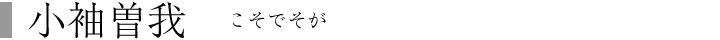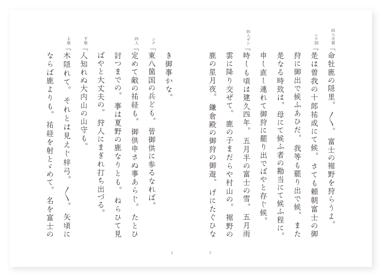 シテ 曽我十郎祐成 ツレ 曽我五郎時致 トモ二人 団三郎、鬼王 狂言 春日局 母 兄弟の母 地は 伊豆 季は 五月 四人次第「命牡鹿の隠里。〳〵。富士の裾野を狩らうよ。 シテ詞「是は曽我の十郎祐成にて候。さても頼朝富士の御狩に御出で候ふあひだ。我等も罷り出で候。また是なる時致は。母にて候ふ者の勘当にて候ふ程に。申し直し連れて御狩に罷り出でばやと存じ候。 四人サシ「時しも頃は建久四年。五月半の富士の雪。五月雨雲に降り交ぜて。鹿の子まだらや村山の。裾野の鹿の星月夜。鎌倉殿の御狩の御遊。げにたぐひなき御事かな。 シテ「東八箇国の兵ども。皆御供に参るなれば。 四人「定めて敵の祐経も。御供申さぬ事あらじ。たとひ討つまでの。事は夏野の鹿なりとも。ねらひて見ばやと大丈夫の。狩人にまぎれ打ち出づる。 下歌「人知れぬ大内山の山守も。 上歌「木隠れて。それとは見えじ梓弓。〳〵。矢頃にならば鹿よりも。祐経を射とゞめて。名を富士の嶺に揚げばやと。思ひ立ちぬる狩衣。たとへば君の御咎め。よしそれとても数ならぬ。身にはなか〳〵恐れなし。〳〵。 シテ詞「是に暫く御待ち候へ。某まゐりて案内を申さうずるにて候。如何に案内申し候。 狂言「誰にて御座候ふぞ。や。祐成の御参りにて候。 シテ「さん候某が参りたる由申し候へ。 狂言「畏つて候。大方殿よりの御諚には。祐成の御参りならば申せ。時致の御参りならばな申しそと仰せ出だされて候。 シテ「唯某がまゐりたると申し候へ。 狂言「いかに申し上げ候。祐成の御参りにて候。 母詞「此方へと申し候へ。あら珍しや十郎殿。いづくへの序ぞや。母がために態とはよも。 シテ「さん候久しく参らず候ふ程に向顔のため。又は富士の御狩と申し候ふ程に。 母「さればこそ思ひし事よ君がため。御狩に出づる序ぞや。 シテ「いつしか親子の御戯れ。珍し顔に羨ましやと。 時致「思ひながらも時致は。不孝の身なれば物の隙より。 地「高間の山の峰の雲。よそにのみ見てや止みなん。同じ子に。同じはゝそのもり乳母。〳〵。隔なくこそ育てしに。さも引きかへて祐成には。いろ〳〵の御もてなし。御祝言の御盃。たとへば時致は。後に生れしばかりなり。正しく同じ子の身にて。御おぼえ葦垣の。隔てあるこそ悲しけれ。 シテ詞「日本一の御機嫌にて候。あれへ御参りあつて。春日の局をもつて申され候へ。 時致詞「某が事は御機嫌いかゞはかりがたく候ふあひだ。先々まゐり候ふまじ。 シテ「唯某に御まかせあつて。急いで御参り候へ。 時致「如何に春日の局。時致が参りたる由それ〳〵申し候へ。いつしか守乳母まで。心変りし春日野の。飛火の野守。出でゝだに見候はぬぞや。 詞「時致が参りたる由それ〳〵申し候へ。 母詞「あら不思議や。祐成は只今きたりぬ。九上の禅師は寺にあり。それならで子はなきに。時致といふは誰そ。や。今思ひ出だしたり。箱根の寺に有りし箱王と云ひしえせ者か。それならば母が出家になれと申しゝを聞かざりしほどに勘当せしに。押して是まで来れるは。猶かさねての勘当とや。伊豆箱根富士権現も御覧ぜよ。なほ此後も勘当と。 時致「御誓言に蔀遣戸を。 地「立て添へられて茫然と。やるかたもなき此身かな。うたてやせめて今一目。御簾几帳も下りたり。あら情なの御事や。 シテ「祐成は。かくとも知らで時致が。時移りたり事よきかと。中門を見やりつゝ。早こなたへと招けば。 時致「招かれて山のかせき。 地「泣く〳〵来りたり。打たれても親の杖。なつかしければ去りやらず。〳〵。 シテ詞「さて御機嫌は何と御座候ふぞ。 時致詞「以ての外の御機嫌にて。猶かさねての御勘当と仰せ出だされて候。 母詞「如何に誰かある。 狂言詞「御前に候。 母「時致が事を申さば。祐成ともに勘当と申し候へ。 狂言「畏つて候。いかに申し候。時致の御事を御申しあらば。祐成ともに御勘当と仰せ出だされて候。 シテ詞「まづ畏つたると申し候へ。某存ずる子細の候ふあひだ。此たびは同心にて申さうずるにて候。 時致詞「いや〳〵某はまゐり候ふまじ。 シテ「唯御参り候へ。いかに申し候。我等が親の敵の事。世に隠れなく候ふところに。余りに便なく候ふあひだ。時致がことを申し直し。連れて御狩りに出づべき所に。時致が事を申さば。祐成共に御勘当と候ふや。よく〳〵是を案じ見るに。 クリ「総じて祐成をも誠は思ひ給はぬぞや。 地「たとひ時致出家の暇を申すとも。兄祐成に郎等もなし。しかも身に思ひあり。おのれらさへに見捨つるかと。却つて御叱り候ひてこそ。慈悲の母とも申すべけれ。 シテサシ「それに時致を法師にならぬとの御勘当。たとひ仰せに従ひ。出家仕り候ふとも。 地「我等が事は世に隠れなし。あれ見よ河津が子供こそ。敵を遁れんとの出家。正しく弘法のためならずと。同宿も思ひ賤しまば。心も染まぬ墨衣の。浦島が子の箱根寺にて。明暮くやしと思ふならば。中々俗には劣るべし。 クセ「時致は。箱根に有りししるしに。法華経