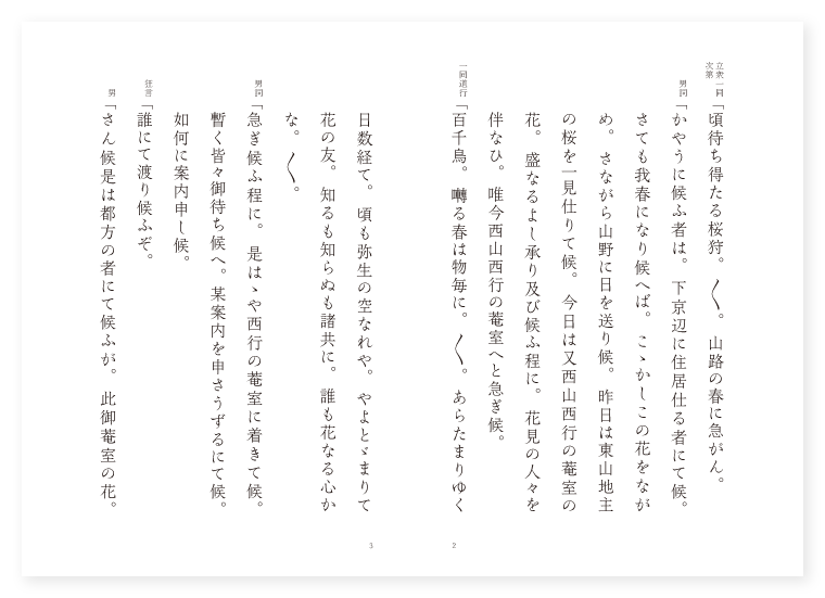 禅竹作 ツレ男都人 立衆一同 花見の人々 ワキ 西行 狂言 寺男 シテ 桜の精 地は 山城 季は 三月 立衆一同次第「頃待ち得たる桜狩。〳〵。山路の春に急がん。 男詞「かやうに候ふ者は。下京辺に住居仕る者にて候。さても我春になり候へば。こゝかしこの花をながめ。さながら山野に日を送り候。昨日は東山地主の桜を一見仕りて候。今日は又西山西行の菴室の花。盛なるよし承り及び候ふ程に。花見の人々を伴なひ。唯今西山西行の菴室へと急ぎ候。 一同道行「百千鳥。囀る春は物毎に。〳〵。あらたまりゆく日数経て。頃も弥生の空なれや。やよとゞまりて花の友。知るも知らぬも諸共に。誰も花なる心かな。〳〵。 男詞「急ぎ候ふ程に。是はゝや西行の菴室に着きて候。暫く皆々御待ち候へ。某案内を申さうずるにて候。如何に案内申し候。 狂言「誰にて渡り候ふぞ。 男「さん候是は都方の者にて候ふが。此御菴室の花。盛なる由承り及び。遥々是まで参りて候。そと御見せ候へ。 狂言「易き間の御事にて候へども。禁制にて候ふさりながら。御機嫌を見てそと申して見うずるにて候。暫く御待ち候へ。 男「心得申し候。 ワキサシ「夫れ春の花は上求本来の梢に顕はれ。秋の月下化冥暗の水に宿る。誰か知る行く水に。三伏の夏もなく。澗底の松の風。一声の秋を催す事。草木国土おのづから。見仏聞法の結縁たり。 詞「さりながら四つの時にも勝れたるは花実の折なるべし。あらおもしろや候。 狂言「日本一の御機嫌にて候ふやがて申さう。如何に申し候。都より此御庭の花を見たき由申して。是まで皆々御出でにて候。 ワキ詞「何と都よりと申して。此菴室の花をながめん為めに。是まで皆々来り給ふと申すか。 狂言「さん候。 ワキ「およそ洛陽の花盛。何処もと云ひながら。西行が菴室の花。花も一木我も独りと見る物を。花故ありかを知られん事いかゞなれども。是まで遥々来りたる志を。見せでは如何で帰すべき。あの柴垣の戸を開き内へ入れ候へ。 狂言「畏つて候。如何に方々へ申し候。よき御機嫌に申して候へば。見せ申せとの御事にて候ふ程に。急いで此方へ御出で候へ。 男詞「心得申し候。 花見一同「桜花咲きにけらしな足引の。山のかひより見えしまゝ。此木の本に立ち寄れば。 ワキ「我は又心ことなる花の本に。飛花落葉を観じつゝ。独り心を澄ます処に。 一同「貴賤群集の色々に。心の花も盛んにて。 ワキ「昔の春に帰る有様。 一同「隠れ所の山といへども。 ワキ「さながら花の。 一同「都なれば。 地「捨人も。花には何と隠家の。〳〵。所は嵯峨の奥なれども。春に訪はれて山までも。浮世のさがになる物を。実にや捨てゝだに。此世の外はなき物を。何くか終の住家なる。〳〵。 ワキ詞「如何に面々。是まで遥々来り給ふ志。かへす〴〵も優しうこそ候へさりながら。捨てゝ住む世の友とては。花独りなる木の本に。身には待たれぬ花の友。少し心の外なれば。花見んと群れつゝ人の来るのみぞ。あたら桜のとがには有りける。 地「あたら桜の陰暮れて。月になる夜の木の本に。家路忘れて諸共に。今宵は花の下伏して。夜と共にながめ明かさん。 シテ「埋木の人知れぬ身と沈めども。心の花は残りけるぞや。花見んと群れつゝ人の来るのみぞ。あたら桜のとがには有りける。 ワキ「不思議やな朽ちたる花の空木より。白髪の老人顕はれて。西行が歌を詠ずる有様。さも不思議なる仁体なり。 シテ詞「是は夢中の翁なるが。今の詠歌の心を猶も。尋ねん為めに来りたり。 ワキ「そもや夢中の翁とは。夢に来れる人なるべし。それに付きても唯今の。詠歌の心を尋ねんとは。歌に不審の有るやらん。 シテ詞「いや上人の御歌に。何か不審の有るべきなれども。群れつゝ人の来るのみぞ。あたら桜のとがには有りける。さて桜のとがは何やらん。 ワキ「いや是は唯浮世を厭ふ山住なるに。貴賤群集の厭はしき。心を少し詠ずるなり。 シテ詞「おそれながら此御意こそ。少し不審に候へとよ。浮世と見るも山と見るも。唯其人の心にあり。非情無心の草木の。花に浮世のとがはあらじ。 ワキ「実に〳〵是は理なり。さて〳〵かやうに理をなす。御身は如何さま花木の精か。 シテ「誠は花の精なるが。此身も共に老木の桜の。 ワキ「花物いはぬ草木なれども。 シテ「とがなき謂れを木綿花の。 ワキ「影唇を。 シテ「動かすなり。 地「恥かしや老木の。花も少なく枝朽ちて。あたら桜のとがの。なき由を申し開く。花の精にて候ふなり。およそ心なき草木も。花実の折は忘れめや。草木国土皆。成仏の御法なるべし。 シテ詞「有難や上人の御値遇に引かれて。恵の露あまねく。花檻前に笑んで声いまだ聞かず。鳥林下に鳴いて涙尽き難し。 地クリ「夫れ朝に落花を踏んで相伴なつて出づ。夕には飛鳥に随つて一時に帰る。 シテサシ「九重に咲けども花の八重桜。 地「幾世の春を重ぬらん。 シテ「然るに花の名高きは。 地「まづ初花を急ぐなる。近衛殿の糸桜。 クセ「見渡せば柳桜をこき