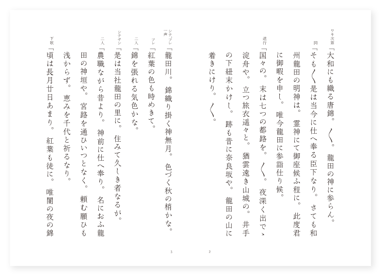 宮増作 前 ワキ 官人 シテ 里の翁 ツレ 男 後 ワキ 前に同じ シテ 滝祭の神 地は 大和 季は 九月 ワキ次第「大和にも織る唐錦。〳〵。龍田の神に参らん。 詞「そも〳〵是は当今に仕へ奉る臣下なり。さても和州龍田の明神は。霊神にて御座候ふ程に。此度君に御暇を申し。唯今龍田に参詣仕り候。 道行「国々の。末は七つの都路を。〳〵。夜深く出でゝ淀舟や。立つ旅衣遥々と。猶雲遠き山城の。井手の下紐末かけし。跡も昔に奈良坂や。龍田の山に着きにけり。〳〵。 シテ、ツレ一声「龍田川。錦織り掛く神無月。色づく秋の梢かな。 ツレ「紅葉の色も時めきて。 二人「錦を張れる気色かな。 シテサシ「是は当社龍田の里に。住みて久しき者なるが。 二人「農職ながら昔より。神前に仕へ奉り。名におふ龍田の神垣や。宮路を通ひいつとなく。頼む願ひも浅からず。恵みを千代と祈るなり。 下歌「頃は長月廿日あまり。紅葉も徒に。唯闇の夜の錦なり。 上歌「神なびの。御室の岸や崩るらん。〳〵。龍田の川の水の色は。濁るとも隔てじな。塵に交はる神慮。直に御陰もゝみぢ葉の。こゝは常盤の色はえて。誓ひも絶えぬ滝祭。いたゞく神の手向かな。〳〵。 ワキ詞「如何に是なる火の光りについて尋ね申すべき事の候。 シテ詞「此方の事にて候ふか何事にて候ふぞ。 ワキ「是は此所始めて一見の者なり。宝山への道しるべして賜はり候へ。 シテ「やすき間の御事。是こそ夜祭に参る者にて候へ。御道しるべ申し候ふべし。此方へ御出で候へ。 ワキ「あら嬉しやゝがて参らうずるにて候。 シテ「なふ〳〵是こそ宝山にて候へ。 ワキ「承り及びたるより神さび殊勝にこそ候へ。又日本第一の宝の御鉾を納めしは。此御山の事にて候ふか。 シテ「中々の事此所の御事にて候。 ワキ「さらば此山の謂を御物語り候へ。 シテ「委しく語つて聞かせ申し候ふべし。 地クリ「そも〳〵滝祭の御神とは。即ち当社の御事なり。昔天祖の詔。末明らかなる御国とかや。 シテサシ「こゝに第七代に当つて顕はれ給ふを。伊奘諾伊奘冊と号す。 地「時に国常立伊奘諾に託して宣はく。豊蘆原千百五種の国あり。汝よく知るべしとて。即ち天の御鉾を授け給ふ。 クセ「伊奘諾伊奘冊は。天祖の御教へ。直なる道をあらためんと。天の浮橋に。二神たゝずみ給ひて。此御鉾を海中に。さし下し給ひしより。御鉾を改めて。天の逆鉾と名づけそめ。国富み民を治め得て。二神の始めより。今の代までの宝なり。其後国土治まりて。御代平らかになりしかば。滝祭の明神。此御鉾を預かりて。所も普ねしや。此御山に納めて。宝の山と号すなり。 シテ「そも〳〵御鉾の主たりし。 地「名も潔き滝祭の。神の社は何くぞと。問へば名を得し龍田山。紅葉の八葉も。即ち鉾の刃先より。照らす日影や紅の。光りさし下す鉾の露。天地すなほなる事も。こゝこそ宝身は知らず。国の宝の山高み。よく〳〵礼し給へや。 ロンギ地「実にや龍田の神の名の。〳〵。宝の御鉾同じくは。所を分きて見せ給へ。 シテ「むつかしの旅人や。影恥かしき龍田山の。紅葉衣の千早ぶる。神の祭早めんと。 地「颯々の鈴の声。ていとうと打つ波の。鼓も同じ滝祭の。神は我なりと。木綿四手を靡かし。榊葉をうたひ夜に入りて。月の夜声もすみやかに。入ると見えて失せにけり。分け入ると見えて失せにけり。(中入) ワキ歌「御山の。柞の紅葉かたしきて。〳〵。こゝに仮寝の枕より。音楽聞え花降りて。異香薫ずる不思議さよ。〳〵。 地「楽に引かれて古鳥蘇の。舞の袖こそゆるぐなれ。 後ジテ「そも〳〵是は。天の御鉾を守護し奉る。滝祭の神。和光に出でゝ龍田の神。 地「あるひは天つ御空の御鉾。 シテ「又は宝山倶利迦羅御嶽。 地「いたゞきまつれや。 シテ「驚かし奉れや滝祭。 地「柏手響く山の雲霧。晴れ行く日の光りの如くに。天の御鉾は顕はれたり。 シテ「そも〳〵大日本国といつぱ神国たり。神は本覚真如の都を出でゝ。和光同塵の御形。尤仏法流布の国たるべしやな。有難や。 地「南無や帰命頂礼。大日覚王如来。 シテ「昔し伊奘諾伊奘冊の尊。此御鉾をたづさへて。天の浮橋を踏み渡り給ひ。 地「即ち御鉾をさし下し給ひ。青海原を。かき分け〳〵探り給へば。鉾のしたゞり凝り固まつて国となれり。 シテ「まづ淡路島。 地「紀の国伊勢島筑紫四国。総じて八つの国となつて。大八洲の国と名づけ。天地人の三才となる事も。此鉾の徳なりあら有難や。 シテ「さて国々は荒島なれば。 地「さて国々は荒島なれば。さながら嶮しき蘆原なりしを。鉾の手風はやてとなつて。蘆原を薙ぎ払ひ。引き捨て置けば山となりぬ。足引の山といひ。土はさながら岩が根なりしを。鉾の刃先にあたり砕けば。平らかなるを荒金の土といひ。其外東西南北十方を治め。悪魔を退け豊蘆原の。国治まりて。御鉾を守りの倶梨迦羅明王。この宝山に納め奉り。毎日めぐるや日の本の。宝の山に龍田の神は。〳〵。御鉾を守りの神体なり。 底本:国立国会図書館デジタル