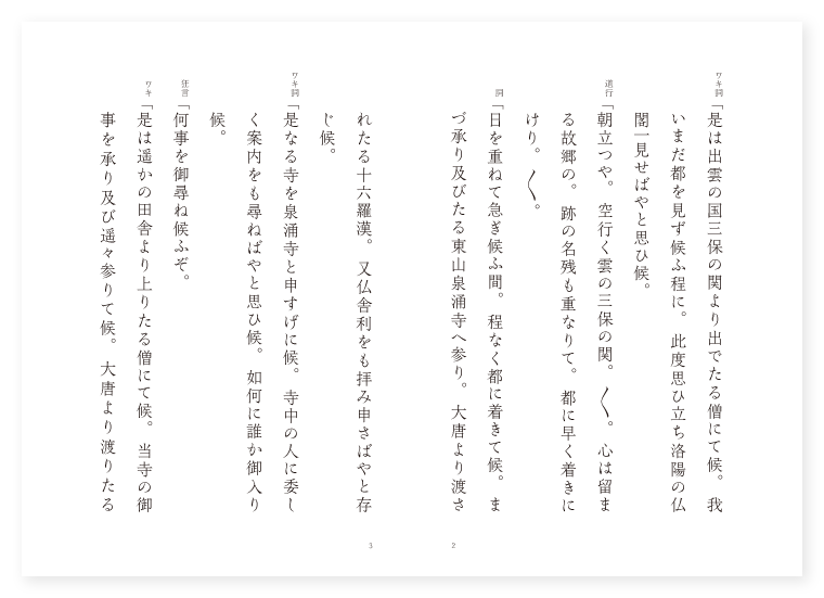 世阿弥作 前 ワキ 出雲の僧 狂言 能力 シテ 里人 後 ツレ 韋駄天 シテ 足疾鬼 地は 京都 季は 春 ワキ詞「是は出雲の国三保の関より出でたる僧にて候。我いまだ都を見ず候ふ程に。此度思ひ立ち洛陽の仏閣一見せばやと思ひ候。 道行「朝立つや。空行く雲の三保の関。〳〵。心は留まる故郷の。跡の名残も重なりて。都に早く着きにけり。〳〵。 詞「日を重ねて急ぎ候ふ間。程なく都に着きて候。まづ承り及びたる東山泉涌寺へ参り。大唐より渡されたる十六羅漢。又仏舎利をも拝み申さばやと存じ候。 ワキ詞「是なる寺を泉涌寺と申すげに候。寺中の人に委しく案内をも尋ねばやと思ひ候。如何に誰か御入り候。 狂言「何事を御尋ね候ふぞ。 ワキ「是は遥かの田舎より上りたる僧にて候。当寺の御事を承り及び遥々参りて候。大唐より渡りたる十六羅漢。又仏舎利をも拝み申したく候。 狂言「実に〳〵聞し召し及ばれて御参り候ふか。聊爾に拝み申す事叶はず候。但し今日彼御舎利の御出で有る日にて候。我等当番にて唯今戸を明け申さんとて。鍵を持つて罷り出で候。まづ此舎利を御拝み有つて。其後山門に登りて十六羅漢をも拝ませ申し候ふべし。此方へ御出で候へ。から〳〵さつと御戸を開き申して候。よく〳〵御拝み候へ。 ワキ「あら嬉しや御供申し参り候ふべし。 ワキサシ「実にや事として何か都の愚かなるべきなれども。殊さら霊験あらたなる。仏舎利を拝み申す事の貴さよ。是なん足疾鬼が奪ひしを。韋駄天取り返し給ひし。現住奇特の牙舎利の御相好。感涙肝に銘ずるぞや。一心頂礼万徳円満釈迦如来。 地「有難や。今も在世の心地して。〳〵。まのあたりなる仏舎利を。拝する事のあらたさを。何に喩へん墨染の。袖をも濡らす気色かな。〳〵。 シテサシ「有難や仏在世の御時は。法の御声を耳に触れ。聞法値遇の結縁に。一劫をも浮ぶ此身ながら。二世安楽の心を得るに。後五の時代の今さらに。猶執心の見仏の縁。嬉しかりける時節かな。 ワキ詞「我仏前に観念し。寥々とある折節に。御法を尊ぶ声すなり。如何なる人にてましますぞ。 シテ詞「是は此寺のあたりに住む者なるが。妙なる法の御声を受けて。こゝに立ち寄るばかりなり。 ワキ「よし誰とても其望み。仏舎利を拝まん為めならば。同じ心ぞ我も旅人。 シテ「来るもよそ人。 ワキ「所もまた。 二人「都の辺東山の。末につゞける峰なれや。 地「月雪の。古き寺井は水澄みて。〳〵。庭の松風さえかへり。更け行く鐘の声までも。心耳を澄ます夜もすがら。実に聞けや峰の松。谷の水音澄み渡る。嵐や法を称ふらん。〳〵。 地クリ「それ仏法あれば世法有り。煩悩あれば菩提あり。仏あれば衆生もあり。善悪又不二なるべし。 シテサシ「然れば後五百歳の仏法。既に末世の折を得て。 地「西天唐土日域に。時至つて久堅の。月の都の山なみに。仏法流布のしるしとて。仏骨を納め奉り。 シテ「実に目前の妙光の影。 地「此御舎利に若くはなし。 クセ「然るに仏法東漸とて。三如来四菩薩も。皆日域に地を占めて。衆生を済度し給へり。常在霊山の秋の空。わづかに二月に臨んで魂を消し。泥洹双樹の苔の庭。遺跡を聞いて腹を断つ。有難や仏舎利の。御寺ぞ在世なりける。実にや鷲の御山も。在世のみぎんにこそ。草木も法の色を見せ。皆仏身を得たりしに。 シテ「今は淋しく凄ましき。 地「月ばかりこそ昔なれ。孤山の松の間には。よそ〳〵白毫の。秋の月を礼すとか。蒼海の波の上に。わづかに四諦の。暁の雲を引く空の。淋しさゝぞな鷲の御山。それは上見ぬ方ぞかし。こゝは正に目前の。仏舎利を拝する。御寺ぞ貴かりける。 ワキ詞「不思議やな俄に晴れたる空かき曇り。堂前にかゝやく稲光り。こはそもいかなる事やらん。 シテ詞「今は何をか包むべき。其いにしへの疾鬼が執心。猶此舎利に望みあり。ゆるし給へや御僧達。 ワキ「こはそも見れば不思議やな。面色変はり鬼となりて。 シテ詞「舎利殿に臨み昔の如く。 ワキ「金冠を見せ。 シテ「宝座をなして。 地「栴檀沈瑞香。栴檀沈瑞香の上に。立ち上る雲煙を立てゝ。稲妻の光りに飛び紛れて。固より足疾鬼とは。足疾き鬼なれば。舎利殿に飛び上り。くる〳〵〳〵と。見る人の目を暗めて。其紛れに牙舎利を取つて。天井を蹴破り。虚空に飛んで上ると見えしが。行方も知らず失せにけり。〳〵。(中入) 韋駄天「そも〳〵是は。此寺を守護し奉る。韋駄天とは我事なり。 詞「こゝに足疾鬼といふ外道。在世の昔の執心残つて。また此舎利を取つて行く。いづくまでかは遁すべき。其牙舎利置いて行け。 シテ「いや叶ふまじとよ此仏舎利は。誰も望みのある物を。 地「欲界色界無色界。〳〵。化天耶摩天他化自在天。三十三天よぢのぼりて。帝釈天まで追ひ上ぐれば。梵王天より出で逢ひ給ひて。もとの下界に追つ下す。 シテ「左へ行くも。 地「右へ行くも。前後も天地も塞がりて。疾鬼は虚空にくる〳〵〳〵と。うづまひめぐるを。韋駄天立ち寄り宝棒にて。疾鬼