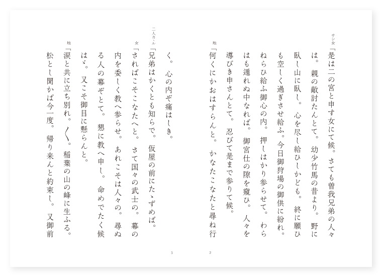 ツレ(女) 二宮 シテ 曽我十郎 ツレ 曽我五郎 ツレ 新開荒次郎 ツレ 新田四郎 地は 駿河 季は 五月 サシ女「是は二の宮と申す女にて候。さても曽我兄弟の人々は。親の敵討たんとて。幼少竹馬の昔より。野に臥し山に臥し。心を尽し給ひしかども。終に願ひも空しく過ぎさせ給ふ。今日御狩場の御供に紛れ。ねらひ給ふ御心の内。押しはかり参らせて。わらはも遁れぬ中なれば。御宮仕の隙を窺ひ。人々を導びき申さんとて。忍びて是まで参りて候。 地「何くにかおはすらんと。かなたこなたと尋ね行く。心の内ぞ痛はしき。 二人カヽル「兄弟はかくとも知らで。仮屋の前にたゝずめば。 女「さればこそこなたへと。さて国々の武士の。幕の内を委しく教へ参らせ。あれこそは人々の。尋ぬる人の幕ぞとて。懇に教へ申し。命めでたく候はゞ。又こそ御目に懸らんと。 地「涙と共に立ち別れ。〳〵。稲葉の山の峰に生ふる。松とし聞かば今一度。帰り来んと約束し。又御前へぞ出でにける。〳〵。 十郎詞「かくて兄弟の人々は。二の宮の教により。祐経が仮屋に忍び入り。 地「年月の妄執。今宵こそ晴し給へ時致とて。思ふ敵を討つたりけり。 五郎詞「其時々致立ち帰り。如何にや祐経たしかに聞け。箱根山にて我に得させし此太刀。只今返すぞ受け取れとて。心もとに差し当て。踊り上つて打ちければ。果報いみじき祐経も。二つになりてぞ失せにける。 地「宿直の人々あわて騒ぎ。〳〵。すはや夜討は曽我兄弟ぞ。起き合へやつといふ声に。弓よ長刀太刀よ刀と。前後を失ひ。上を下へと返しける。 地「されども御前の人々は。〳〵。我も〳〵と切つて出で。面も振らず懸りければ。本よりも兄弟は。命も惜しまず切つて出で。兄弟が手に掛けて。やにはに三騎討ちけるを。すかさず追つ詰め懸りければ。今は命限りの切死と。仁王立に立ち並べば。御前の武士は合ひかねて。其間遥に引いたりけり。 新開「かゝりける処に。新開と名乗つて。 地「祐成に討つてかゝりければ。得たりやあふとさん〴〵に。畳みかけられ叶はじと思ひけん。小柴垣を押し破つて。後這しつゝ遁れ入りければ。時致は遁さじと。御前をも憚らず。逃げ行く敵を目に懸けて。跡を慕うて追うて行く。(中入) 新田詞「然る処に新田の四郎忠綱は。君の仰せに随ひ。仮屋の前後を警固して居たりしが。見れば十郎祐成。血刀振つてまつしぐろに打ち入りけるを。 地「留めんと思ひ打ち合ひけるが。無慙や祐成は。宵より疲れし事なれば。新手に責め立てられ。受太刀に為つて弱り行くを。畳みかけて打ち伏せつゝ。太刀押し拭ひ鞘にさし。心静に立ち帰る。 クセ「無慙なるかな祐成は。臥したる枕より。如何にや如何に忠綱。我も遁れぬ中なれば。他人の見る目恥かしや。はや〳〵討ち取り。後の世弔ひてたび給へ。時致はかくとも。知らで便や失はん。死出の山。三途の川も一所にと。誓ひし事も徒に。早是までぞ首打てや。南無阿弥陀仏と合掌す。 キリ地「移れば変はる世の習ひ。今日此頃も膝を組み。互に隔てぬ中なれど。武士のはかなさよ。切らで叶はぬ輪廻のきづな。南無阿弥陀仏と。首打ち落し取り持ちて。御所へとてこそ参りけれ。〳〵。 底本:国立国会図書館デジタルコレクション『謡曲評釈 第八輯』大和田建樹 著