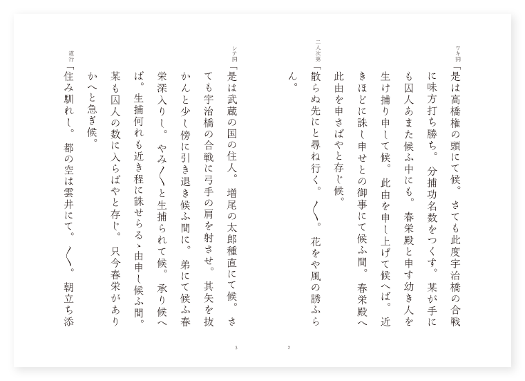 世阿弥作 ワキ 高橋権頭 シテ 増尾種直 トモ 小太郎 狂言 高橋従者 子方 増尾春栄丸 地は 伊豆 季は 雑 ワキ詞「是は高橋権の頭にて候。さても此度宇治橋の合戦に味方打ち勝ち。分捕功名数をつくす。某が手にも囚人あまた候ふ中にも。春栄殿と申す幼き人を生け捕り申して候。此由を申し上げて候へば。近きほどに誅し申せとの御事にて候ふ間。春栄殿へ此由を申さばやと存じ候。 二人次第「散らぬ先にと尋ね行く。〳〵。花をや風の誘ふらん。 シテ詞「是は武蔵の国の住人。増尾の太郎種直にて候。さても宇治橋の合戦に弓手の肩を射させ。其矢を抜かんと少し傍に引き退き候ふ間に。弟にて候ふ春栄深入りし。やみ〳〵と生捕られて候。承り候へば。生捕何れも近き程に誅せらるゝ由申し候ふ間。某も囚人の数に入らばやと存じ。只今春栄がありかへと急ぎ候。 道行「住み馴れし。都の空は雲井にて。〳〵。朝立ち添ふる旅衣。日も重なりて行く程に。名にのみ聞きし伊豆の国府。三島の里に着きにけり。〳〵。 シテ詞「急ぎ候ふほどに。伊豆の三島に着きて候。此処にて囚人の奉行をば。高橋とやらん申し候。尋ねて対面申したきよし申し候へ。 トモ詞「畏つて候。如何に案内申し候。囚人奉行高橋殿と申すは何くに御坐候ふぞ。 狂言「何の御用にて候ふぞ。頼みたる人の事にて候。 トモ「いや苦しからぬ者にて候。是は春栄殿のゆかりの者にて候。高橋殿へそと御目にかゝりたき事の候ひて是まで参りて候。其由をよく〳〵御心得あつて御申し候へ。 狂言「心得申し候。囚人のゆかりの人は堅く禁制にて候へども。春栄殿の御事は頼み候ふ人別して痛はり申され候ふ間。其由を申して見候ふべし。暫く御待ち候へ。 トモ「心得申し候。 狂言「如何に申し候。春栄殿のゆかりと申して若き男の来り候ひて。御目にかゝりたきよし申し候ふ間。かたく御禁制にて候へども。春栄殿の御事にて候ふ間申し入れて見うずる由申して候。 ワキ詞「何と春栄殿のゆかりの人と申して。某に対面ありたき由申すか。汝も知る如く。囚人のゆかりに対面は禁制にて候へども。春栄殿の御事は別して痛はり申し候ふ間。そと対面申さうずるにて候。さりながら大法の事にて候ふ間。太刀刀をあづかり候へ。 狂言「畏つて候。いかに申し候。只今の通りを申して候へば。かたく禁制にて候へども。春栄殿のゆかりの御事にて候ふほどに。そと御目にかゝらうずると申され候。さらば太刀かたなを給はり候へ。 トモ「心得申し候。尋ね申して候へば。春栄殿のゆかりならば。高橋別して痛はり申し候ふ間。対面申さうずる由申され候。さりながら大法にて候ふ程に。太刀かたな禁制の由申し候。 シテ「さらば太刀刀を参らせ候ふべし。 ワキ「春栄殿のゆかりと仰せ候ふはいづくに渡り候ふぞ。 シテ「さん候是に候。 ワキ「是は春栄殿の為めには何にて渡り候ふぞ。 シテ「是は春栄が兄に。増尾の太郎種直と申す者にて候ふが。今度宇治橋の合戦に弓手の肩を射させ。其矢をぬかんと少し傍に引き退き候ふ間に。弟にて候ふ春栄深入し生け捕られて候ふ間。余りに見捨て難く候へば。某も一所に誅せられん為めに遥々是まで参りて候。春栄に引き合はせられて賜はり候へ。 ワキ「委細承り候。是までの御出で誠にゆゝしく候。やがて其由を春栄殿へ申し候ふべし。暫く御待ち候へ。 シテ「心得申し候。 ワキ詞「いかに春栄殿へ申し候。御身の御舎兄に。増尾の太郎種直と御名のり在つて。是まで御出でにて候。急いで御対面候へ。 春栄詞「是は誠しからず候。兄にて候ふ者は。宇治橋の合戦にて重手おひ。存命不定とこそ承り候ひつれ。 ワキ「あら不思議や。正しく御舎兄と仰せ候ふ物を。さりながら物の隙よりそと御覧候へ。 春栄「不思議なる事にて候。譜代召し使ひ候ふ家人にて候ふ間。急ぎ追つ帰して賜はり候へ。 ワキ「さては誠に家人にて候ふか。さあらばやがて追つ帰し候ふべし。如何に以前の人の渡り候ふか。 シテ「是に候。 ワキ「仰せの通りを申して候へば。物の隙より御覧候ひて。兄にてはなし。譜代召しつかはるゝ家人なれば。急ぎ追つ帰し申せとの御事にて候。何とて聊爾なる事をば承り候ふぞ。 シテ「暫く。まづ御心を静めて聞し召され候へ。家人の身として兄と名のり。一所に誅せらるゝ事の候ふべきか。如何やうにも御沙汰候ひて。引き合はせられて賜はり候へ。某対面して。家人か兄かの勝劣を見せ申し候ふべし。 ワキ「実に実に是は尤にて候。さらば某たばかつて呼び出だし候ふべし。其時御袖にすがられて委しく仰せ候へ。 シテ「心得申し候。さらば是に待ち申し候ふべし。 ワキ詞「如何に春栄殿に申し候。只今かの者をばあら〳〵と申し追つ帰して候ふさりながら。彼者の心中あまりに不便に候ふ間。うしろ姿をそと御覧候へ。此方へ渡り候へ。 シテ詞「如何に春栄。何とて某をば家人とは申すぞ。さても此度宇治橋の合戦に弓手の肩を射させ。其矢をぬかんと少し傍に引き退き候ふ隙に。御身は深
