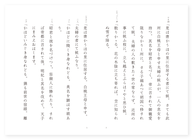 禅竹作 前 ワキ 里人 シテ(父) 白桃 ツレ(母) 王母 後 ツレ 王昭君 シテ 単于 地は 唐土 季は 春 ワキ詞「是は唐かうほの里に住居する者にて候。さても此所に白桃王母と申す夫婦の候ふが。一人の息女を持つ。其名を昭君と名づく。帝に召されて御寵愛限りなかりし所に。さる子細あつて胡国へ移されて候。夫婦の人の歎きたゞ世の常ならず。近所の事に候ふ程に。立ち越えとぶらはゞやと思ひ候。 シテ、ツレ一声「散りかゝる。花の木陰に立ち寄れば。空に知られぬ雪ぞ降る。 シテサシ「是は唐かうほの里に住居する。白桃王母と申す。 二人「夫婦の者にて候ふなり。 ツレ「かほどに賤しき身なれども。美名を顕はす娘あり。 二人「昭君と彼を名づけつゝ。容顔人に勝れたり。されば帝都に召されて後。明妃と其名を改めて。天子にまみえおはします。 シテ「かほどいみじき身なれども。猶も前世の宿縁。離れやらざる故やらん。 二人「諸人の中に撰ばれて。胡国の民に移され。漢宮万里の外にして。見馴れぬ方の旅の空。思ひやるこそ悲しけれ。 シテ「されども供奉の官人ども。旅行の道の慰めに。絃管の数を奏しつゝ。 二人「馬上に琵琶を弾く事も。此時よりと聞く物を。 下歌地「画図にうつせる面影も。今こそ思ひ知られたれ。 上歌「彼昭君の黛は。〳〵。緑の色に匂ひしも。春や暮るらん糸柳の。思ひ乱るゝ折毎に。風もろともに立ち寄りて。木陰の塵を掃はん。〳〵。 シテ「いざ〳〵庭を清めんと。祖父は箒を携へたり。 ツレ「実にや心も昔の春。老の姿もさゝがにの。いと苦しとは思へども。風結ぶ涙の袖の玉襷。斯かる思ひも子故なり。 シテ「唯世の常の賤の男と。人もや見るらん恥かしや。 ツレ「日は山の端に入相の。 シテ「兼ねて知らする夕嵐。 ツレ「袖寒しとは思へども。 シテ「子の為なれば。 ツレ「寒からず。 二人次第「落葉の積る木陰にや。嵐も塵となりぬらん。 下歌地「落葉の積る木陰にや。〳〵。嵐も塵となりぬらん。 上歌「実に世の中に憂き事の。〳〵。心に懸かる塵の身は。掃ひもあへぬ袖の露。涙の数や積るらん。風に散り。水には浮ぶ落葉をも。暫し袖に宿さん。 下歌「涙の露の月の影。それかと見ればさもあらで。小篠の上の玉霰。音もさだかに聞えず。 シテ詞「余りに苦しう候ふ程に。休まばやと思ひ候。 ワキ詞「いかに此屋の内に白桃の渡り候ふか。 シテ「誰にて御入り候ふぞ。 ワキ「いや某が参りて候。 シテ「此方へ御出で候へ。 ワキ「如何に申し候。さても昭君の御事御心中察し申して候。 シテ「御とぶらひ有難う候。 ワキ「又申すべき事の候。此柳の木の本を立ち去らずして清め給ふは。何と申したる御事にて候ふぞ。 シテ「昭君胡国へ移されし時。此柳を植ゑ置き。我胡国にて空しくならば。此柳も枯れうずると申しつるが。御覧候へ早片枝の枯れて候。 ワキ「実に〳〵御歎き尤にて候。さて〳〵昭君は何しに胡国へは移され給ひ候ふぞ。 シテクリ「さても昭君胡国に移されし。其いにしへを尋ぬるに。 地「天下を治めし始めなり。 シテサシ「然れば胡国の軍強うして。従ふ事期し難し。 地「されば互に和睦して。其しるし一つなからんやとて。美人を一人遣はすべき。御約束の有りしに。 クセ「そも漢王の宣旨には。三千人の寵愛。何れを分くる方もなし。もろ〳〵の宮女の。紅色高位の姿を。賢聖の障子に。似せ画に是を顕はし。中に劣れる様あらば。即ち彼を撰びて。胡国の為めに遣はし。天下の運を静めんと。綸言ならせ給へば。数々の宮女たち。是を如何にと悲しみ。画かける人を語らひ。皆賂を贈りつゝ。御約束の有りし故。 シテ「されば写せる其姿。 地「何れを見るも妙にして。柳髪風にたをやかに。桃顔露を含んで。色猶深き姿なり。中にも昭君は。ならぶ方なき美人にて。帝の覚えたりしなり。それを頼める故やらん。たゞ打ち解けて有りしに。画図に写せる面影の。あまり賤しく見えしかば。さこそは寵愛。甚しゝとは申せども。君子に私の。言葉なしとや思しけん。力なくして昭君を。胡国に贈り遣はさる。 シテ詞「昔し桃葉といひし人。仙女と契浅からざりしに。仙女空しくなりて後。桃の花を鏡に写せば。即ち仙女の姿見えけるとなり。此柳もさながら昭君の姿。いざさせ給へ鏡に写して影を見ん。 ツレ「それは仙女の姿なり。いかで是には喩ふべき。 シテ「いやそれのみならず鏡には。恋しき人の写るなり。 ツレ「夢の姿を写しゝは。 シテ「しんやうが持ちし増鏡。 ツレ「故郷を鏡に写しゝは。 シテ「とけつといひし旅人なり。 ツレ「それは昔に年を経て。 シテ「花の鏡となる水は。 地「散りかゝる花や曇るらん。思はいとゞ増鏡。若も姿を見るやと。鏡に向つて泣き居たり。〳〵。(中入) 昭君「是は胡国に移されし。王昭君の幽霊なり。さても父母別れを悲しみ。春の柳の木の本に。泣き悲しみ給ふ痛はしさよ。急ぎ鏡に影を写し。父母に姿を見え申さん。春の夜の。朧月夜に顕はれて。 地「曇りながらも影見えん。 