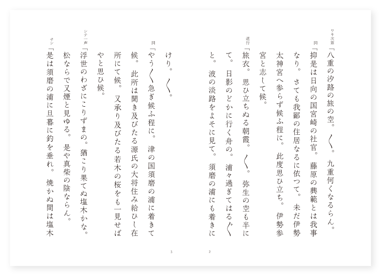 世阿弥作 前 ワキ 藤原興範 シテ 樵の翁 後 ワキ 前に同じ シテ 光源氏 地は 摂津 季は 三月 ワキ次第「八重の汐路の旅の空。〳〵。九重何くなるらん。 詞「抑是は日向の国宮崎の社官。藤原の興範とは我事なり。さても我鄙の住居なるに依つて。未だ伊勢太神宮へ参らず候ふ程に。此度思ひ立ち。伊勢参宮と志して候。 道行「旅衣。思ひ立ちぬる朝霞。〳〵。弥生の空も半にて。日影のどかに行く舟の。浦々過ぎてはる〴〵と。波の淡路をよそに見て。須磨の浦にも着きにけり。〳〵。 詞「やう〳〵急ぎ候ふ程に。津の国須磨の浦に着きて候。此所は聞き及びたる源氏の大将住み給ひし在所にて候。又承り及びたる若木の桜をも一見せばやと思ひ候。 シテ一声「浮世のわざにこりずまの。猶こり果てぬ塩木かな。松ならで又煙と見ゆる。是や真柴の陰ならん。 サシ「是は須磨の浦に旦暮に釣を垂れ。焼かぬ間は塩木を運び。浮世を渡る者にて候ふなり。 詞「又此須磨の山陰に一木の花の候。名におふ若木の桜なるべし。古へ光る源氏の御旧跡も。此所にて有りげに候。 下歌「我等賤しき身なれども。有りし雨夜の物語。 上歌「聞くにも袖をうるほして。〳〵。山の薪の重きにも。思ひ樒を折りそへて。彼古墳ぞとゆふ花の。手向の梢折々に。心を運ぶばかりなり。 詞「暫く柴を下し花をも詠めばやと思ひ候。 ワキ詞「いかに是なる翁に尋ぬべき事の候。 シテ詞「何事にて候ふぞ。 ワキ「其身は賤しき山賤なれども。此花に詠め入り家路を忘れたる気色なり。若し此花は故ある木にて候ふか。 シテ「賤しき山賤と承り候へども。恐れながらそなたをこそ鄙人とは見奉りて候へ。さすがに須磨の若木の桜を。名木かとの御尋ねは。事新らしうこそ候へとよ。 ワキ「げに〳〵須磨の山桜。名におふ若木の花ぞとて。はる〴〵こゝに分け入りて。 シテ「わざと詠めの御心ざし。 ワキ「日もはや暮れて須磨の浦の。 シテ「さらば里にもお泊りなくて。 ワキ「野を分け山に。 シテ「来り給ふは。 地「関よりも。花にとまるか須磨の浦。〳〵。近き後の山里の。柴と云ふ物まで。名をとり〴〵のわざなるに。只心なき住居とて。人な賤しめ給ひそよ。人な賤しめ給ひそ。 ワキ詞「いかに翁。古へ此所は光る源氏の御旧跡。ことに御事は年ふりたる者なれば。源氏の御事物語り候へ。 地クリ「忘れて過ぎし古へを。語らば袂やしをれなん。我空蟬の空しき世を案ずるに。桐壺の夕べの煙。絶えぬ思ひの涙をそへ。 サシ「いとゞしく虫の音しげき浅芽生の。 地「露けき宿に明け暮らし。小萩が本のさびしさまで。はごくみ給ひし御恵み。いとも畏き勅により。十二にて初冠。高麗国の相人の。附けたりし始めより。光る源氏と名を呼ばる。箒木の巻に中将。紅葉の賀の巻に。正三位に叙せられ。花の宴の春の夜の。行方も知らで入る月の。おぼろけならぬ契り故。年廿五と申せしに。津の国須磨の浦。海士人の歎きを身に積みて。つぎの春。播磨の明石の浦づたひ。問はず語りの夢をさへ。現に語る人もなし。去る程に。天下に奇特の告有りしかば。又都にめしかへされ。数の外の官を経て。 シテ「其後うちつゞき。 地「澪標に内大臣。乙女の巻に太政大臣。藤の裏葉に太上天皇。かく楽しみを極めて。光る君とは申すなり。 ロンギ地「さてや源氏の旧跡の。分きて何くの程やらん。委しく教へ給へや。 シテ「何くとも。いさ白波のこゝもとは。皆其あとゝ夕暮の。月の夜を待ち給ふべし。もしや奇特を御覧ぜん。 地「そもや奇特を見んぞとは。何をか待たん月影の。 シテ「光る源氏の御住家。 地「昔は須磨。 シテ「今は都卒の。 地「天に住み給へば。月宮の影に天くだり。此海に影向有るべし。かやうに申す翁も。其品々の物語。源氏の巻の名なれや。雲隠れしてぞ失せにける。雲隠れして失せにけり。(中入) ワキ詞「さては源氏の大将かりに人間と現じ。我に言葉をかはし給ふか。いざや今宵はこゝに居て。猶も奇特を拝まんと。 歌「須磨の浦。野山の月に旅寐して。〳〵。心をすます磯枕。波にたぐへて音楽の。聞ゆる声ぞ有難き。〳〵。 後ジテ「あら面白の海原やな。我娑婆に有りし時は。光る源氏といはれ。今は都卒にかへり。天上の住居なれども。月に詠じて閻浮にくだり。所も須磨の浦なれば。青海波の遊舞楽に。引かれて月の夜汐の波。かへすなる。波の花ちる白衣の袖。 地「玉の笛の音声澄みわたる。 シテ「笙笛琴箜篌孤雲のひゞき。 地「天もうつるや須磨の浦の。荒海の波風しん〳〵たり。 ロンギ地「雲となり雨となり。夢現とも分かざるに。天より光りさす。御影の内にあらたなる。童男来り給ふぞや。さては名にしおふ。光る源氏の尊霊か。 シテ「其名もよそに白浪の。こゝもとは我住家。猶も他生を助けんと。都卒天より。二度こゝに天くだる。 地「あら有難の御事や。所は須磨の浦なれば。 シテ「四方の嵐も吹き落ちて。 地「薄雲かゝる。 シテ「春の空。 地「ぼんじやくしわうの人天に。下り給ふかと