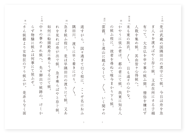 結崎十郎作 世阿弥作とも ワキ 渡守 ワキヅレ(男) 旅人 シテ 母(狂女) 子方 梅若丸亡霊 地は 武蔵 季は 三月 ワキ詞「是は武蔵の国隅田川の渡守にて候。今日は舟を急ぎ人々を渡さばやと存じ候。又此在所にさる子細有つて。大念仏を申す事の候ふ間。僧俗を嫌はず人数を集め候。其由皆々心得候へ。 男次第「末も東の旅衣。〳〵。日も遥々の心かな。 詞「かやうに侯ふ者は。都の者にて候。我東に知る人の候ふ程に。彼者を尋ねて唯今まかり下り候。 道行「雲霞。あと遠山に越えなして。〳〵。いく関々の道すがら。国々過ぎて行く程に。こゝぞ名におふ隅田川。渡りに早く着きにけり。〳〵。 詞「急ぎ候ふ程に。是は早隅田川の渡りにて候。又あれを見れば舟が出で候。急ぎ乗らばやと存じ候。如何に船頭殿舟に乗らうずるにて候。 ワキ詞「中々の事めされ候へ。先々御出で候跡の。けしからず物騒に候ふは何事にて侯ふぞ。 男「さん候都より女物狂の下り候ふが。是非もなく面白う狂ひ候ふを見候ふよ。 ワキ「さやうに候はゞ。暫く舟をとゞめて。彼物狂を待たうずるにて候ふ。 シテサシ「実にや人の親の心は闇にあらねども。子を思ふ道に迷ふとは。今こそ思ひ白雪の。道行人に言づてゝ。行方を何と尋ぬらん。聞くや如何に。上の空なる風だにも。 地「松に音する習ひあり。 シテ「真葛が原の露の世に。 地「身を恨みてや明け暮れん。 シテ「是は都北白河に。年経て住める女なるが。思はざる外に独子を。人商人に誘はれて。行方を聞けば逢坂の。関の東の国遠き。東とかやに下りぬと。聞くより心乱れつゝ。そなたとばかり思子の。跡を尋ねて迷ふなり。 下歌地「千里を行くも親心。子を忘れぬと聞く物を。 上歌「もとよりも。契り仮なる一つ世の。〳〵。其内をだに添ひもせで。こゝやかしこに親と子の。四鳥の別れ是なれや。尋ぬる心の果やらん。武蔵の国と。下総の中にある。隅田川にも着きにけり。〳〵。 シテ詞「なふ〳〵我をも舟に乗せて賜はり候へ。 ワキ詞「お事は何くより何方へ下る人ぞ。 シテ「是は都より人を尋ねて下る者にて候。 ワキ「都の人といひ狂人といひ。面白う狂うて見せ候へ。狂はずは此舟には乗せまじいぞとよ。 シテ「うたてやな隅田川の渡守ならば。日も暮れぬ舟に乗れとこそ承るべけれ。かたの如くも都の者を。舟に乗るなと承るは。隅田川の渡守とも。覚えぬ事な宣ひそよ。 ワキ詞「実に〳〵都の人とて。名にし負ひたる優しさよ。 シテ「なふ其詞はこなたも耳に留るものを。彼業平も此渡りにて。名にしおはゞ。いざ事問はん都鳥。我思ふ人は有りやなしやと。なふ舟人。あれに白き鳥の見たるは。都にては見馴れぬ鳥なり。あれをば何と申し候ふぞ。 ワキ「あれこそ沖の鷗候ふよ。 シテ「うたてやな浦にては千鳥とも云へ鷗とも云へ。など此隅田川にて白き鳥をば。都鳥とは答へ給はぬ。 ワキ「実に〳〵誤り申したり。名所には住めども心なくて。都鳥とは答へ申さで。 シテ「沖の鷗と夕波の。 ワキ「昔にかへる業平も。 シテ「有りや無しやと事問ひしも。 ワキ「都の人を思妻。 シテ「わらはも東に思子の。ゆくへを問ふは同じ心の。 ワキ「妻を忍び。 シテ「子を尋ぬるも。 ワキ「思ひは同じ。 シテ「恋路なれば。 地「我も又。いざ事とはん都鳥。〳〵。我思子は東路に。有りやなしやと問へども〳〵。答へぬはうたて都鳥。鄙の鳥とやいひてまし。実にや舟ぎほふ。堀江の川のみなぎはに。来居つゝ鳴くは都鳥。それは難波江これは又。隅田川の東まで。思へば限りなく。遠くも来ぬる物かな。さりとては渡守。舟こぞりて狭くとも。乗せさせ給へ渡守。さりとては乗せてたび給へ。 ワキ詞「かゝるやさしき狂女こそ候はね。急いで舟に乗り候へ。此渡りは大事の渡りにて候。かまひて静に召され候へ。 男詞「なふあの向ひの柳の本に。人の多く集まりて候ふは何事にて候ふぞ。 ワキ詞「さん候ふあれは大念仏にて候。それにつきてあはれなる物語の候。此舟の向ひへ着き候はん程に語つて聞かせ申さうずるにて候。さても去年三月十五日。しかも今日に相当つて候。人商人の都より。年の程十二三ばかりなる幼き者を買ひとつて奥へ下り候ふが。此幼き者。いまだ習はぬ旅の疲れにや。以ての外に違例し。今は一足も引かれずとて。此河岸にひれふし候ふを。なんぼう世には情なき者の候ふぞ。此幼き者をば其まゝ路次に捨てゝ。商人は奥へ下つて候。さる間此辺の人々。此幼き者の姿を見候ふに。よし有りげに見え候ふ程に。さま〴〵に痛はりて候へども。前世の事にてもや候ひけん。たんだ弱りに弱り。既に末期と見えし時。お事はいづく如何なる人ぞと。父の名字をも国をも尋ねて候へば。我は都北白河に。吉田の何某と申しゝ人の唯ひとり子にて候ふが。父には後れ母ばかりに添ひ参らせ候ひしを。人商人にかどはされて。かやうになり行き候。都の人の足手影もなつかしう候へば。此道の辺りに築き籠めて。しるしに柳を植ゑて賜はれとおとなし