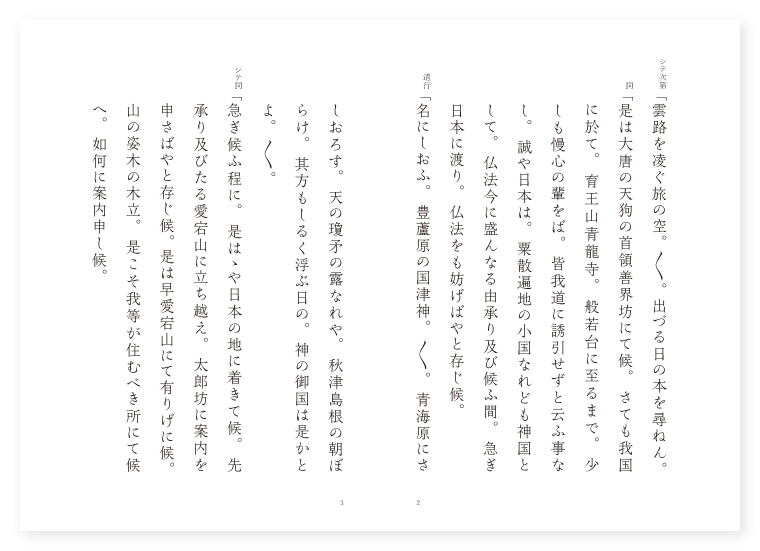 竹田法印作 シテ 善界坊 ツレ 太郎坊 ワキ 叡山の僧 地は 山城 季は 雑 シテ次第「雲路を凌ぐ旅の空。〳〵。出づる日の本を尋ねん。 詞「是は大唐の天狗の首領善界坊にて候。さても我国に於て。育王山青龍寺。般若台に至るまで。少しも慢心の輩をば。皆我道に誘引せずと云ふ事なし。誠や日本は。粟散遍地の小国なれども神国として。仏法今に盛んなる由承り及び候ふ間。急ぎ日本に渡り。仏法をも妨げばやと存じ候。 道行「名にしおふ。豊蘆原の国津神。〳〵。青海原にさしおろす。天の瓊矛の露なれや。秋津島根の朝ぼらけ。其方もしるく浮ぶ日の。神の御国は是かとよ。〳〵。 シテ詞「急ぎ候ふ程に。是はゝや日本の地に着きて候。先承り及びたる愛宕山に立ち越え。太郎坊に案内を申さばやと存じ候。是は早愛宕山にて有りげに候。山の姿木の木立。是こそ我等が住むべき所にて候へ。如何に案内申し候。 ツレ詞「誰にて渡り候ふぞ。 シテ「是は大唐の天狗の首領善界坊にて候ふが。御目にかかり申し談ずべき子細の候ひて。是まで遥々参りて候。 ツレ「さては承り及びたる善界坊にて渡り候ふか。先某が菴室へ御入り候へ。さて唯今は何の為めに御出でにて候ふぞ。 シテ「さん候唯今参る事余の儀にあらず。我国に於て。育王山青龍寺。般若台に至るまで。少しも慢心の輩をば。皆我道に誘引せずと云ふ事なし。誠や日本は。小国なれども神国として。仏法今に盛なる由承り候ふ間。少し心にかゝり。遥々是まで参りて候。同じくは御心を一つにして。自他の本意を達し給へ。 ツレ「さてはやさしくも思し召し立ち候ふ物かな。夫れ我国は天地開闢より此方。先以て神国たり。されば仏法今に盛なり。先々間近き比叡山。あれこそ日本の天台山候ふよ。心のまゝに窺ひ給へ。 シテ「さてはいよ〳〵便あり。夫れ天台の仏法は。権実二教に分ち。 ツレ「又密宗の奥義を伝へ。 シテ「顕密兼学の所なるを。 ツレ「我等如きの類として。 シテ「たやすく窺ひ。 ツレ「給はん事。 地「蟷螂が斧とかや。猿猴が月に相同じ。かくは知れどもさすが猶。我慢増上慢心の。便を得んと思ふにも。大聖の威力を。いよ〳〵案じ連ねたり。 地クリ「夫れ明王の誓約。まち〳〵なりと云へども。其利益余尊に越え。正しく火生三昧に入り給ひて。一切の魔軍を焚焼せり。 シテサシ「外には忿怒の相を現ずといへども。 地「内心慈悲の御恵。凝念不動の理を顕はし。但住衆生心想之中。実に有難き悲願かな。 クセ「然りとはいへども。輪廻の道を去りやらで。魔境に沈む其歎き。思ひ知らずや我ながら。過去遠々の間に。さすが見仏聞法の。其結縁の功により。三悪道を出でながら。猶も鬼畜の身を借りて。いとゞ仏敵。法敵となれる悲しさよ。今此事を歎かずは。未来永々を経るとても。いつか般若の智水を得て。火生三昧の。焰を遁れ果つべき。 シテ「世の中は夢か現か現とも。 地「夢ともいさや白雲の。斯かる迷ひを翻へし。帰服せんとは思はずして。いよ〳〵我慢の旗矛の。靡きもやらで徒に。行者の床を窺ひて。降魔の利剣を。待つこそはかなかりけれ。 ロンギツレ「かくては時刻移りなん。いざ諸共に立ち出でゝ。比叡の山辺の案内せん。 シテ「法の為め。今ぞ愛宕の山の名に。頼みを懸けて思ひ立つ。雲の桟うち渡り。 地「我名やよそに高雄山。東を見れば大比叡や。 シテ「横川の杉の梢より。 地「南に続く如意が嶽。鷲の御山の雲や霞も。嵐と共に失せにけり。〳〵。(中入) ワキ一声「勅を受け。我立つ杣を出でながら。急ぐも同じ名に高き。大内山の道ならん。 ワキ「かくてやう〳〵大比叡を。下りつつ行けば不思議やな。あれに見えたる下り松の。 地「梢の嵐吹きしをり。〳〵。雲となり雨となる。山河草木震動し。天に輝く稲光。大地に響く雷は。肝魂を暗まかす。こはそも何の故やらん。〳〵。 後ジテ「そも〳〵是は。大唐の天狗の首領。善界坊とは我事なり。あら物々しや如何に御坊。今更何の観念をか為せる。夫れ若作障碍。即有一仏魔境と説けり。あら痛はしや。欲界の内に生るゝ輩は。 地「悟の道や其まゝに。魔道の街となりぬらん。 地「不思議や雲の内よりも。〳〵。邪法を唱ふる声すなり。本より魔仏一如にして。凡聖不二なり。自性清浄天然動きなき。是を不動と名づけたり。 ワキ「聴我説者得大智恵吽多羅吒干満。 地「その時御声の下よりも。〳〵。明王現はれ出で給へば。矜迦羅制多伽十二天。各降魔の力を合はせて。御先を払つておはします。 シテ「明王諸天はさて置きぬ。 地「明王諸天はさて置きぬ。東風吹く風に東を見れば。 シテ「山王権現。 地「南に男山。西に松の尾。北野や加茂の。山風神風吹き払へば。さしもに飛行の翅も地に落ち。力も槻弓の八州の波の。立ち去ると見えしが又飛び来り。さるにても。かほどに妙なる仏力神力。今より後は来るまじと。云ふ声ばかりは虚空に残り。言ふ声ばかり虚空に残つて。姿は雲路に入りにけり。 底本:国立国会図書館デジタ